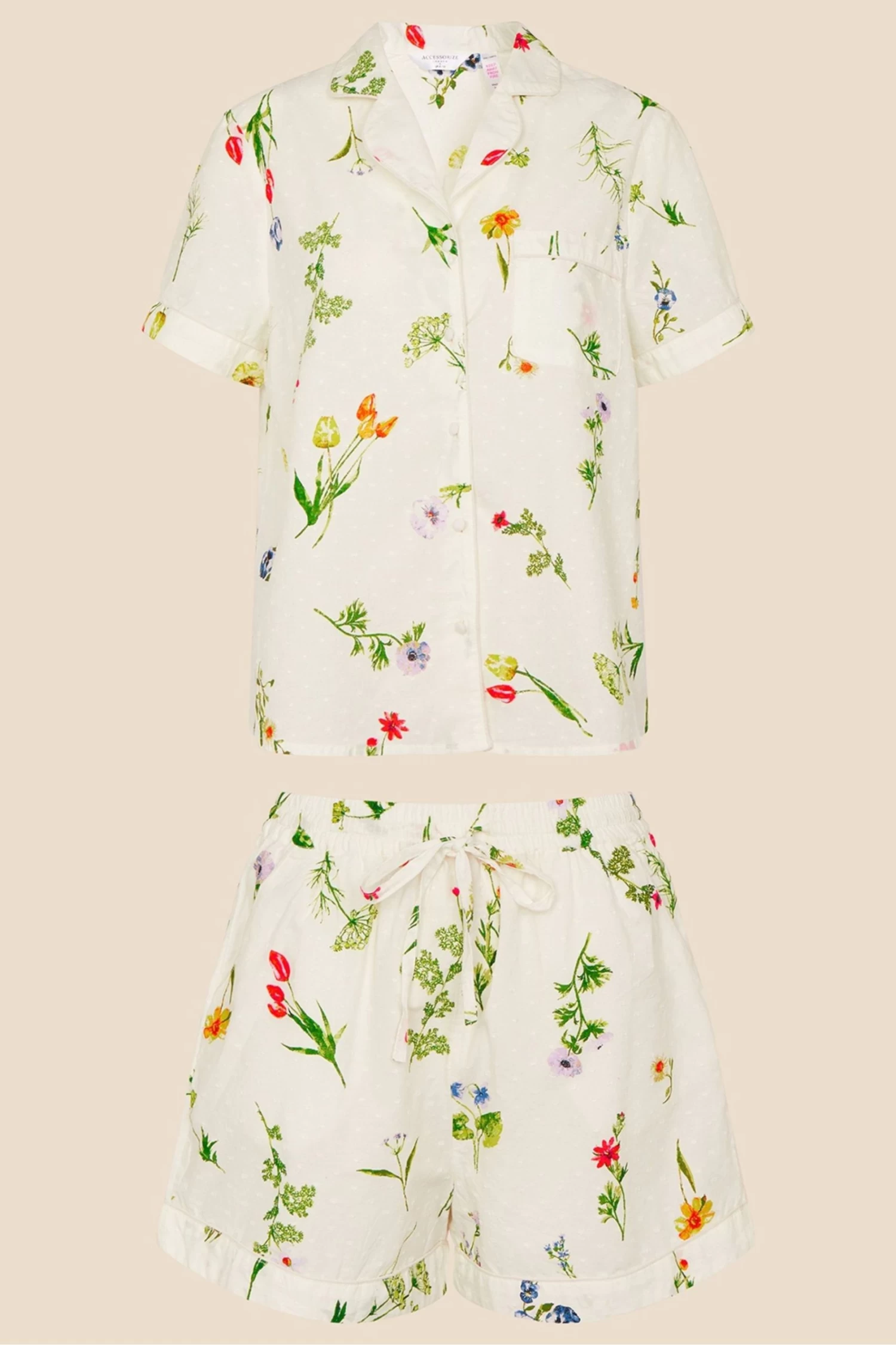 Spun in soft and breezy cotton, this pyjama set will see you through summer slumbers and morning coffees in the garden. Designed with a colourful floral print on an ivory backdrop, the top features a button-through fastening, whilst the shorts boast a comfortable drawstring waistline.