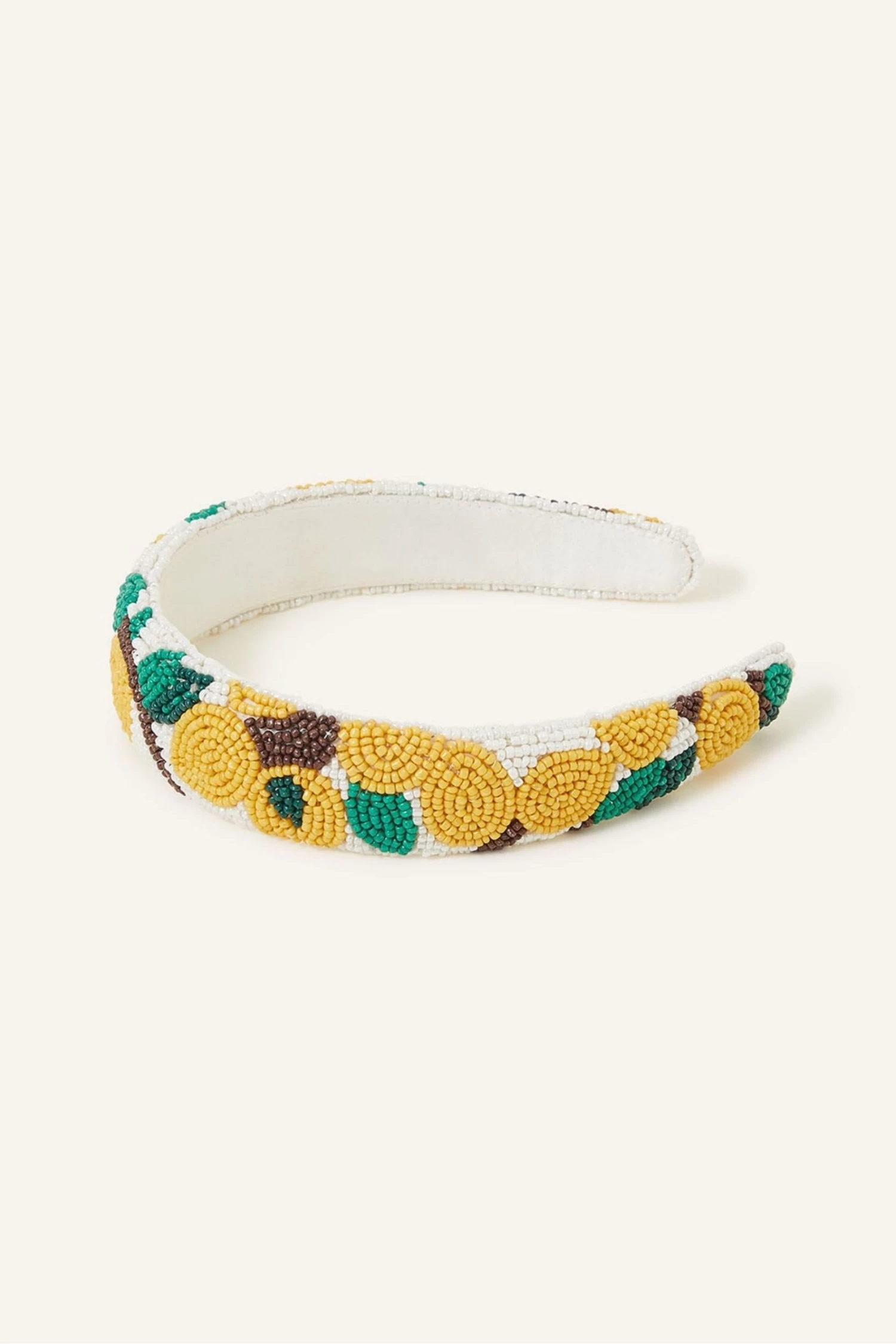 Tired of slicking back your hair every day? With a simple touch of a headband, take locks-left-down to a whole new level with this headband accessory. Designed with plenty of detail, it combines intricate embroidery with teeny bead embellishments in a zesty lemon design.