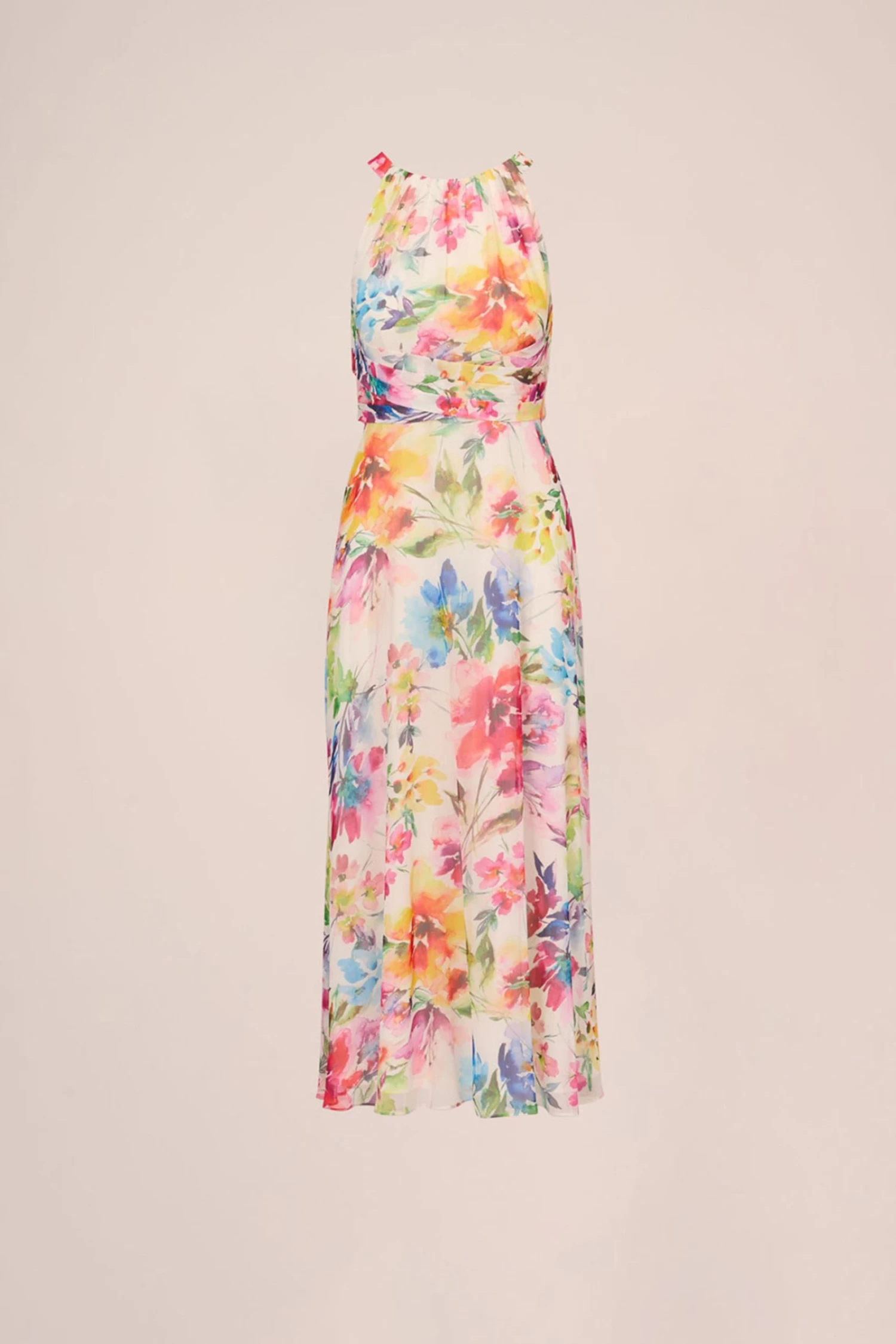 Bring the sunshine in this sweet chiffon dress. This midi dress features a cutaway halter bodice with pleated details at the neck, a pleated waist with self-tie back, and a tea-length flared skirt. Crafted with bright floral printed chiffon fabric, this fit and flare dress is a playful look. Styled with nude heels and bright or metallic accessories, this dress will have all eyes on you.