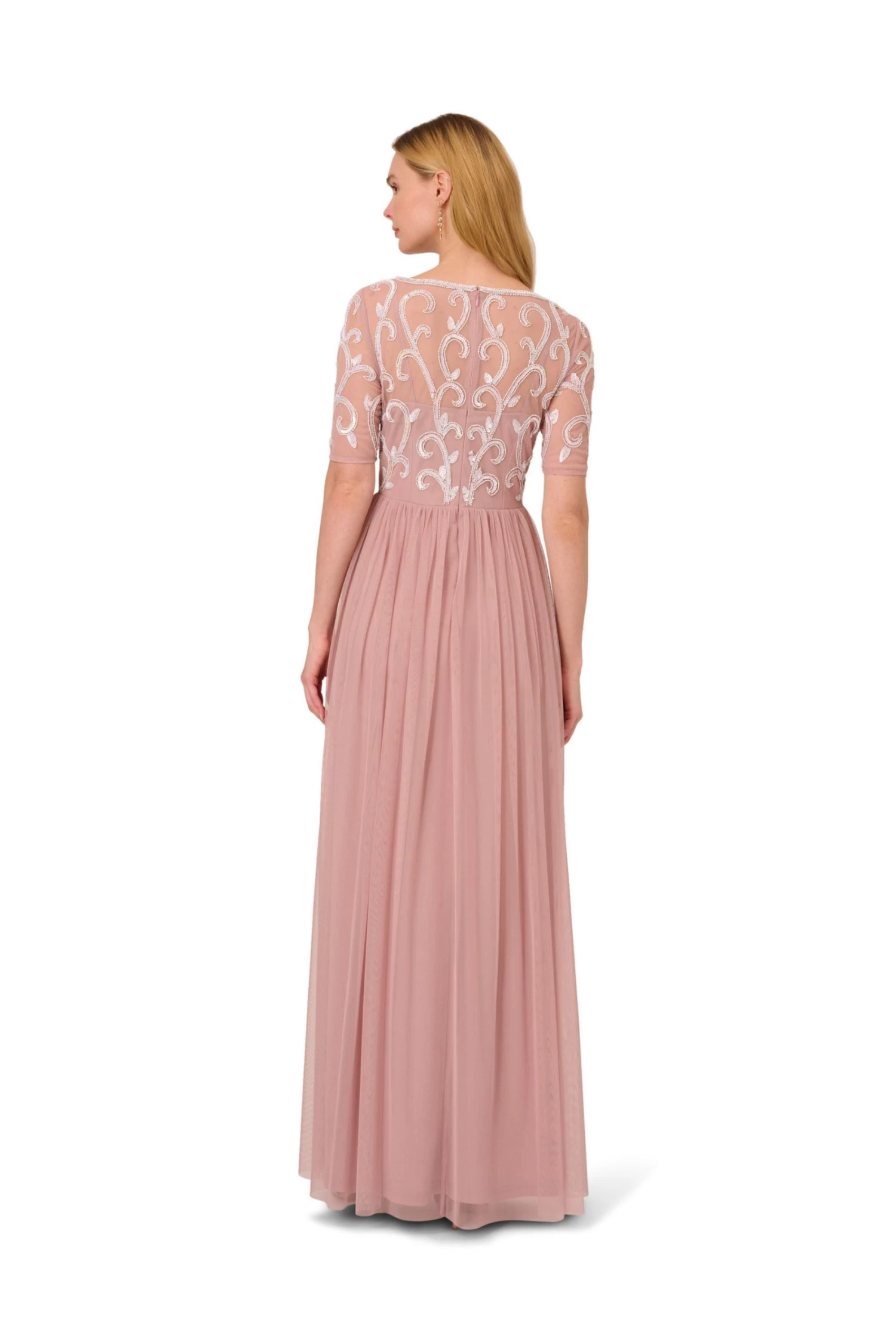 Understated and graceful, this maxi gown from Adrianna Papell will shine at any black-tie events or formal occasions. The short sleeve mesh top design with intricate beading adds a luxurious finish, along with the soft, fully flared mesh skirt. Add statement jewellery to complete your look. AP2E209605.