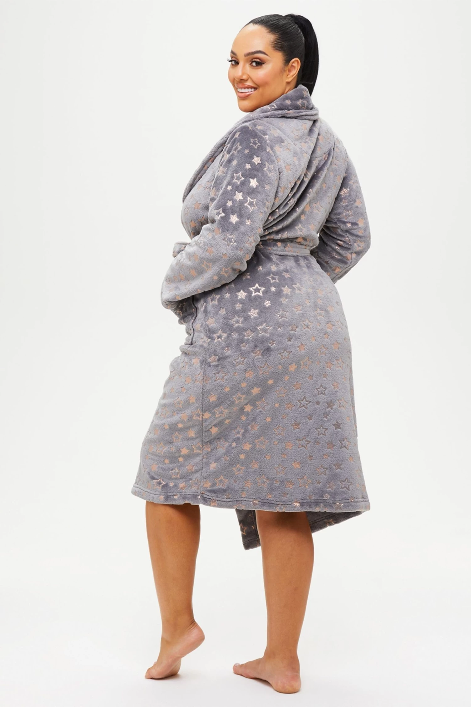 Snuggle up amongst the stars with the Sparkle Star robe. Made from fluffy fleece, the all-over sparkly foil star pattern wraps you in cosiness. With front pockets and a tie waist, this midi-length dressing gown is ideal to throw over your favourite Ann Summers nightwear.