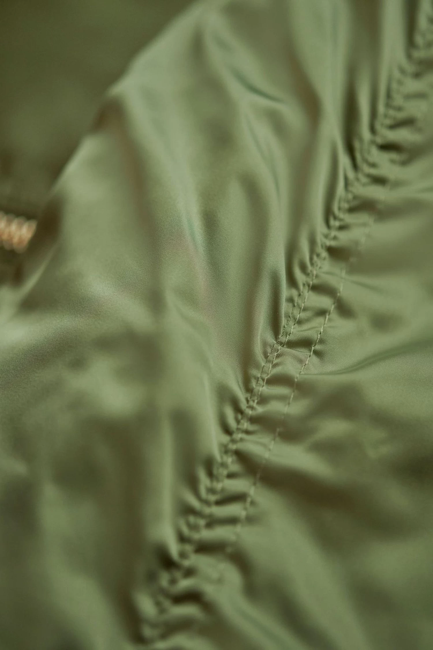 This bomber jacket is a must have piece for your wardrobe this season. This ribbed collar jacket is the perfect thrown on style for a easy causal look. It has a ruched sleeve for extra detail, high shine poppers and zipper and a ribbed collar and cuff. Pair this style back with our skinny jeans and a knitted top for that effortless look or layer over a dress for that cool silhouette – this is a style you can keep in your wardrobe year after year.