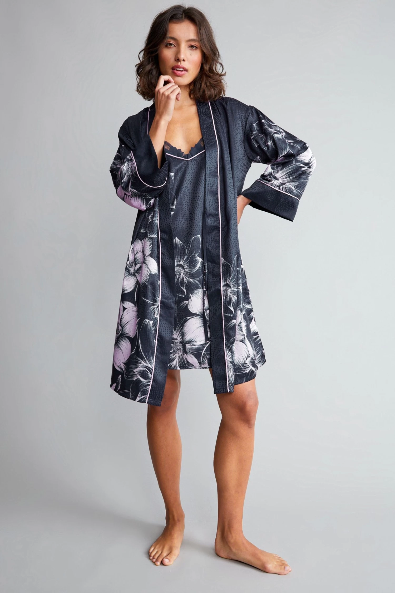 Dressing gown. Jacquard spot satin fabric. Branded hardware. Open front style. Self-fabric waist tie detail. Long sleeves.