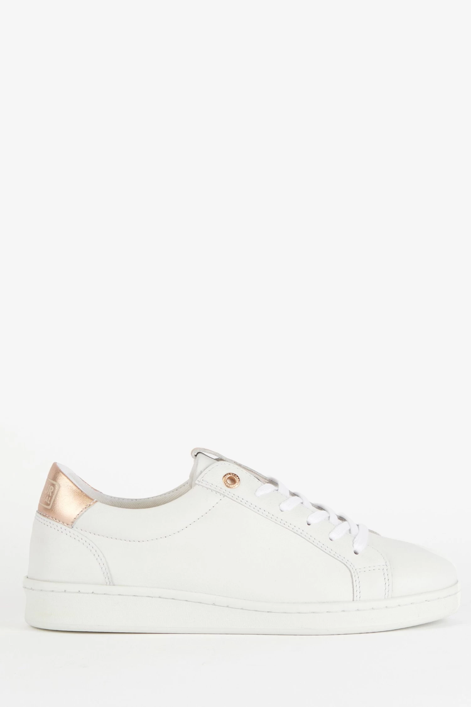 A contemporary sneaker set on a sleek cupsole, features contrast metallic leather branding details.