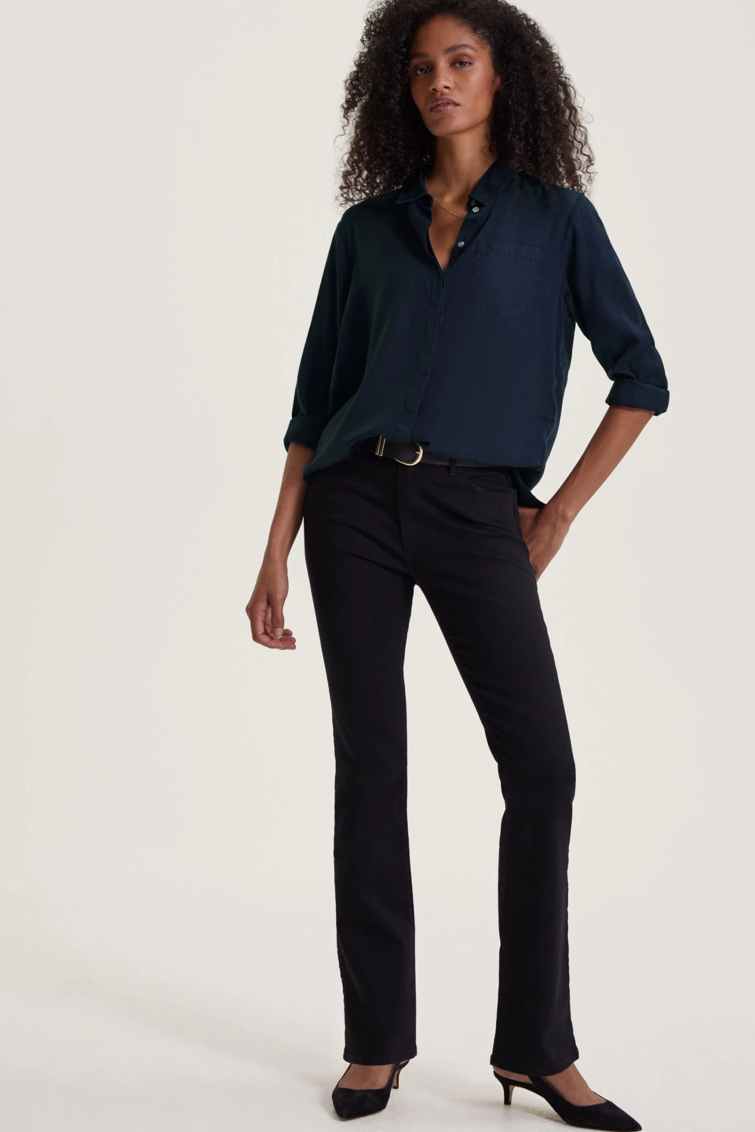 Designed to be worn with heels, this flattering Bootcut style comes in a black wash which means you can dress them up with printed blouses and strappy sandals for evenings out. Hugely flattering, they hug the waist and hips and flare out for a leg-lengthening silhouette. Made from premium organic cotton, we’ve added stretch for comfort. Crafted in premium organic cotton, flared leg shape, longer length to style with heels.