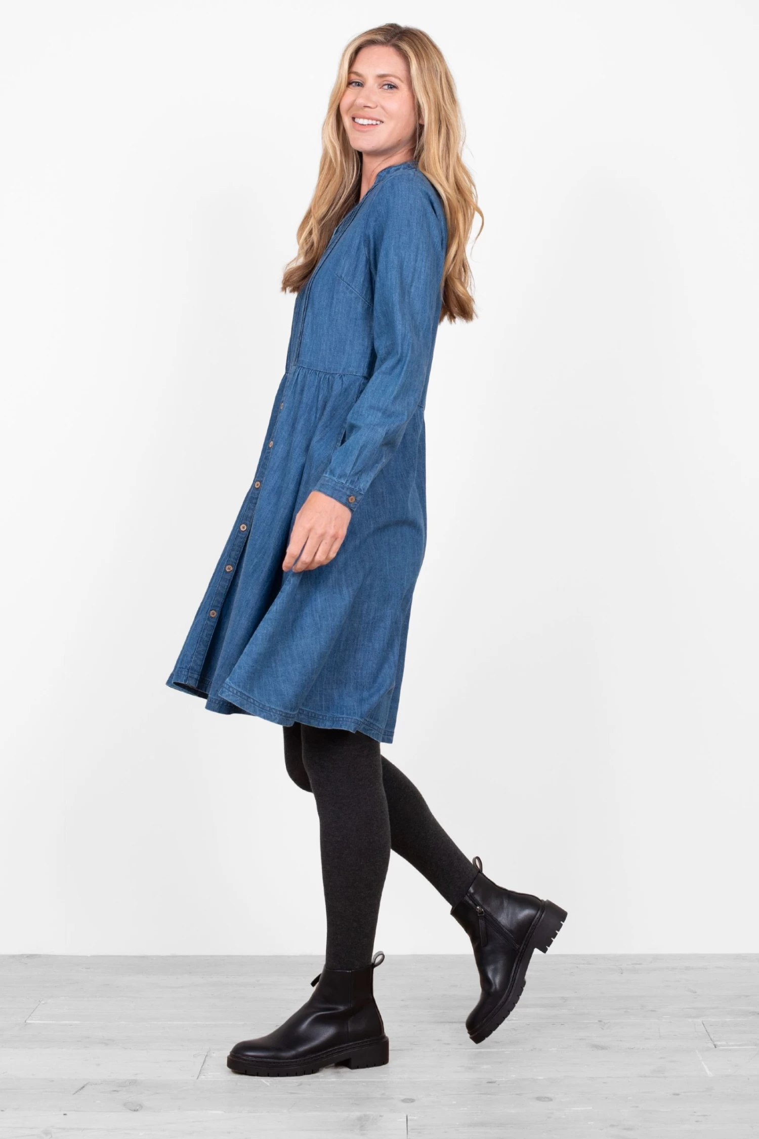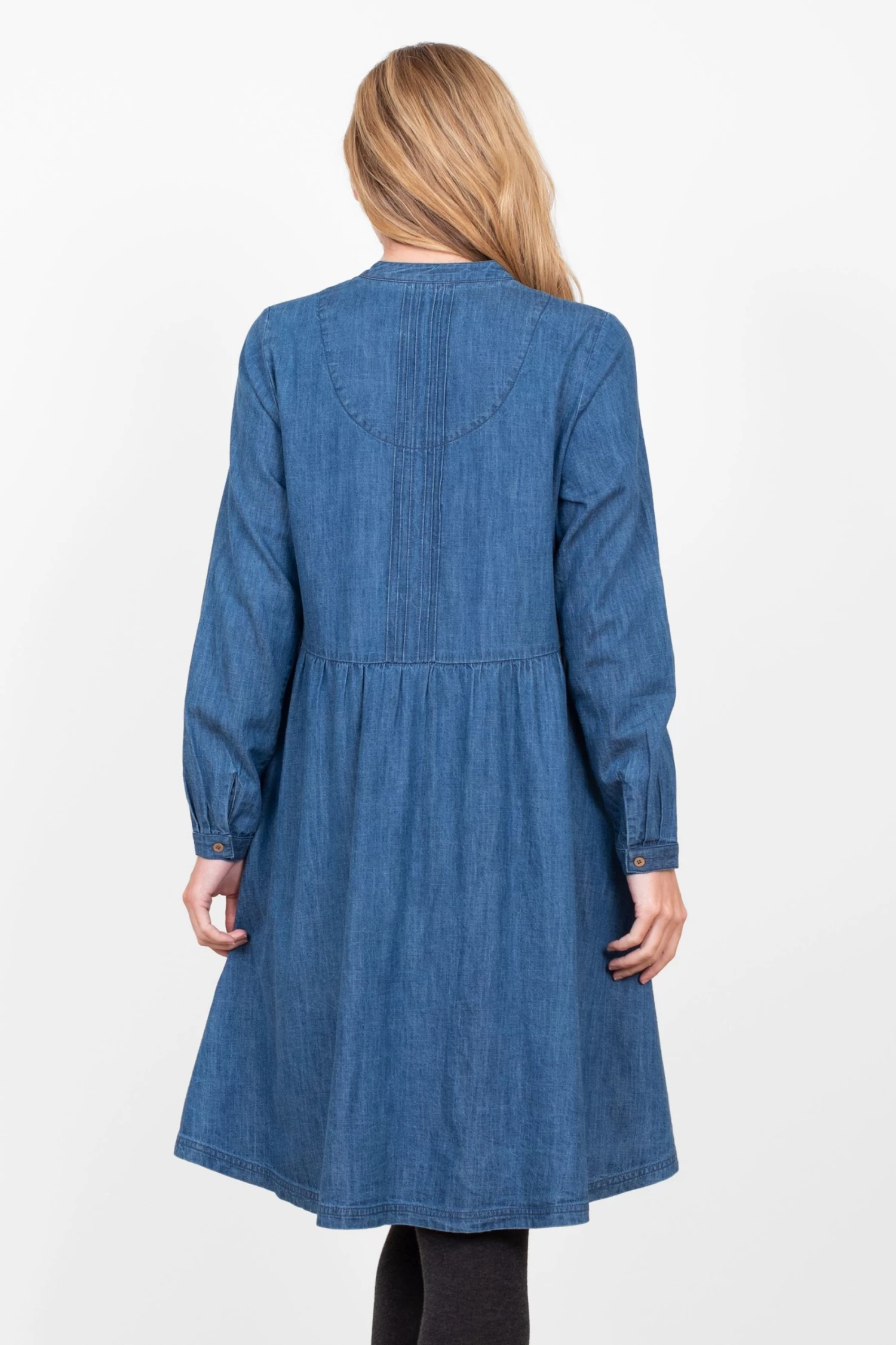 Run don t walk to get your hands on this mid length denim pintuck dress. Made from breathable cotton it s a loose fit, but the pin tuck detailing and the gentle gathering at the waist give it a lovely shape. Featuring button down fastening and cuffs, a v neck, long sleeves, and pockets.