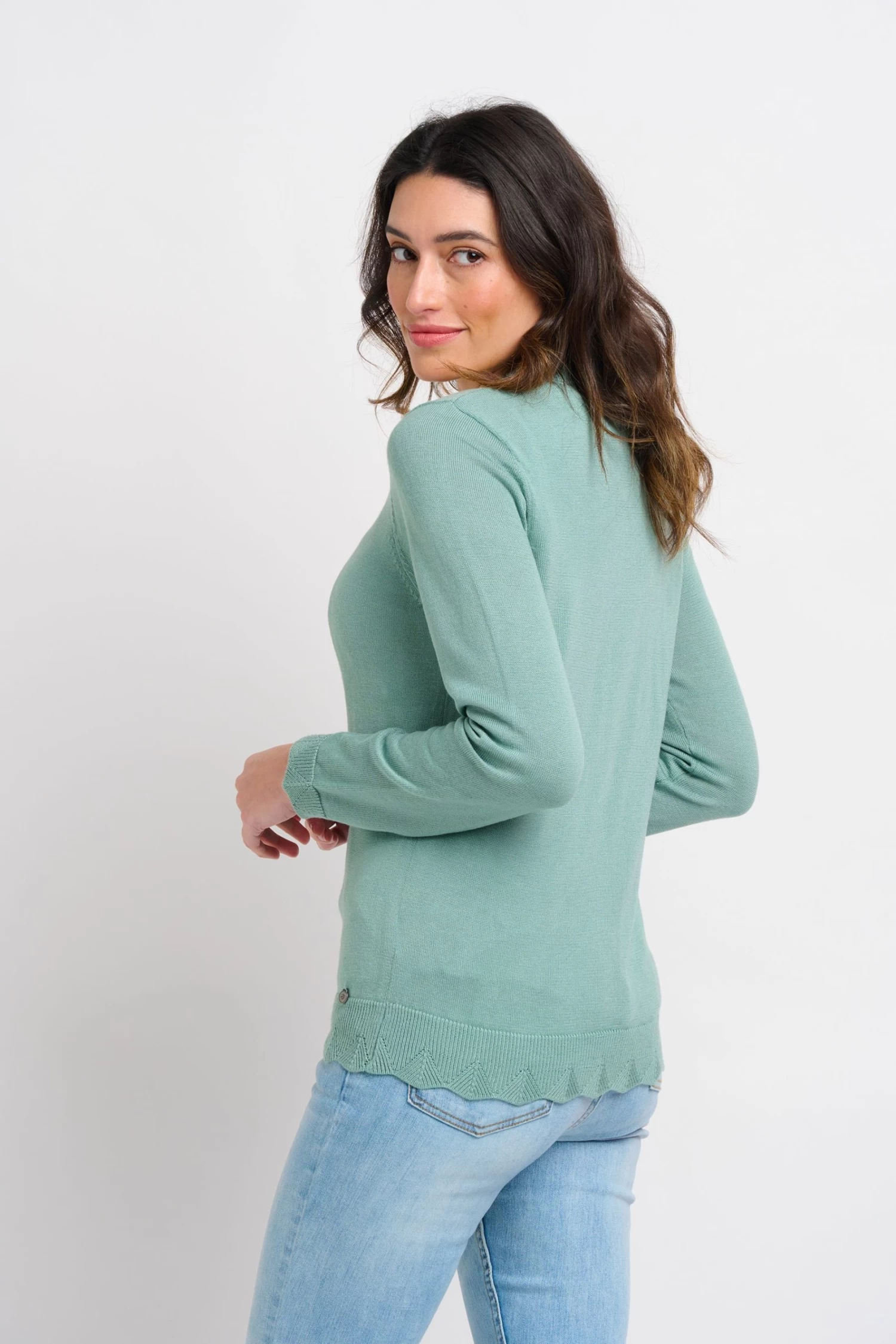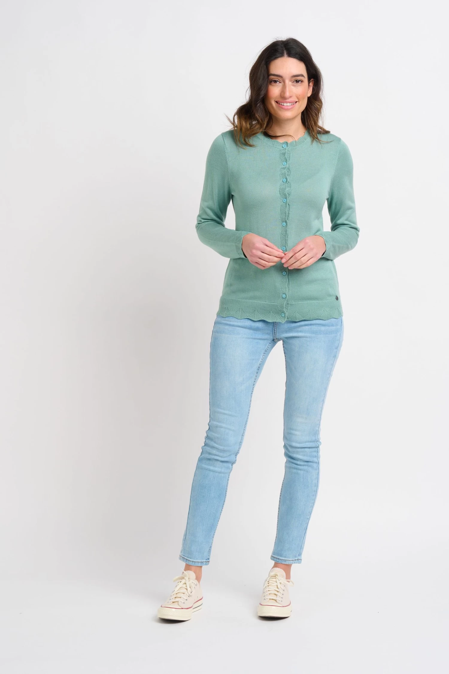 Complete your outfit with this light green cardigan with adorable scalloped cuffs, hem, neckline and placket. The buttons – running from top to bottom – are the same colour as the knit, with a slight iridescent tinge.
