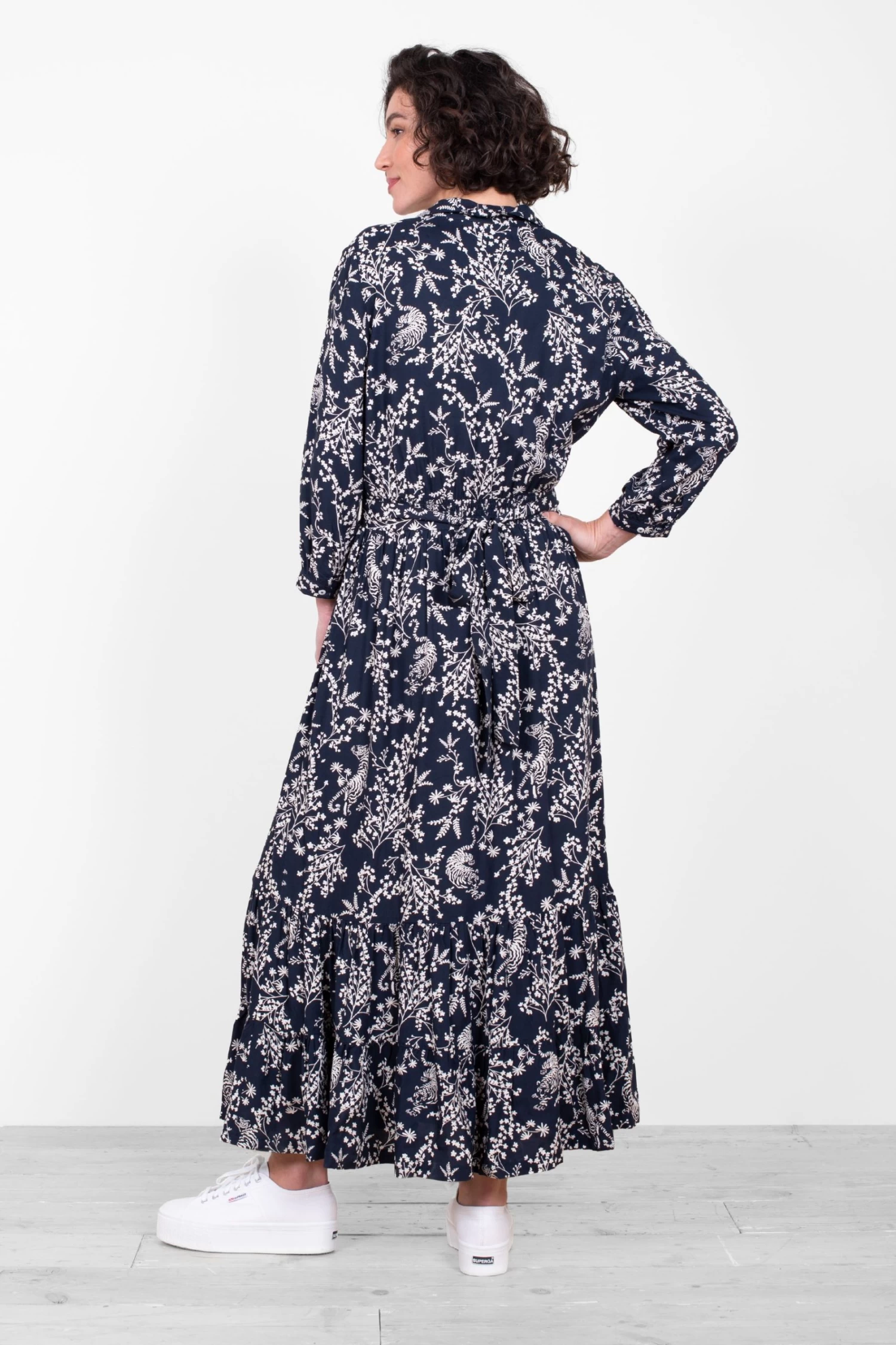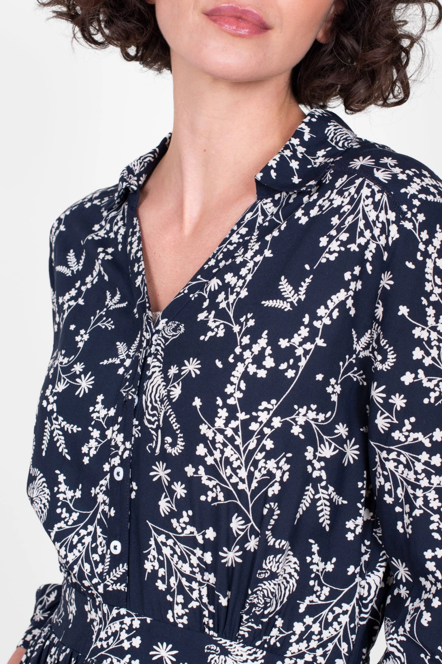Show off your wild side in this floral tiger print shirt dress. From daytime glam to nighttime elegance, this maxi length dress is sure to turn heads whatever the occasion. Featuring flattering shirring at the back of the waistband, a fabric belt tie, lace detailing, pearl effect button cuffs, and pockets!