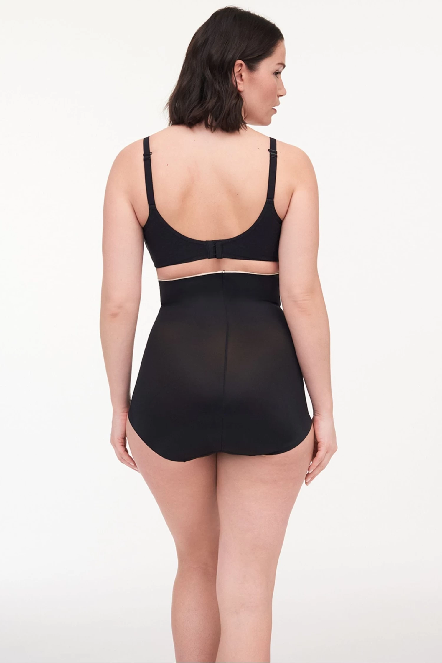 A Shaping product to create the appearance of a smoother and a firmer figure. Invisible finishes to retain smooth line under tighter fitting garments. Clean cut and roll resistant shiny nylon knit and heat-sealed technology. A very high-waisted brief rising under the bust providing a high level of support for the tummy and bottom. For women seeking targeted flat stomach and back bulge action. French creation, OEKO-TEX® Standard 100 certified.