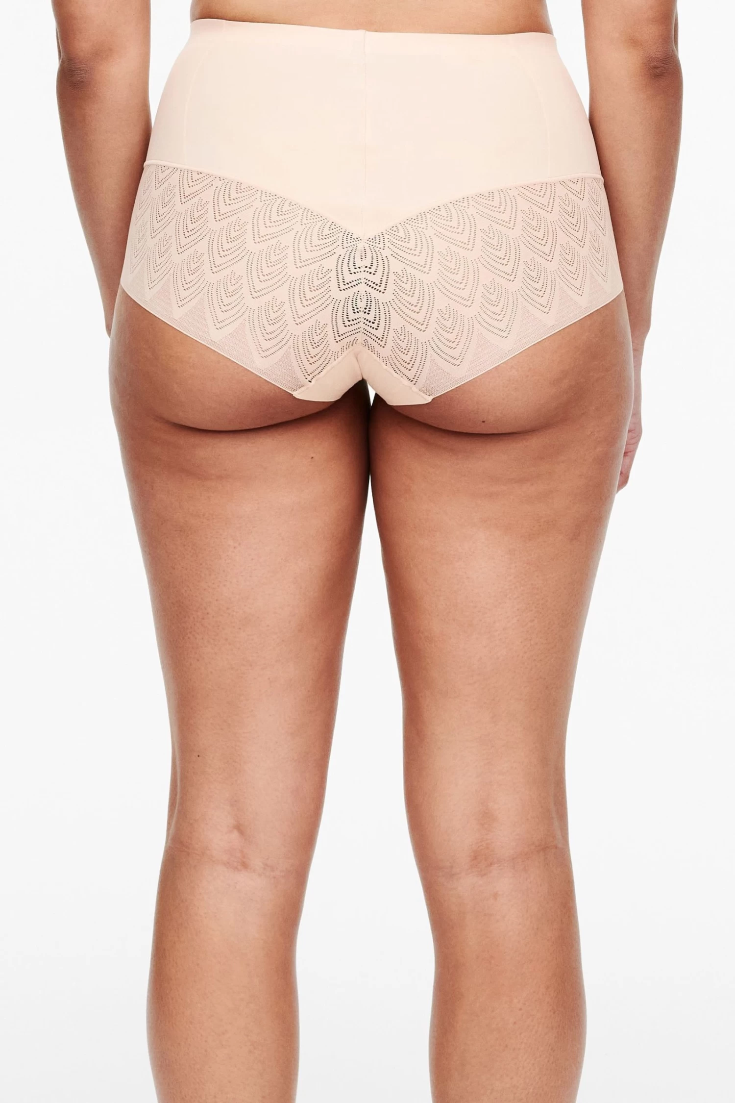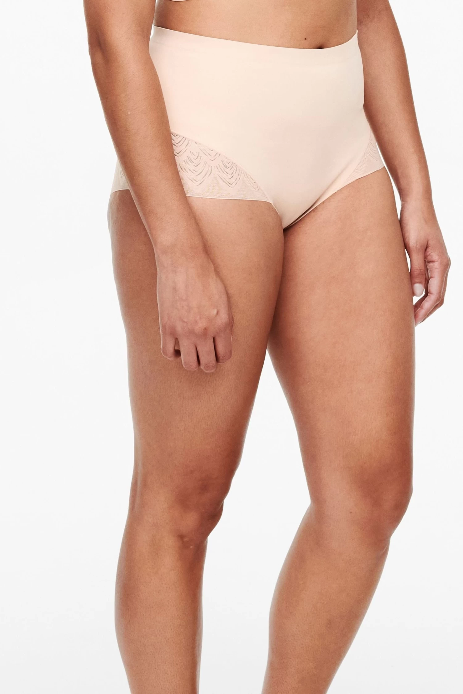 Reassuring high waist coverage to smooth the tummy and hips for a light by still firm shaping effect. Refines the silhouette. Lace insert on the buttocks and at the sides. Designed to not cut the tummy. Heat-sealed finishings on the sides and flat edges for the lace for full invisibility. Embossed Chantelle logo on the front. Soft finishes. French creation, OEKO-TEX® Standard 100 certified.