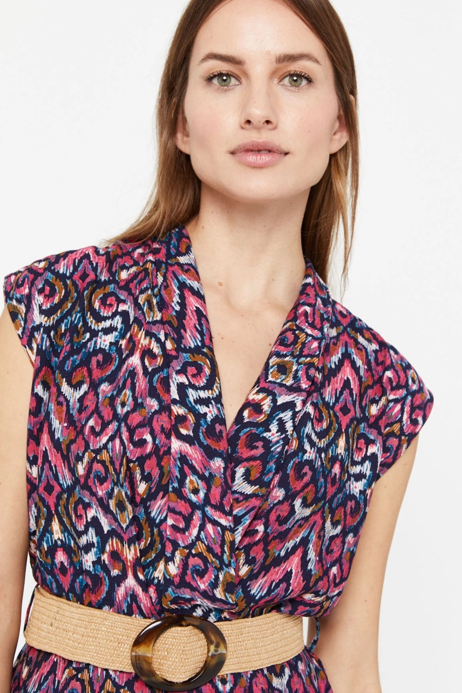 Textured fabric jumpsuit. Dropped sleeve. Neckline with lapels to the waist. Natural woven belt.