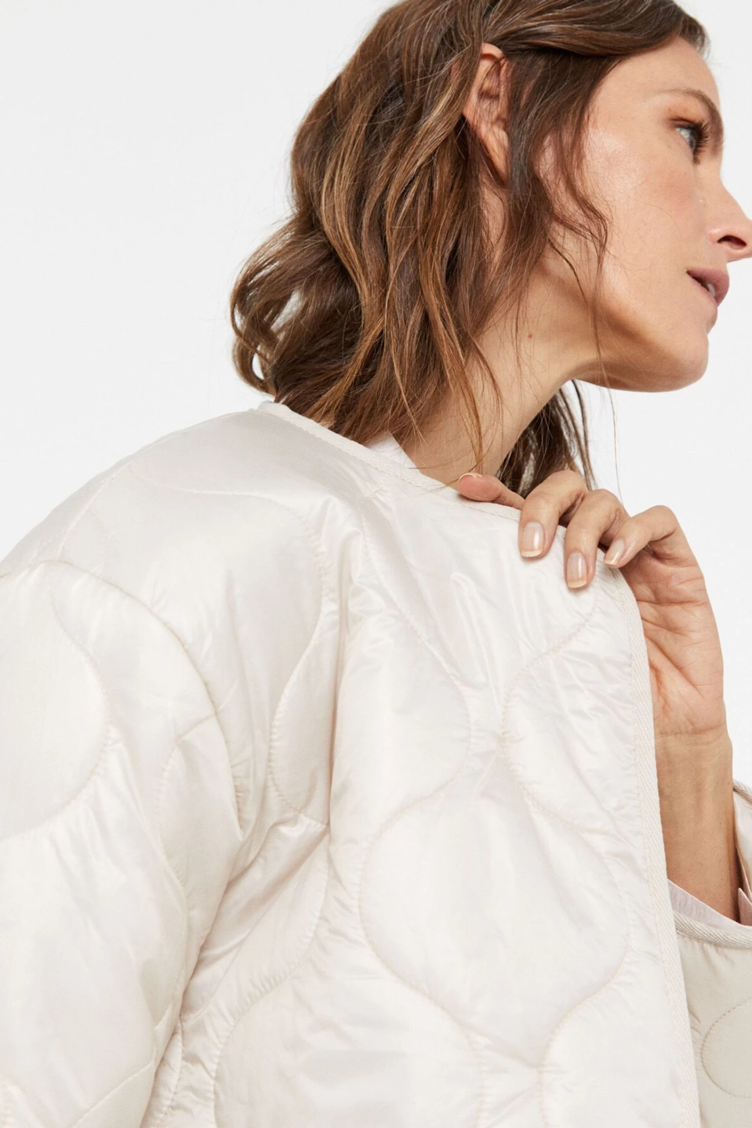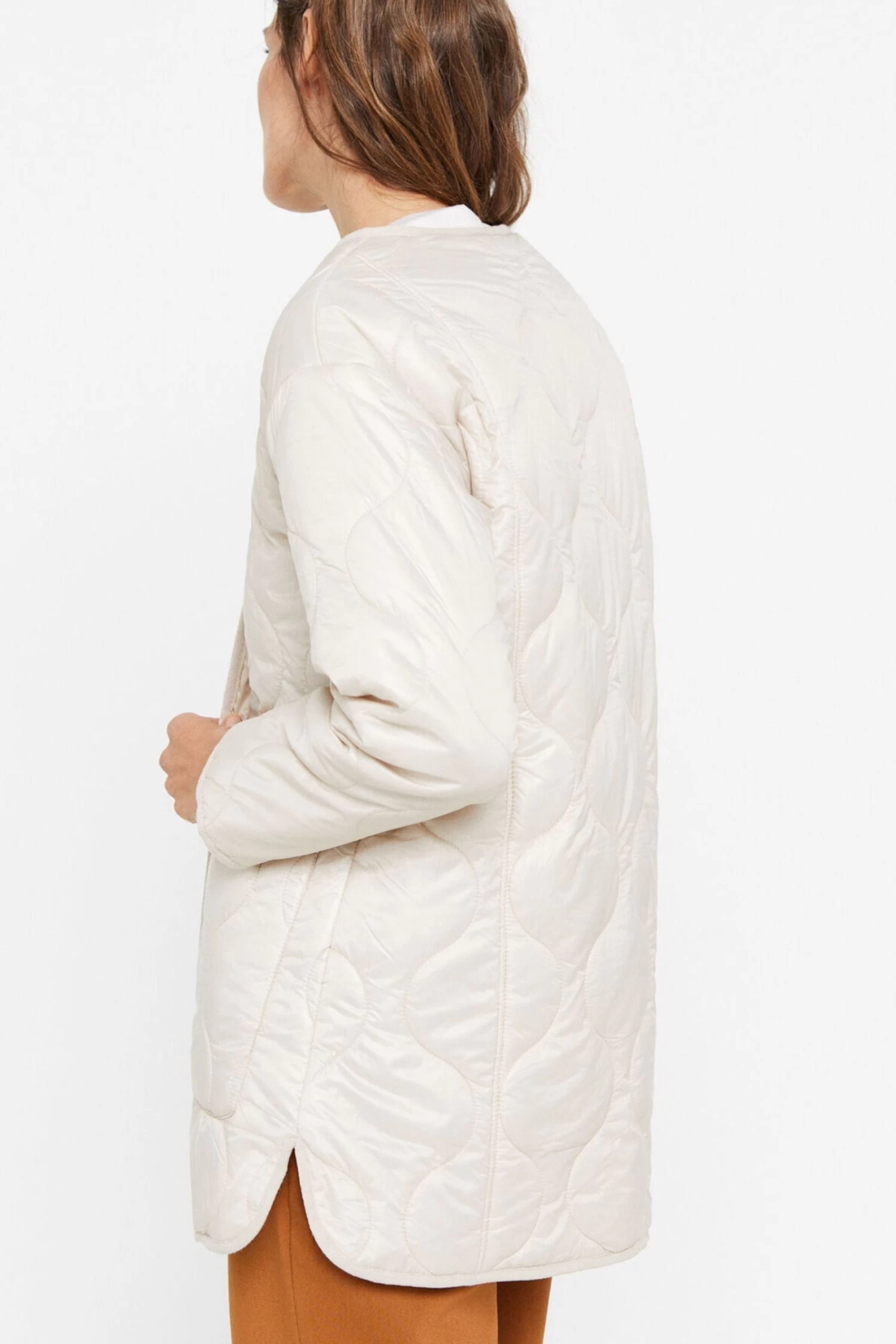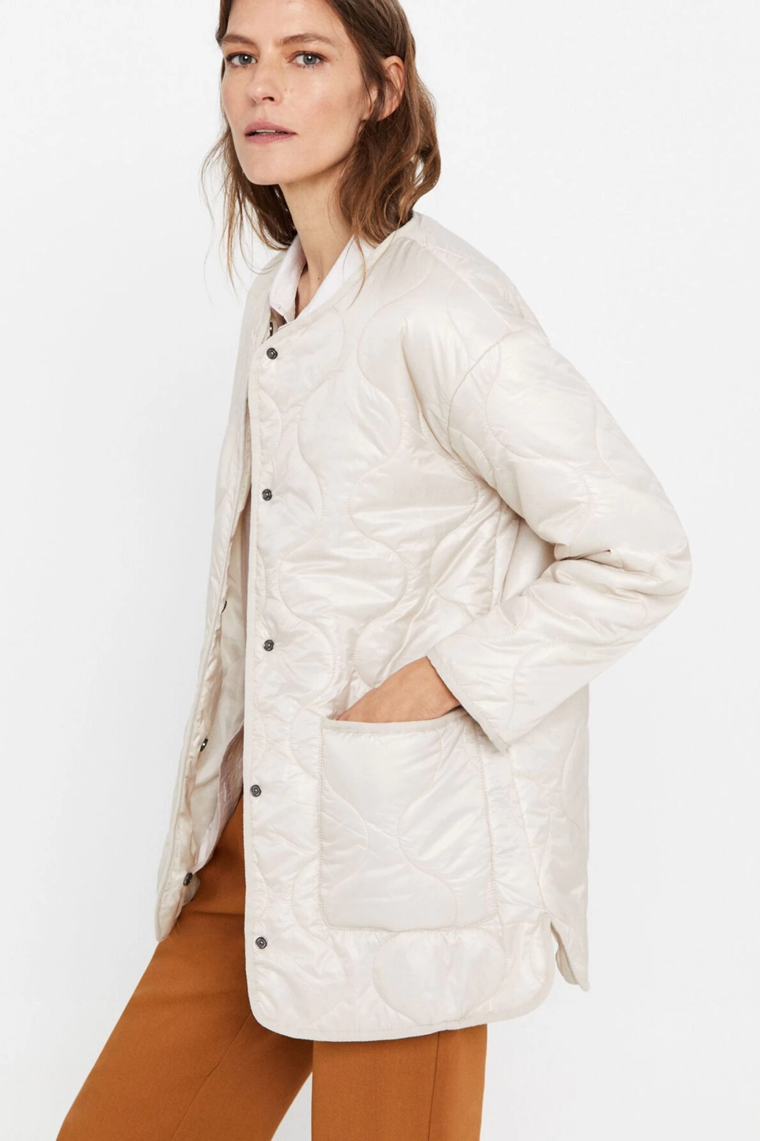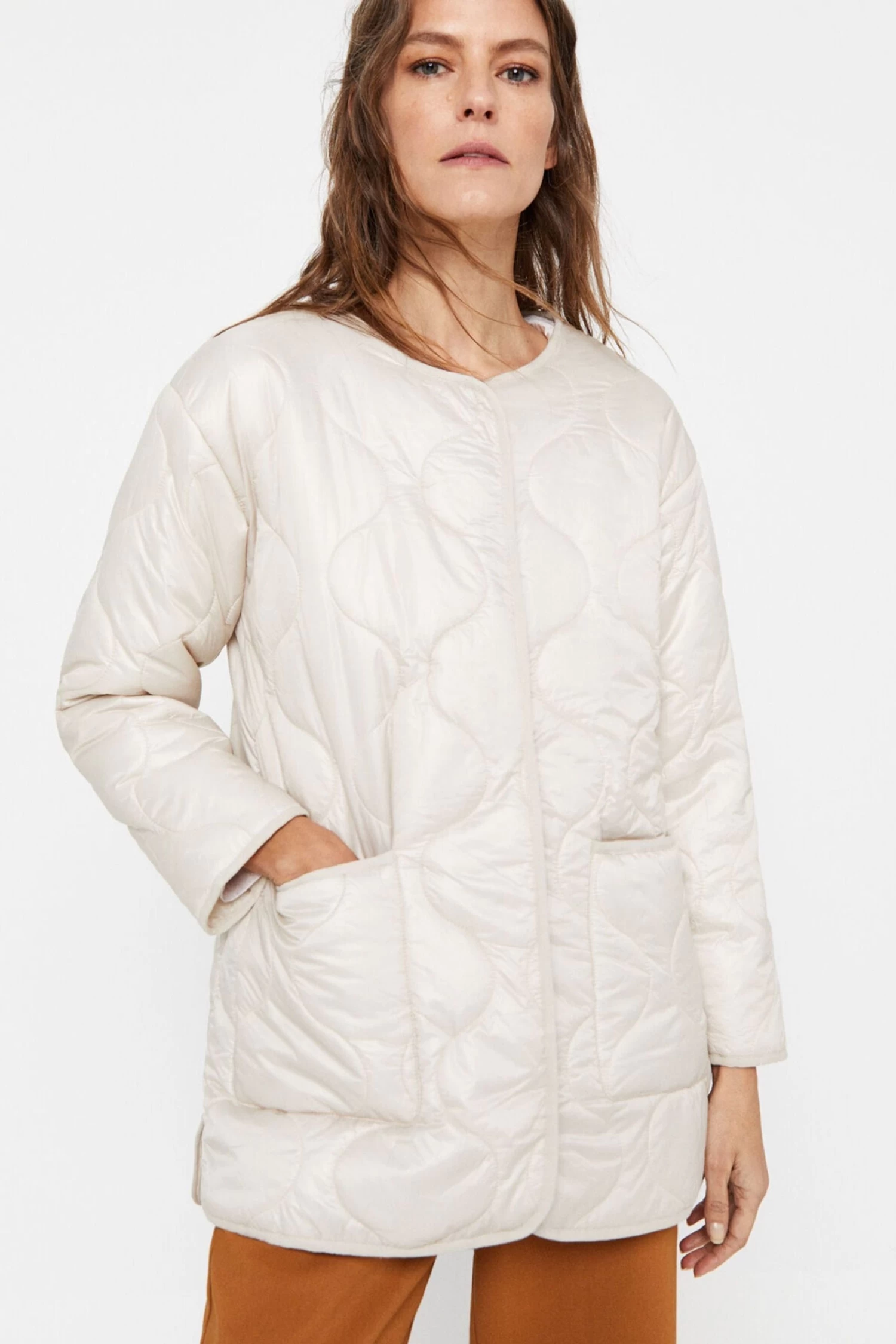 Long anorak with ultralight thermal filling. Crew neck, central press-stud fastening and side pockets. Main fabric with water-repellent finish.