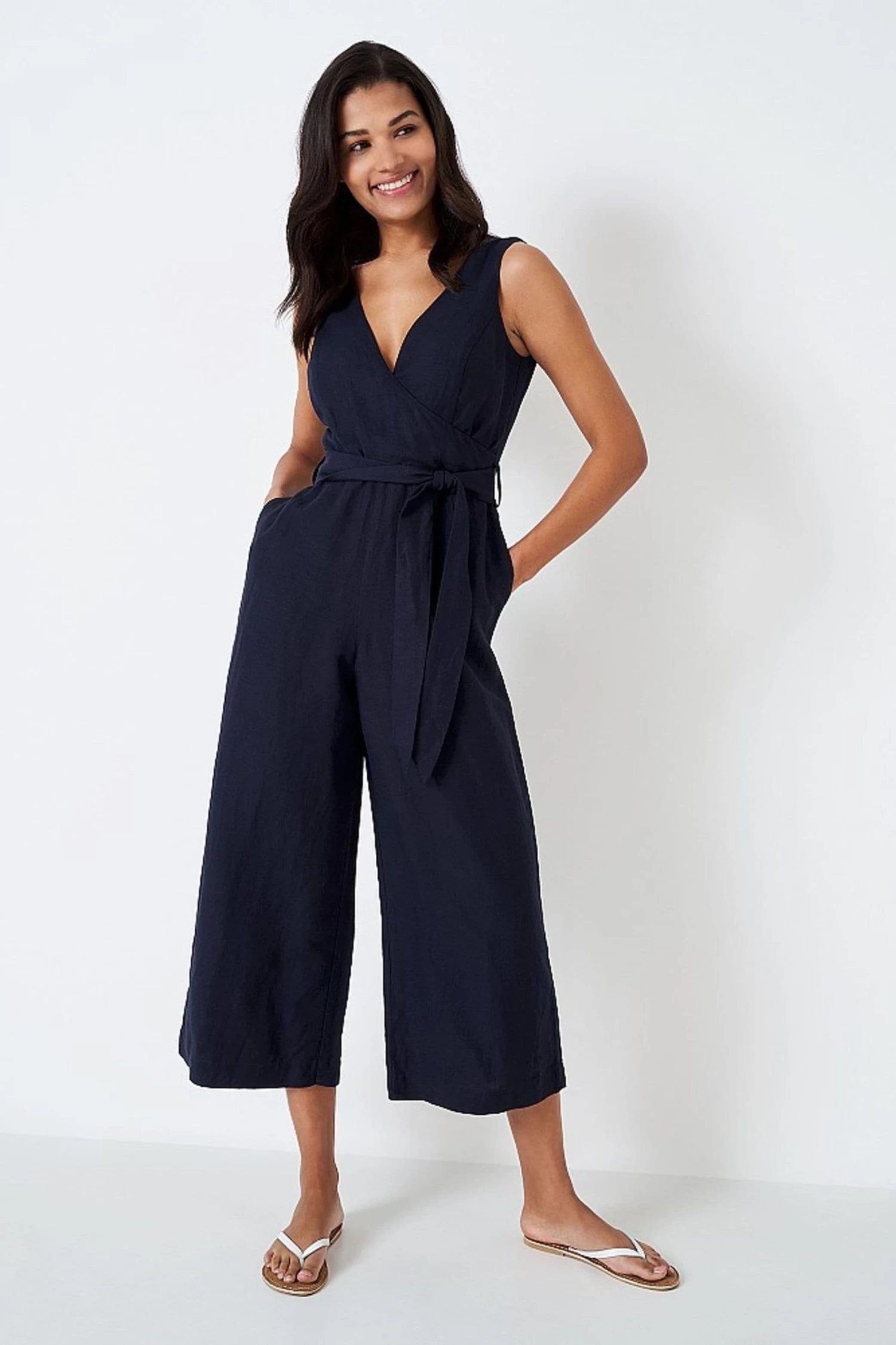 Meet our Jenny jumpsuit in navy. In a timeless, sleeveless design, this style features a wrap across v-neckline, tie belt to cinch you in at the waist and floaty (and oh-so-comfortable) wide trousers. Oh, and did we mention that it also has pockets? You’re welcome. Pair with sandals for an effortless ensemble or dress up with heels for a more formal occasion. V-neckline. Pockets. Tie belt.