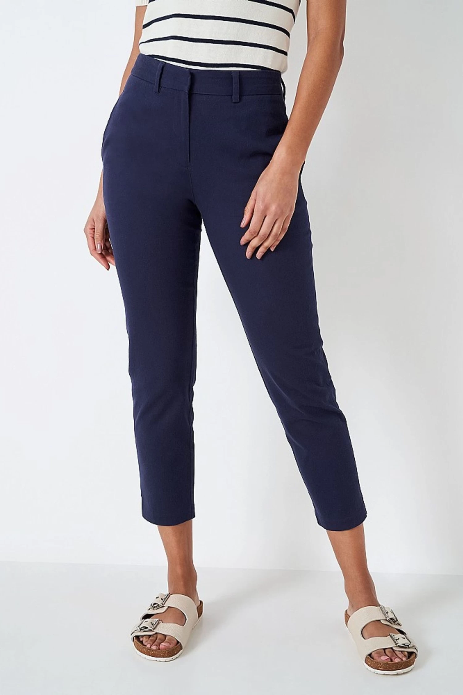 Our Capri trousers are in Blue. Effortless and stylish, we love these paired with deck shoes and a boxy shirt. We highly recommend having a pair in your repertoire. 97% cotton 3% elastane. Two pockets. Crossed oars are embroidered below the waistband.