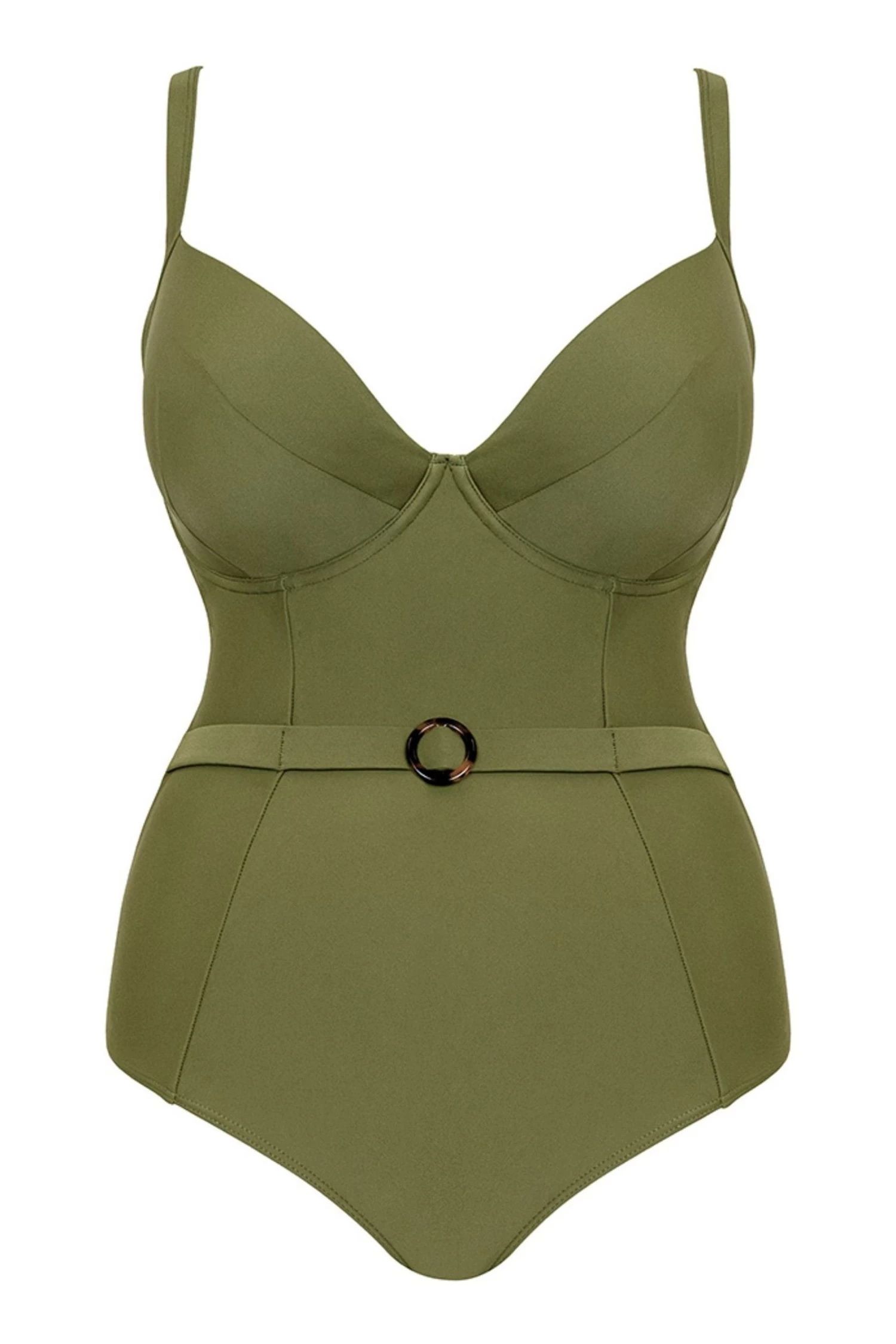 Retro sun in olive is given a 70s twist with the waist belt and tortoiseshell buckle for Bond girl vibes. The one-piece is a timeless design, with foam moulded cups for fabulous shape and lift. Featuring ‘Xtra Life Lycra’ for long lasting shape retention and resistance to heat, chlorine and sunscreen.