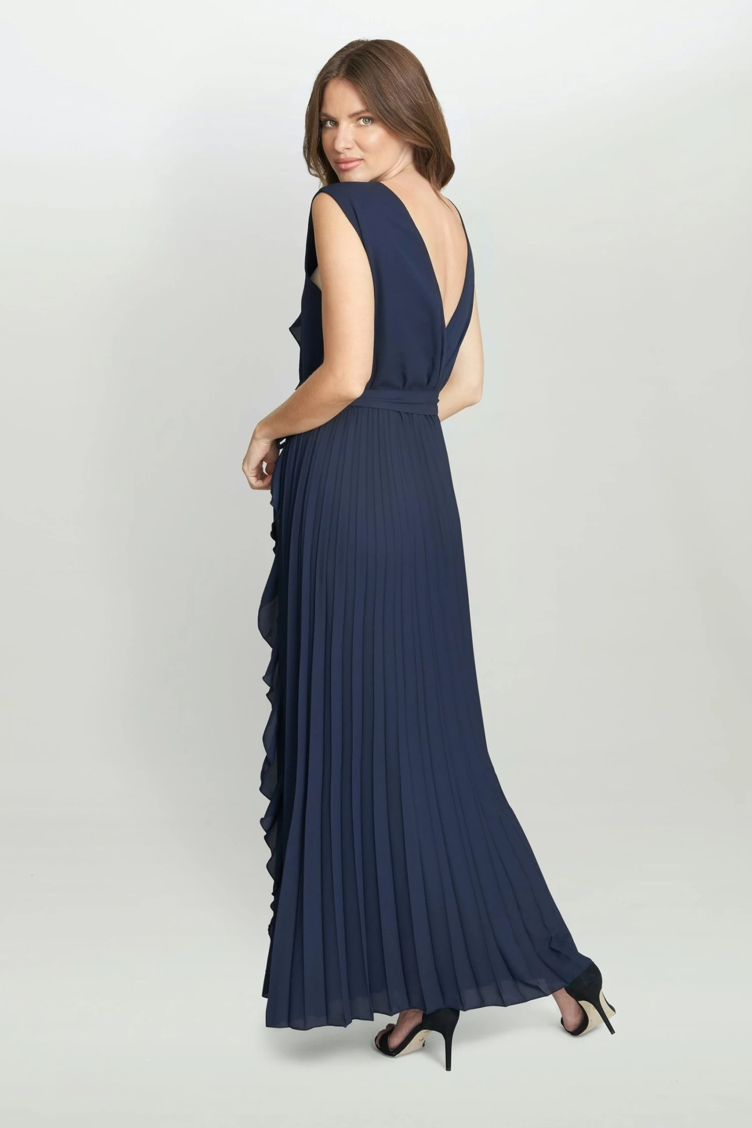 Wow in this elegant chiffon maxi dress by Gina Bacconi. Featuring a pleated skirt and delicate front ruffle across the bust and side of the skirt, this lightweight dress is perfect for special occasions and bridesmaids. Pair with the matching shawl.