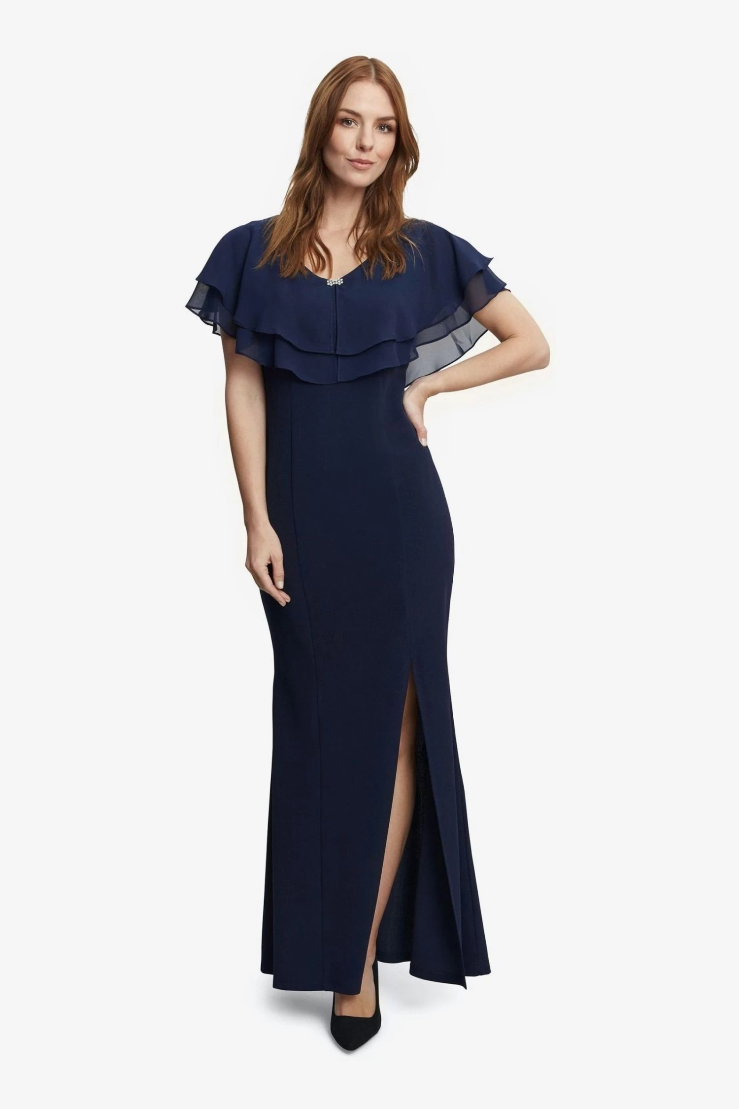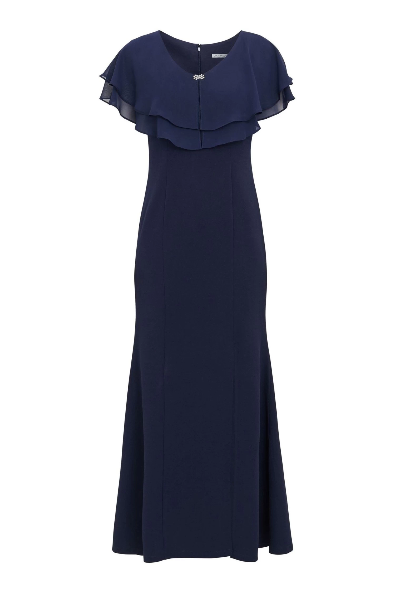 Add this elegant scuba crepe and chiffon maxi dress by Gina Bacconi to your wardrobe this season. This beautifully fitted maxi dress is given a modern uplift with a built-in cape detail which is crafted in floaty chiffon with diamante detailing to the front. The dress fastens with a concealed back zip. Pair with heels and a simple clutch for a sophisticated ensemble.