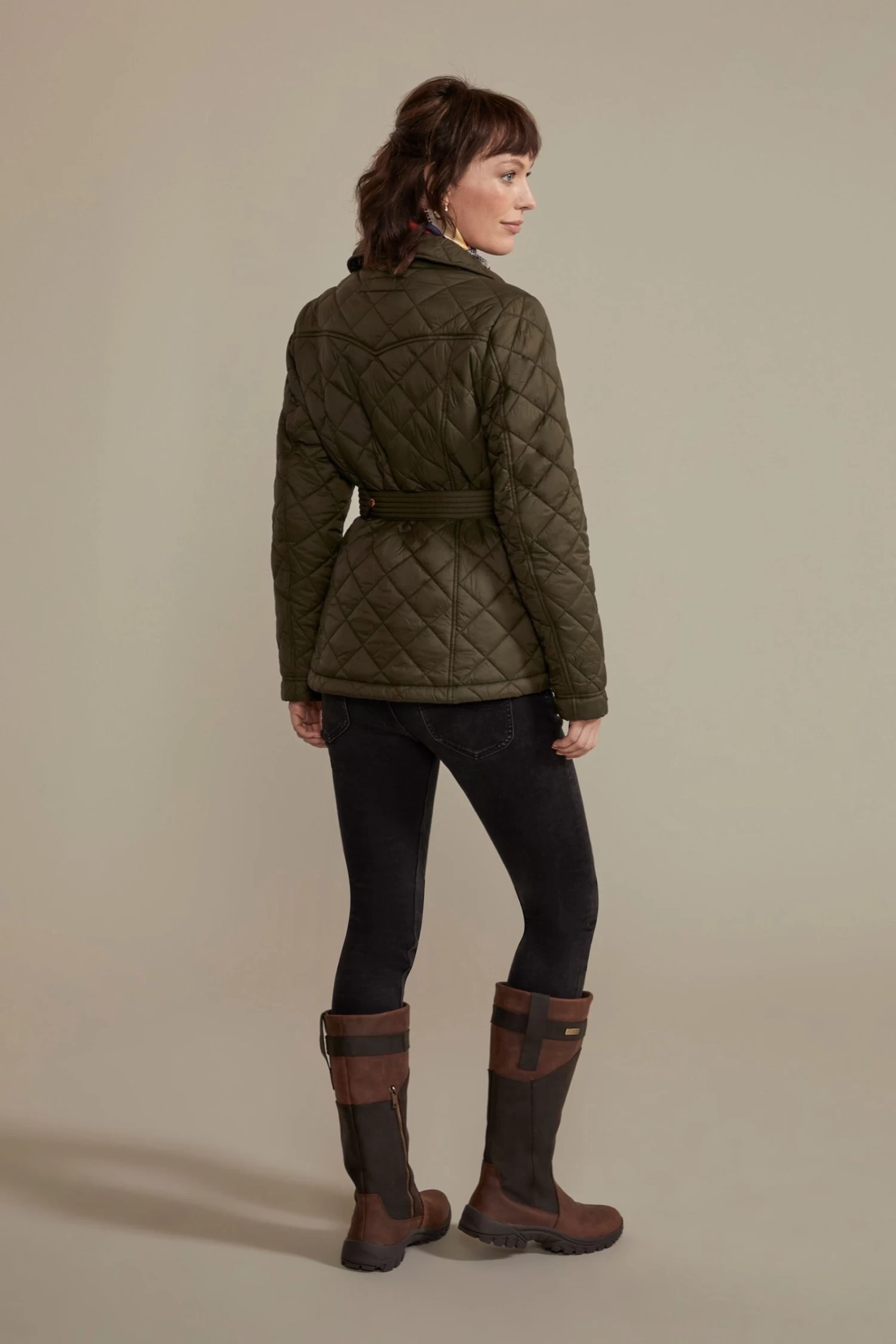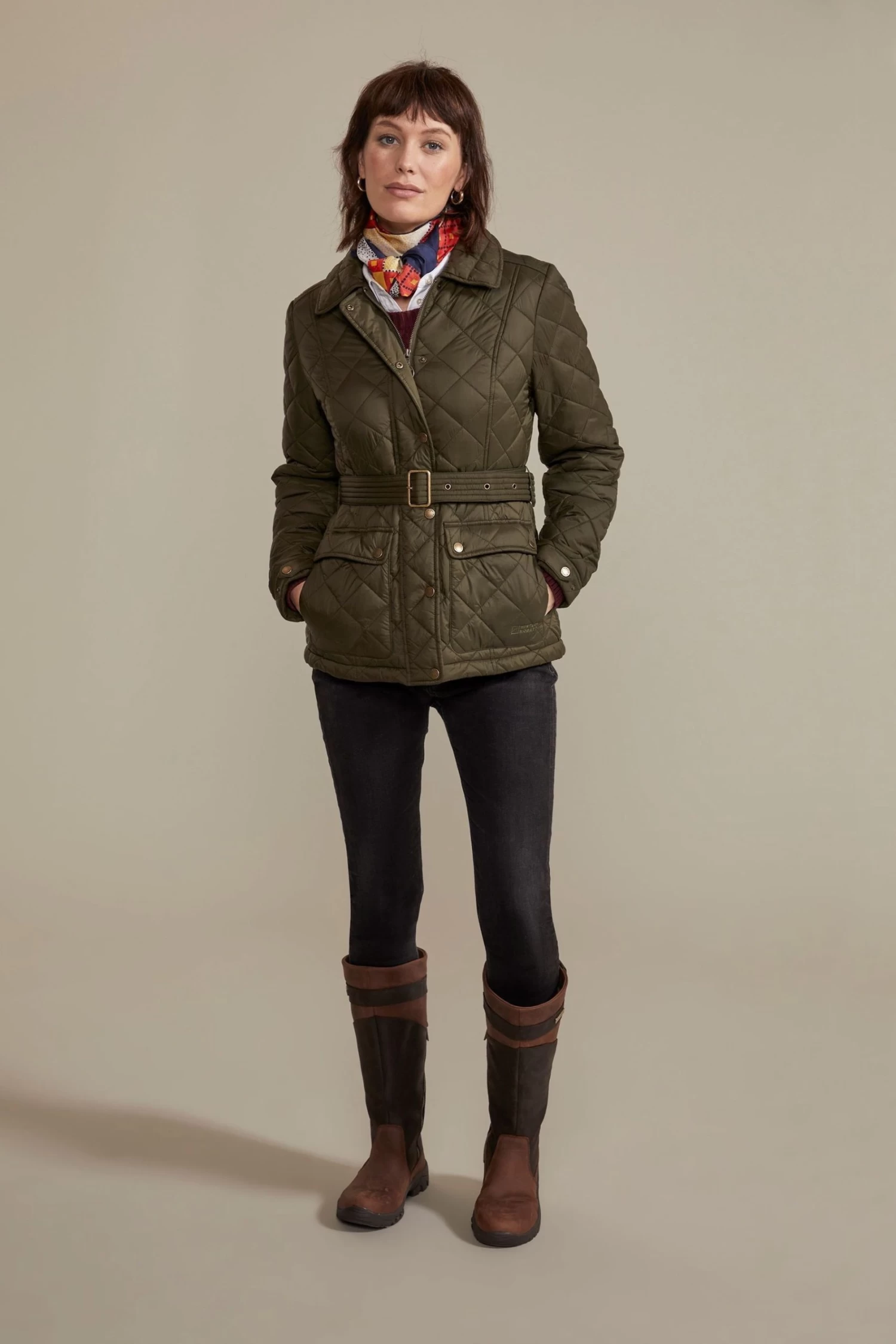 Hinter + Hobart s Galloway Womens Belted Quilted Jacket was designed with elegance and quality in mind. It is made with water-resistant fabric in a diamond-quilt style and padded with PrimaLoft® Gold Insulation. It has two front pockets and an internal pocket to keep your essentials. With its adjustable belt and princess seams for the perfect fit, as well as its stylish cord piping on the collar and pockets, Galloway is a classic and timeless piece, perfect for days out in the country or a lazy Sunday wandering around the markets. Water-resistant – Treated with Durable Water Repellent (DWR), droplets will bead and roll off the fabric. Light rain, or limited exposure to rain PrimaLoft Gold Insulation – Featuring 100% post-consumer recycled fibres, it keeps you dry, warm and comfortable and is designed for superior durability over time. Breathable – The fabric allows perspiration to pass out of the garment, keeping you cool and comfortable Recycled Fabric – Protects our oceans, safeguards the Earth s resources and prevents waste Antique Brass Branded Hardware – This garment features Hinter + Hobart s antique brass branded hardware, timeless and elegant. YKK® Zips – Waterproof, Smooth & Durable outer zips Adjustable belt Adjustable cuffs – Easily adjustable for a perfect fit.