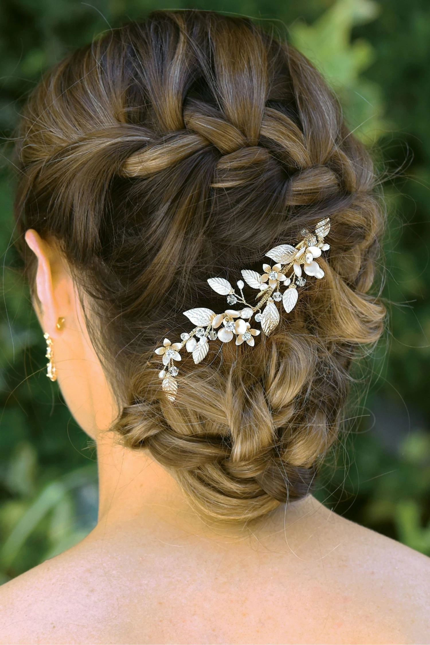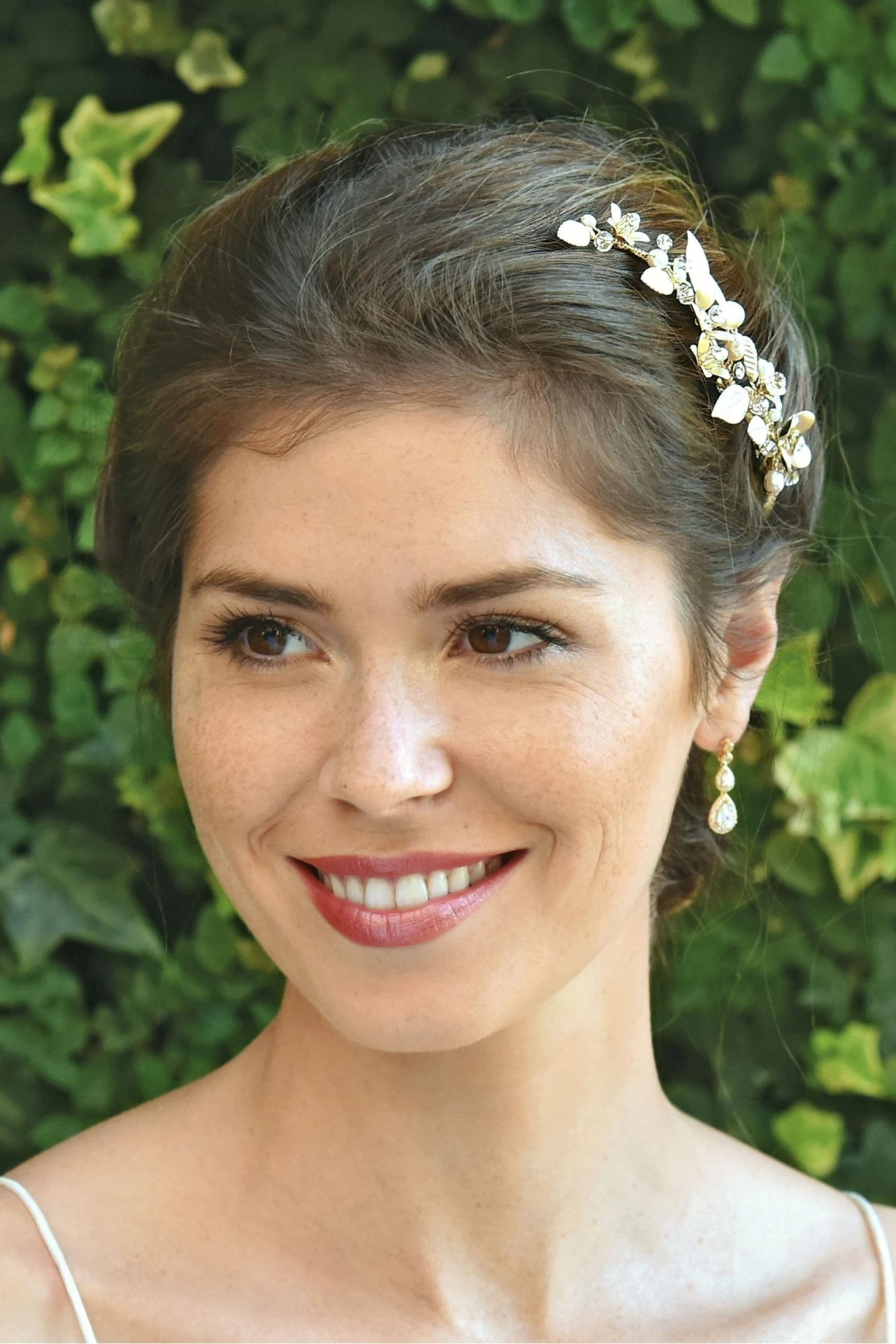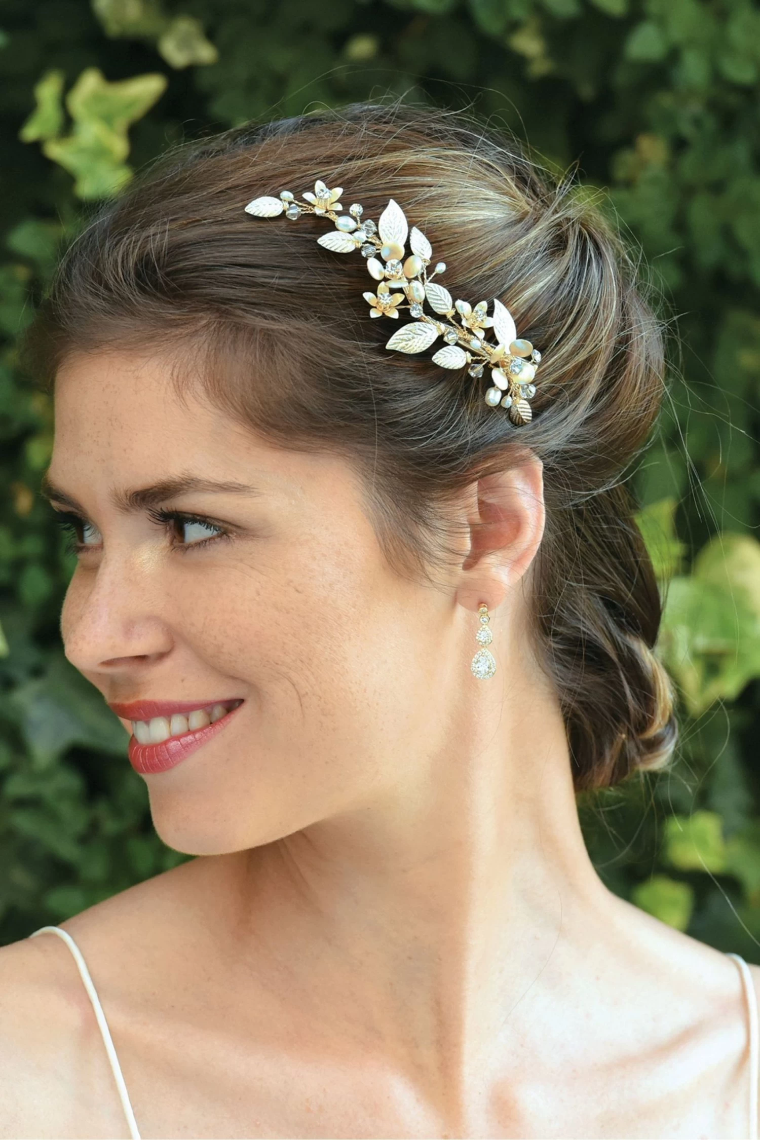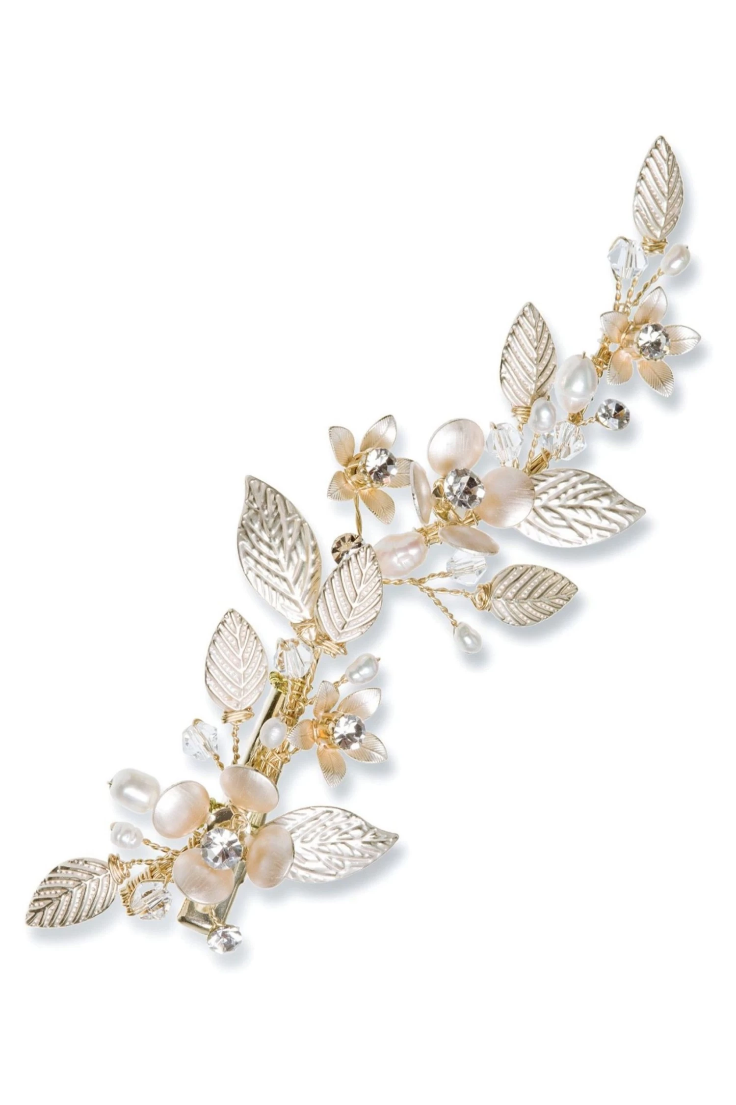 Poppy is a beautiful and delicate floral hair clip. Cut solitaire crystals, cut crystal beads and pale ivory freshwater pearls are set in a stunning design intertwined with enamelled flowers and leaves. Poppy is perfect for brides looking for a romantic floral themed hairpiece but can also be worn by maids of honour and bridesmaids. Plated in 14ct Gold and measuring 13cm at the longest point. Set with genuine Austrian Crystals cut both to look like real diamonds and as faceted beads for extra sparkle as well as real Freshwater Pearls and featuring hand enamelled elements.