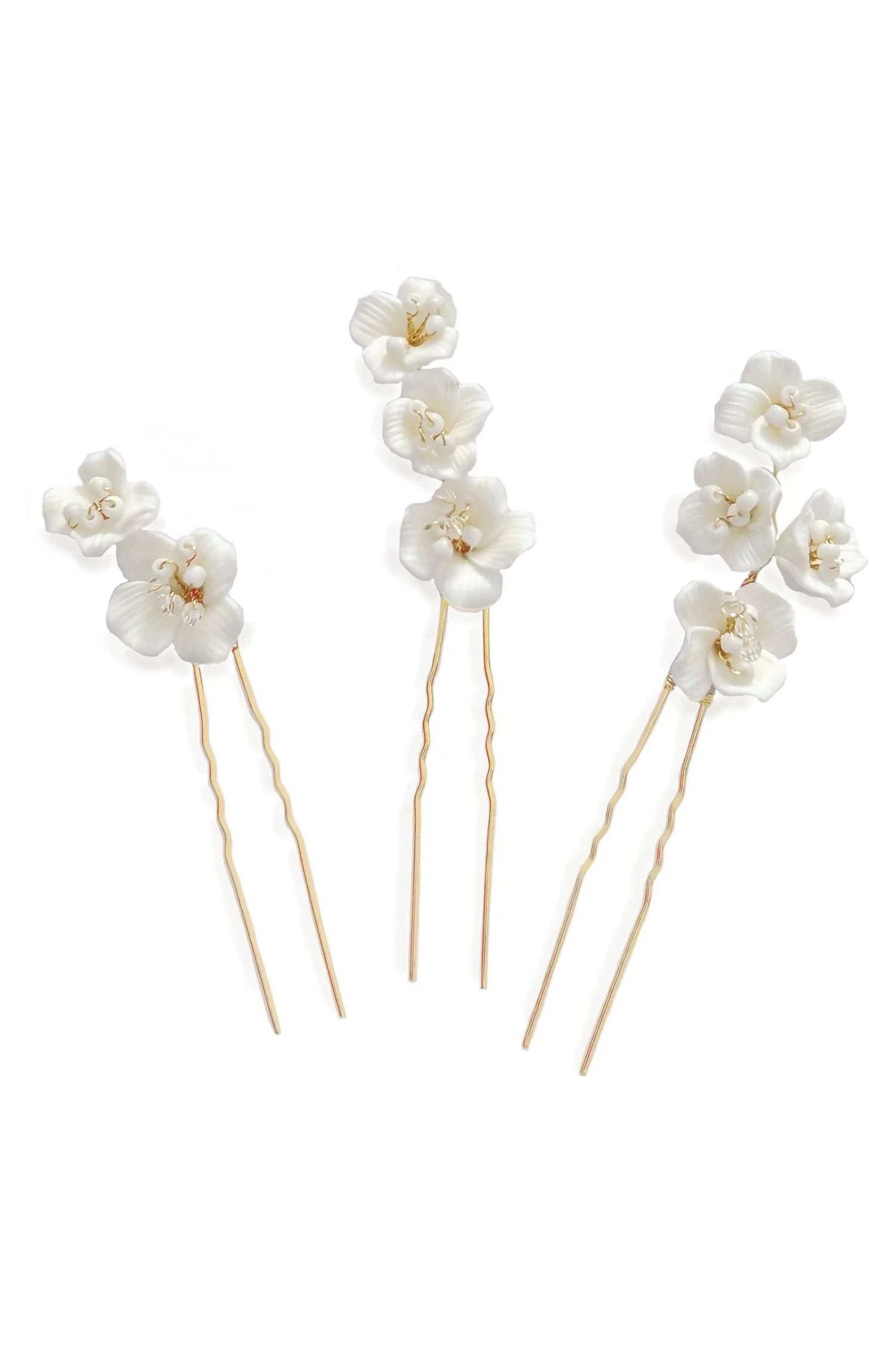 One of the most sought after hair accessories this season, and so pretty and with delicate boho styling. Featuring handmade toughened ceramic flowers as well as genuine cut Austrian crystal beads and matt ivory beads. Plated in 14ct Gold and set on 3 pins which are versatile and can be worn in various styles at the back or sides of head. The pins come as a set, with a small, medium and large flower design ranging from 3.5cm to 5cm (just flower piece). Comes beautifully packaged in a luxury designer box to keep it looking it’s best. Every Ivory & co design is handcrafted by skilled artisans in the traditional way with all stones and elements hand picked and set. Designed by an award winning design team, with an ethos of ethical practises and sourcing , working to make bridal supply chains more responsible.