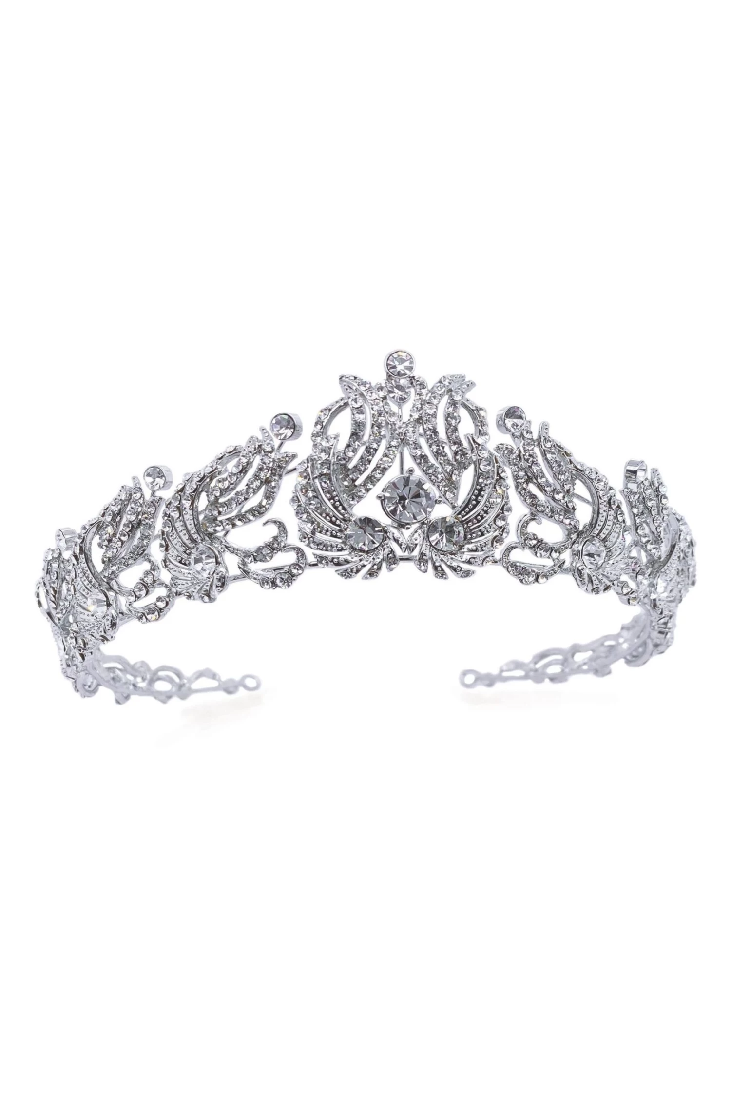 This is an elaborate and stunning design, based on the historical designs of a bygone era. Dazzling stones are set in sweeping waved down each side of this regal design. Stunning with classic or contemporary bridal gowns. Plated in Rhodium (part of the platinum family of metals) and measuring 3.5cm at the highest point. Set with genuine Austrian Crystals cut with facets to look like real diamonds.