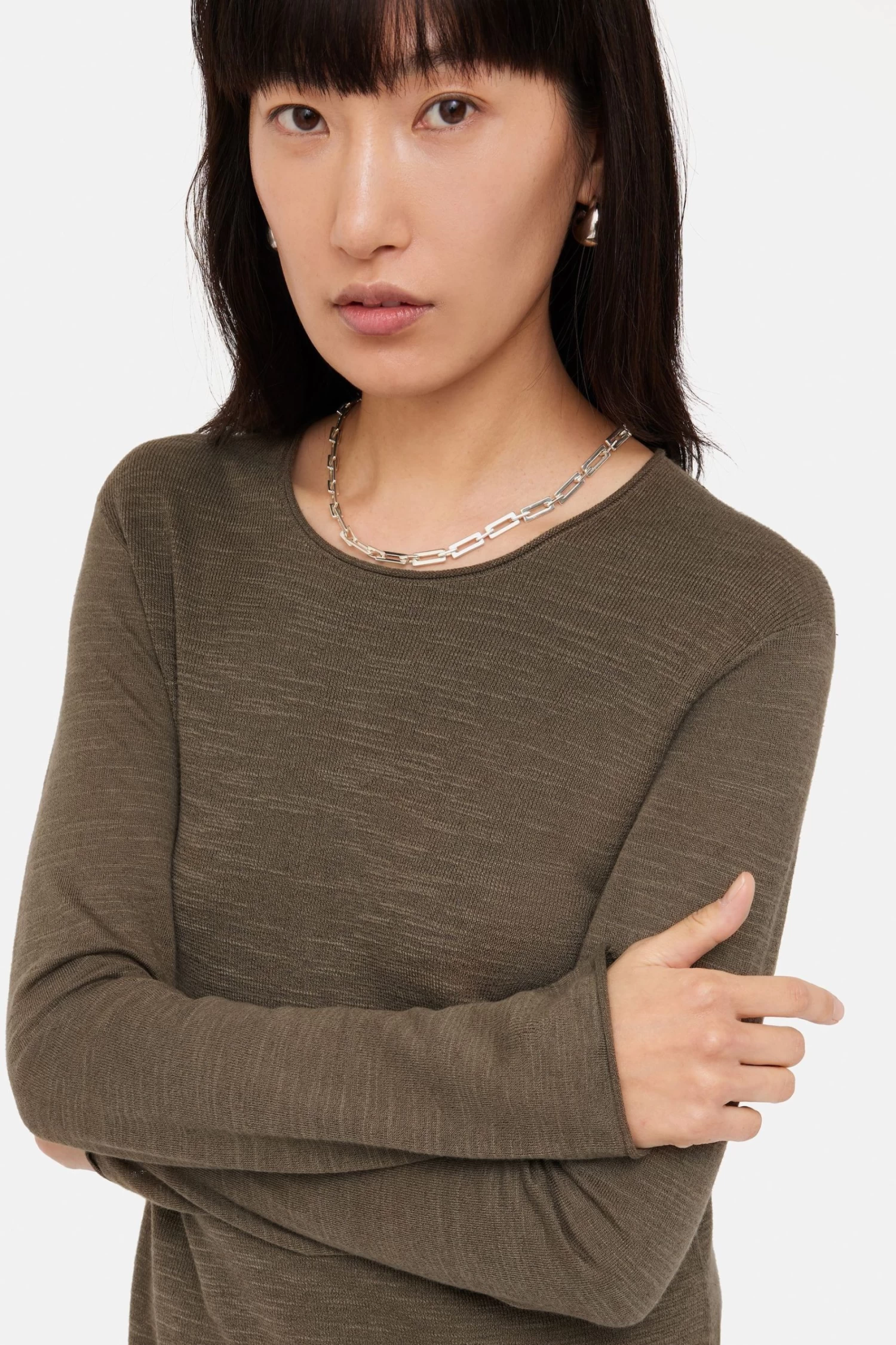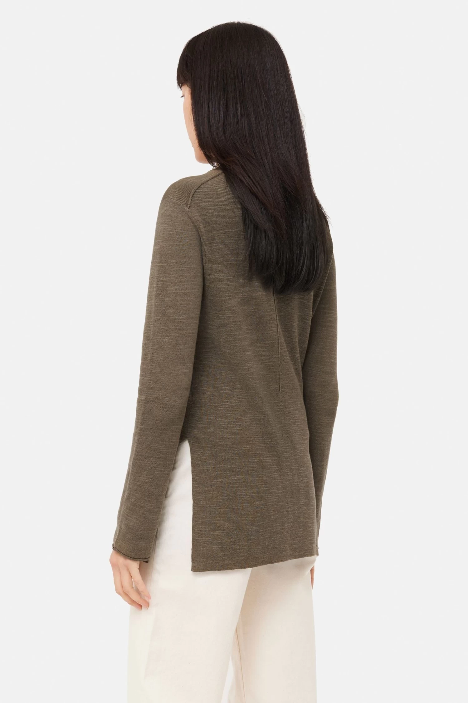 Lightweight linen cotton jumper with deep side slits. The slub yarn, exposed shoulder seams and rolled edges at the cuffs, neckline and slits give this a minimalistic, natural finish. A transeasonal staple that can be dressed up with a piece of tailoring, or paired with denim jeans for a more relaxed feel.