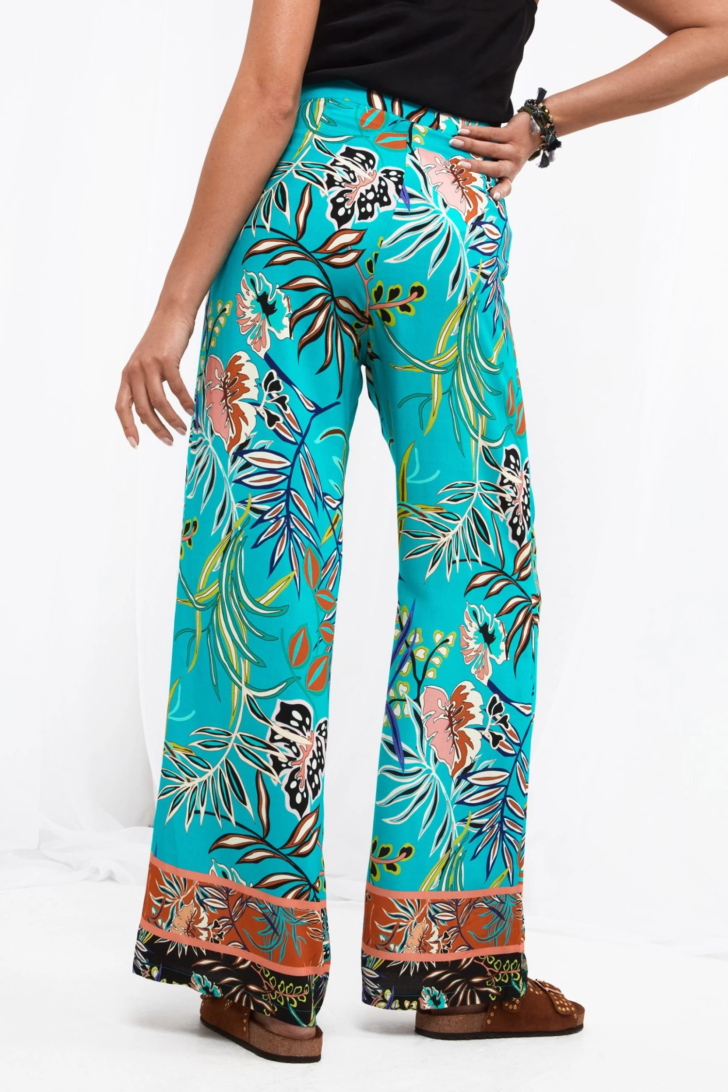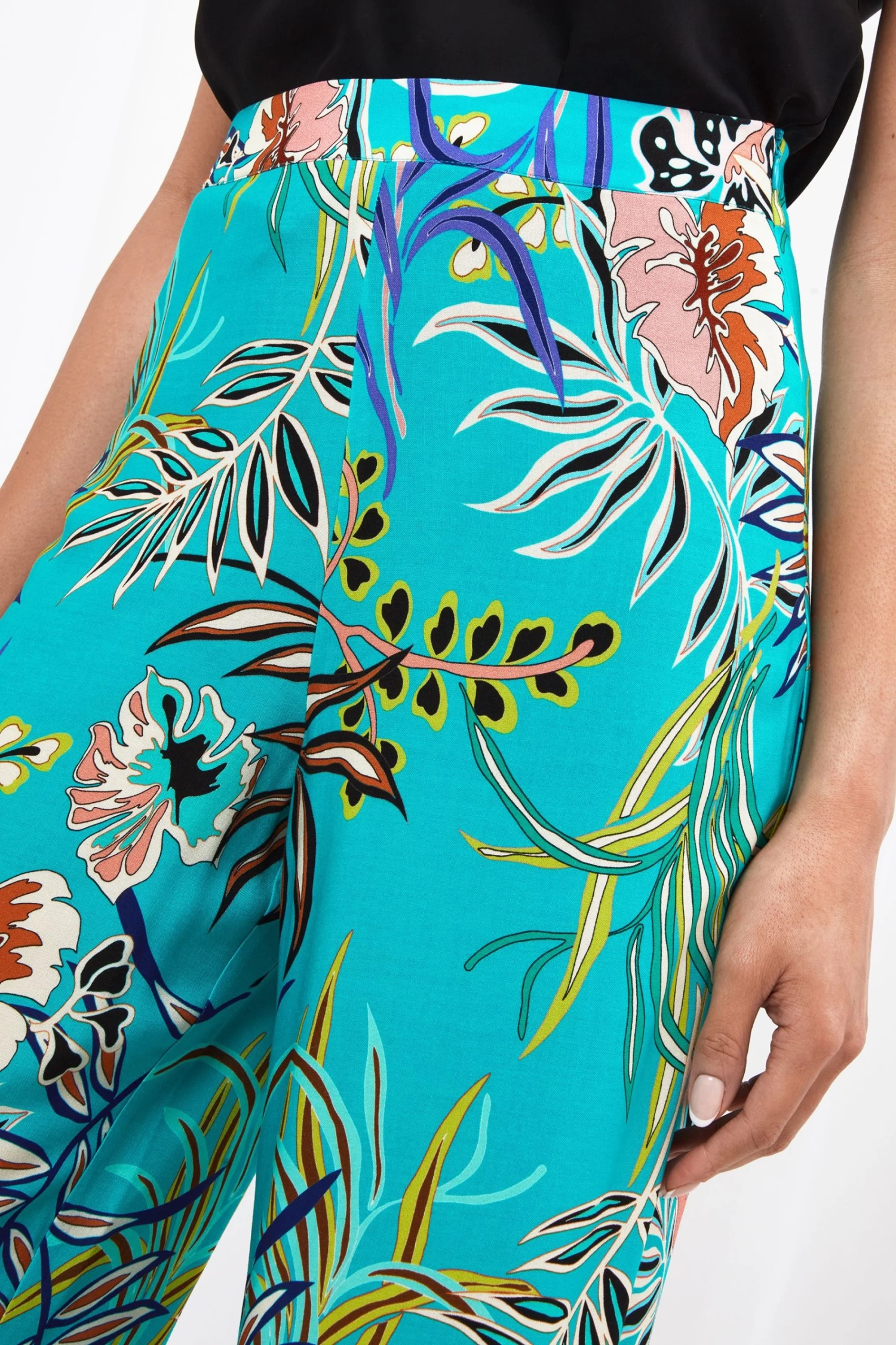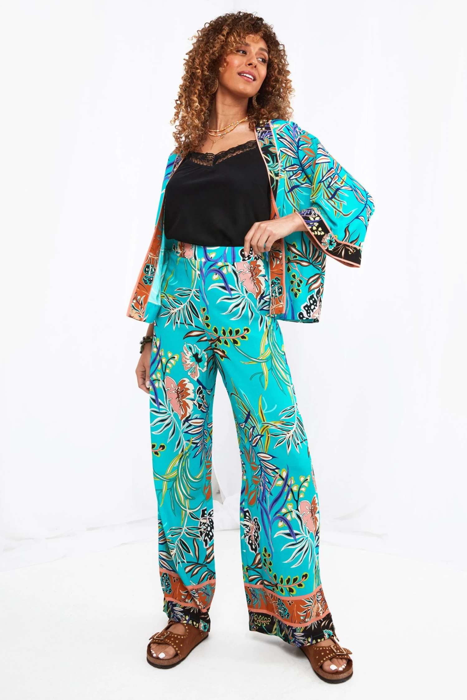 Perfect for relaxing with a cocktail in hand, these premium, palm-print trousers are bursting with tropical vibes. You’ll love the fit too – high-waisted with stylish, wide legs, they’ll really flatter your figure. Just add our matching kimono jacket to embrace that laid-back energy on your next holiday. Inside Leg Length: 31″.