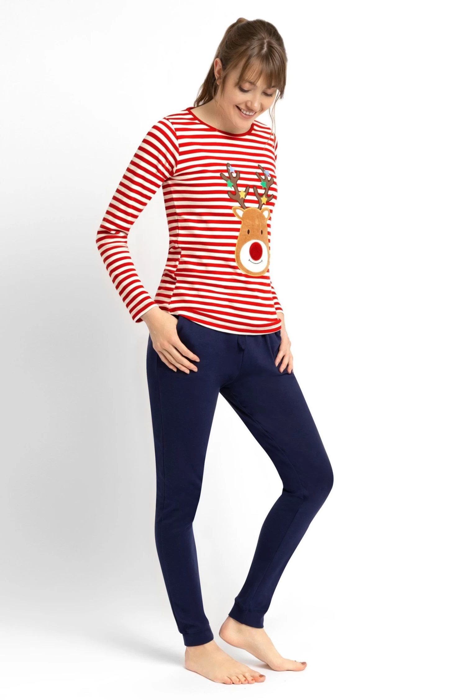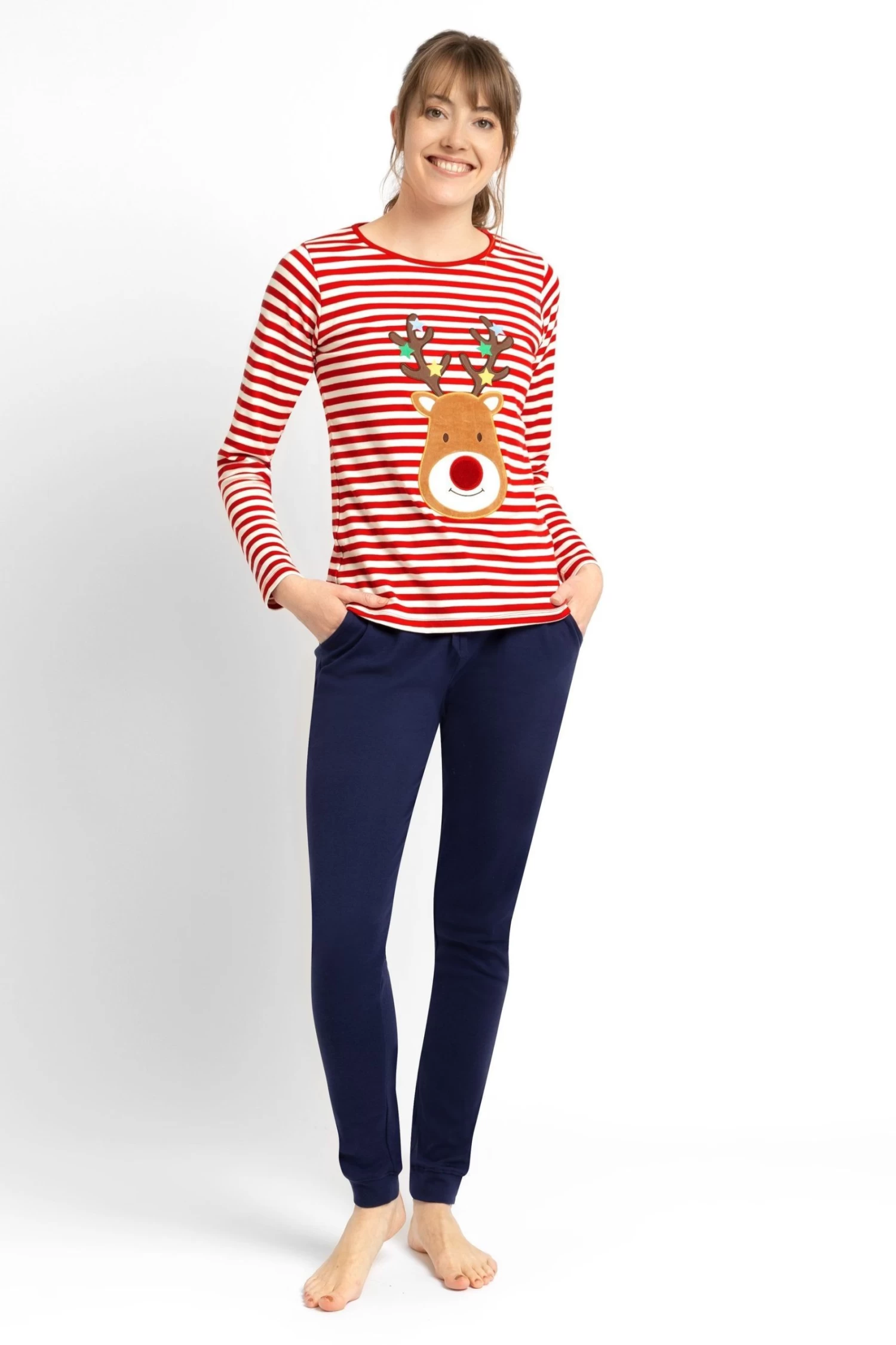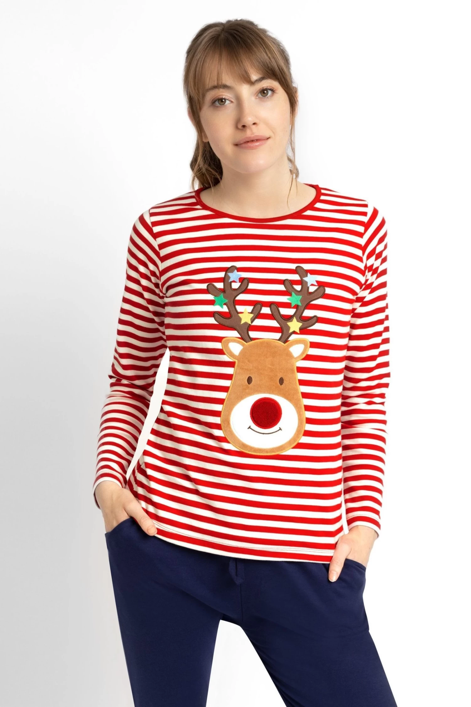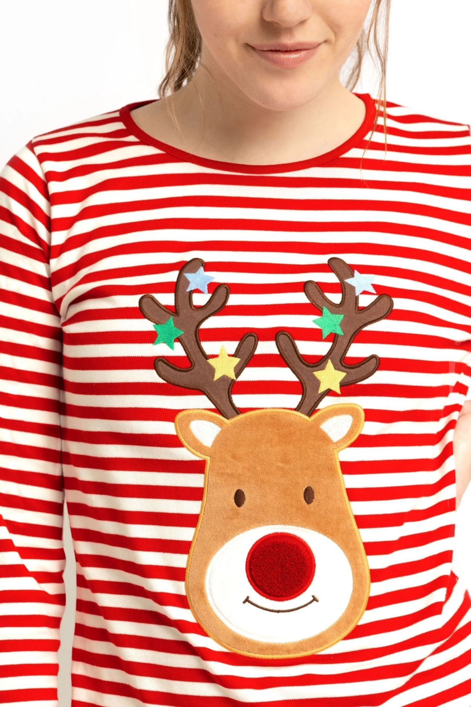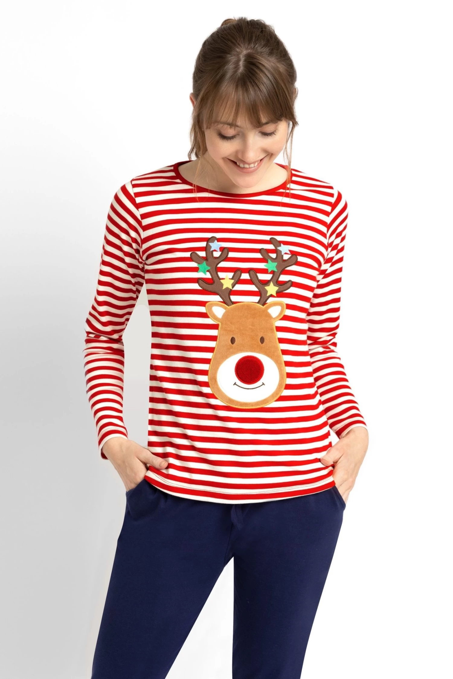 Our Women’s Red Reindeer Pyjama Set is perfect for keeping you cosy in the run-up to Christmas. The supersoft cotton top has a festive reindeer appliqué on a classic stripe, while the slim-fit navy bottoms will keep you warm and comfortable. Purchase for yourself or as a gift for a loved one. The set includes top and bottom. Soft, breathable cotton. Long sleeves. Round neck. Please note this pyjama set is a standard fit and has not been cut to fit maternity.