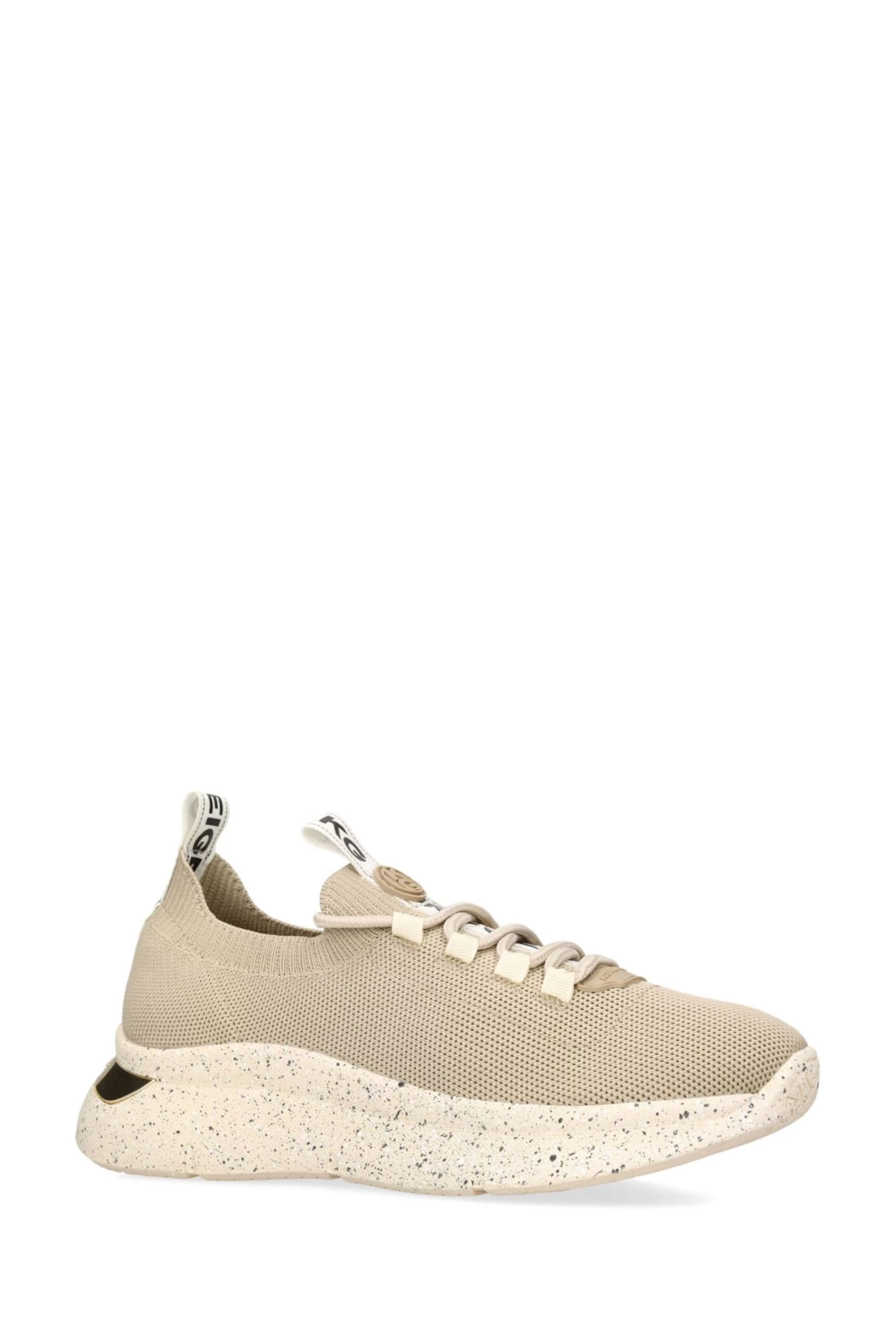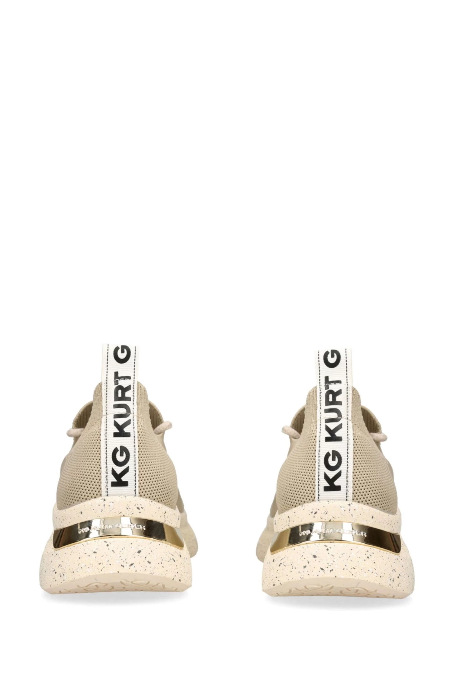 This Kaker Speckle trainer features a taupe knitted upper. The front laces up above a KG Kurt Geiger branded tab. The back of the ankle features a gold tone branded plate.