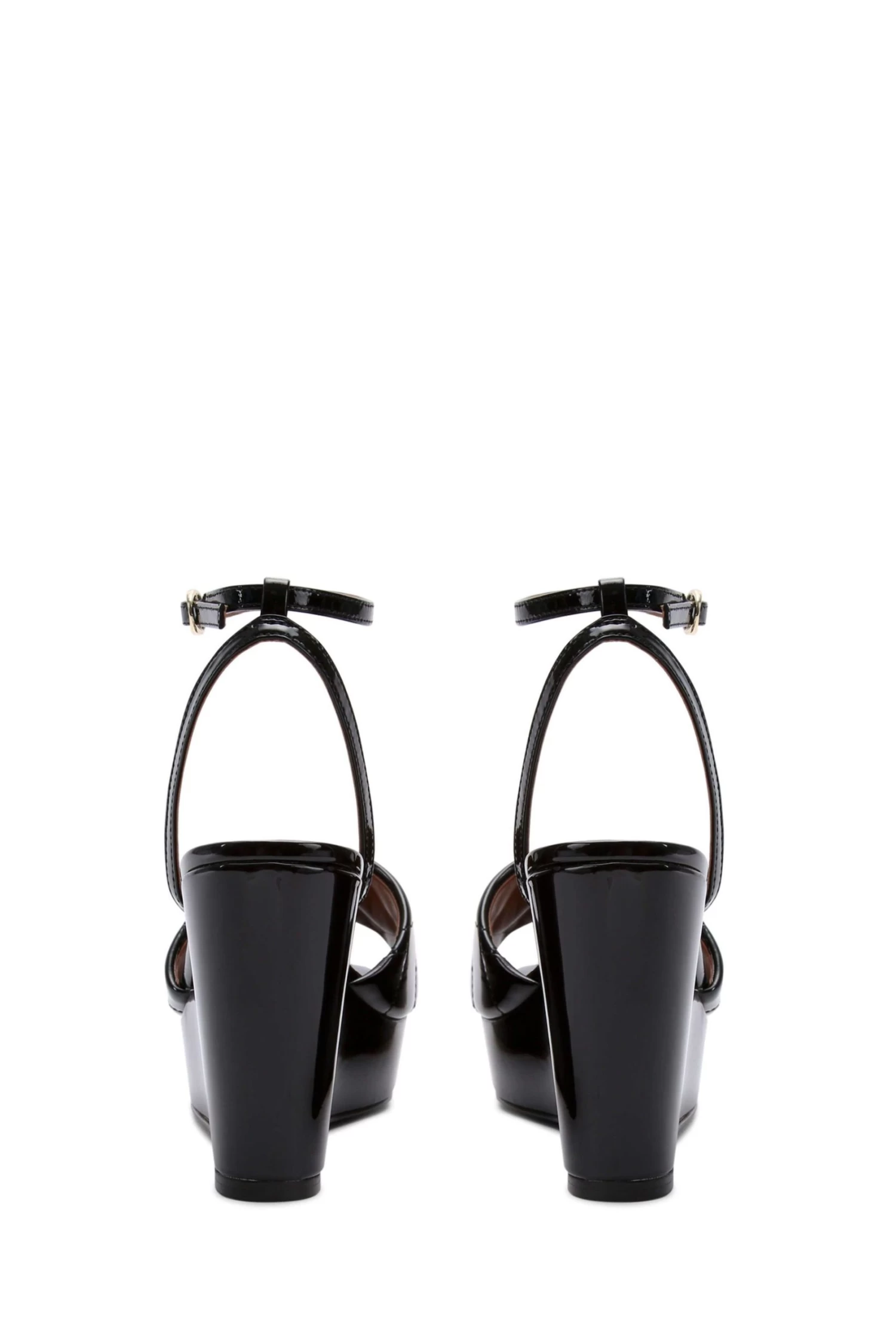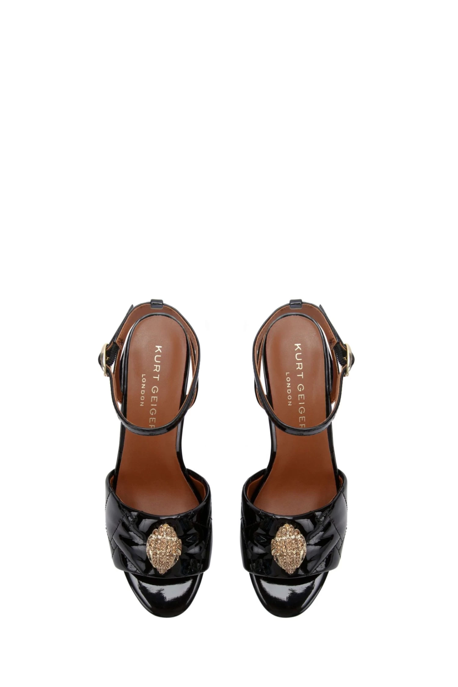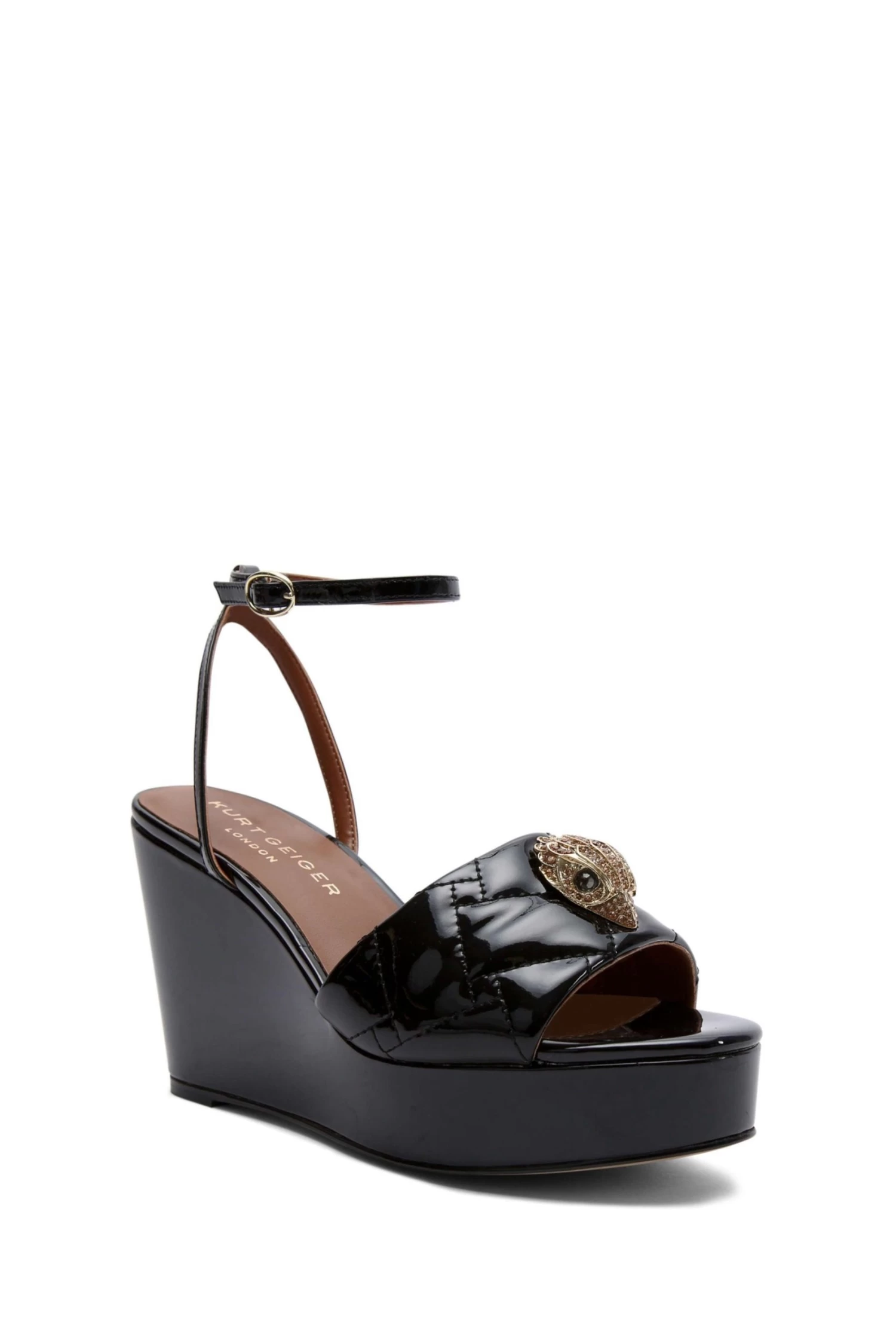 The Kensington Wedge, an addition to the iconic Kensington collection, is crafted from a patent leather. The gold Eagle head features brass crystals and black crystal eyes on the quilted strap. Heel height: 11.5cm. Platform height: 3cm. Pitch height: 8.5cm. Gold KGL stud on the outer sole.