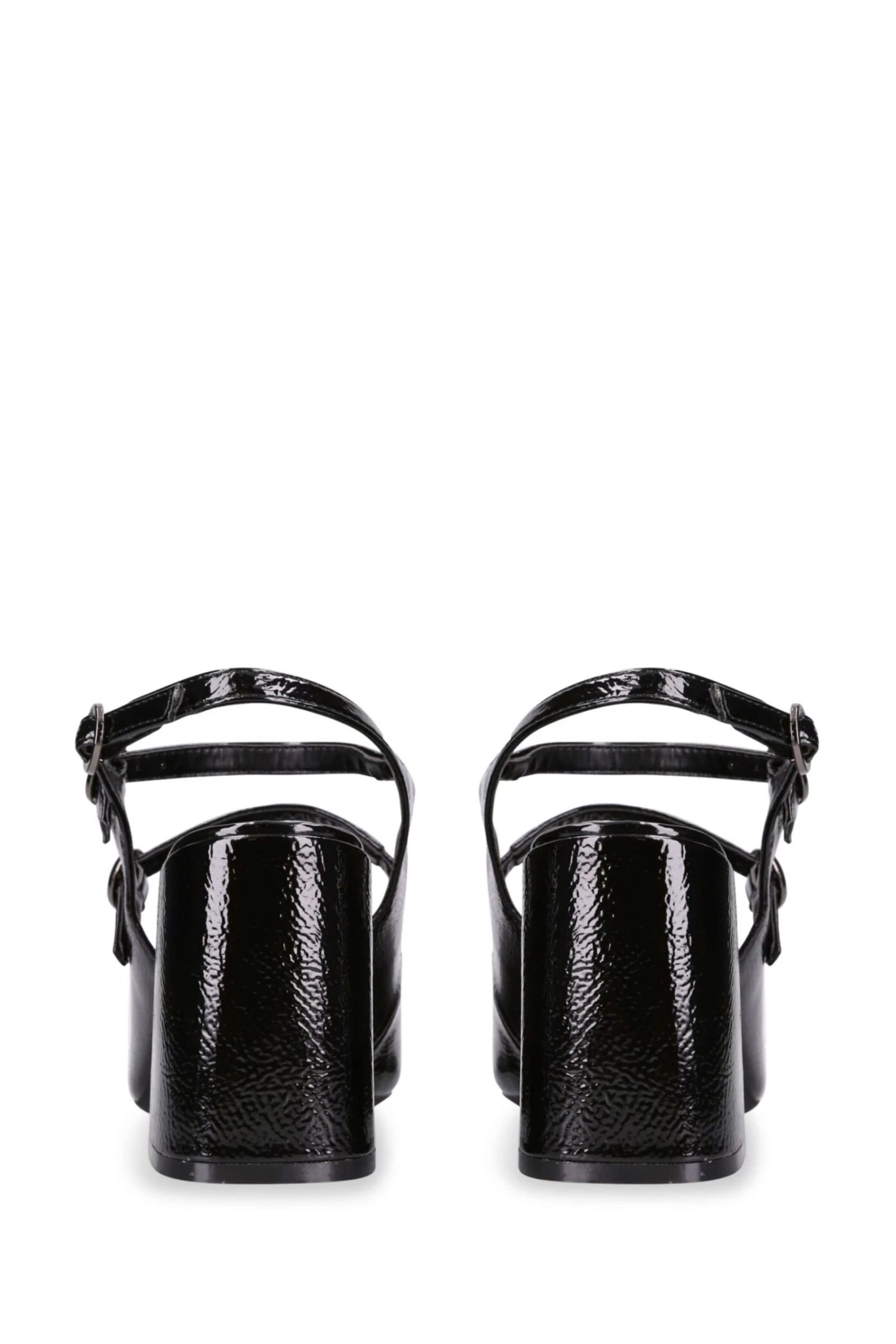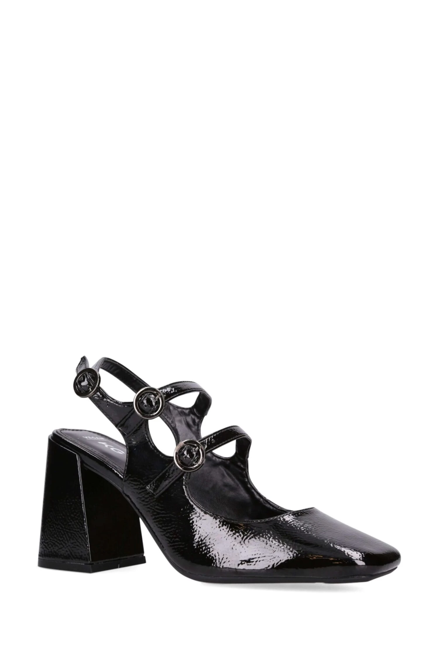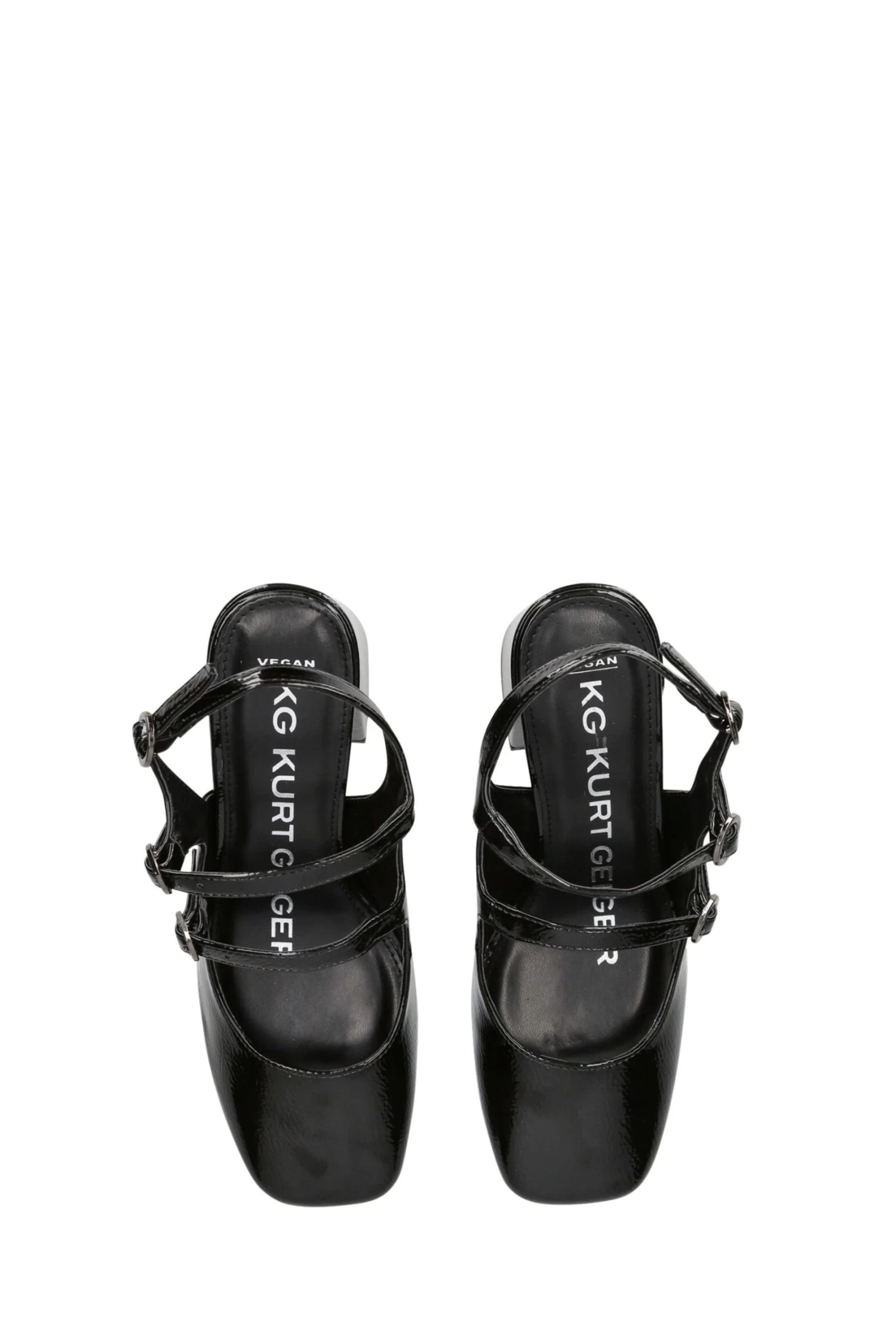 The Amelia is a Mary Jane-style shoe crafted in black patent. There are three buckled straps across the upper. Heel height: 8.5cm. This product is registered with The Vegan Society.