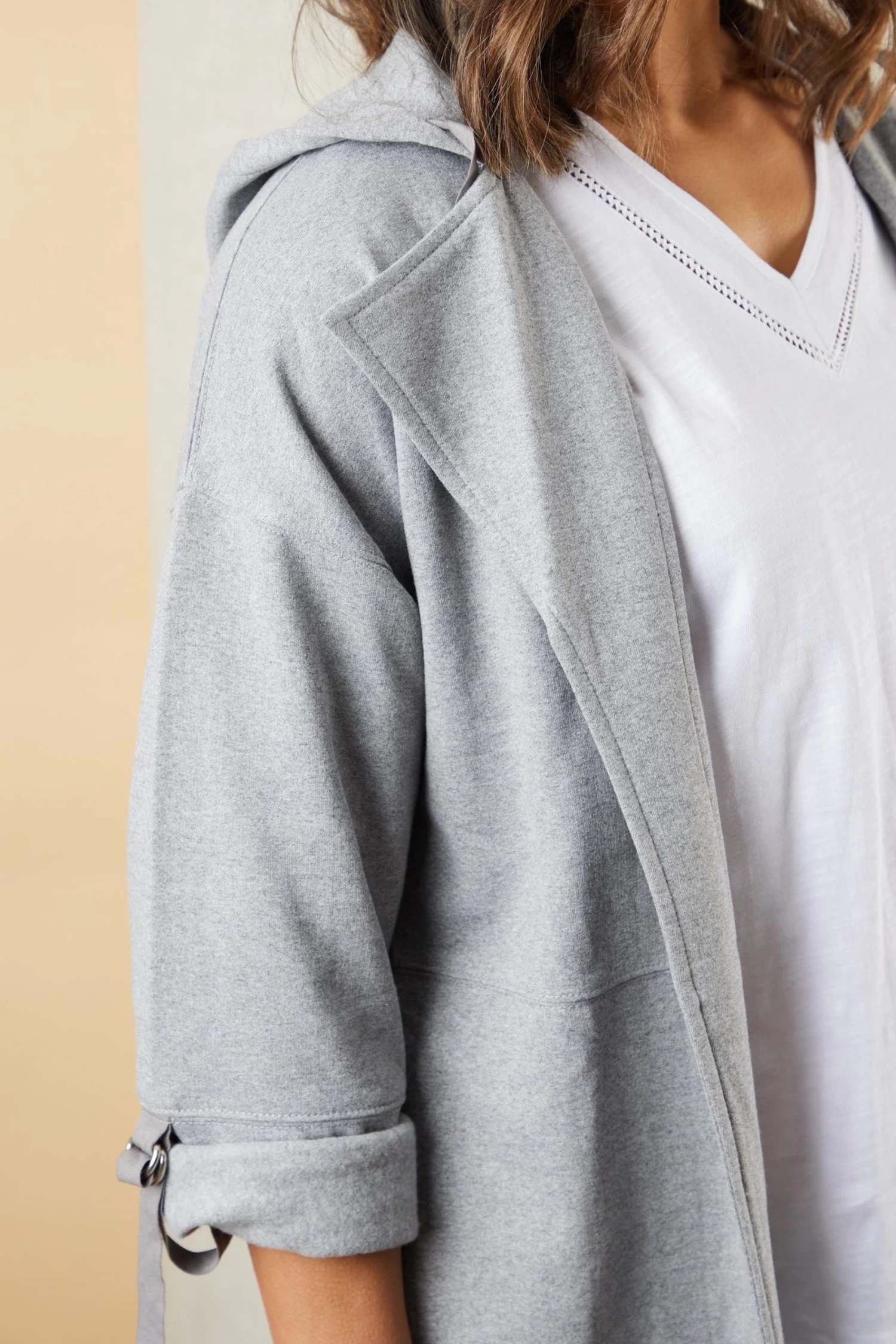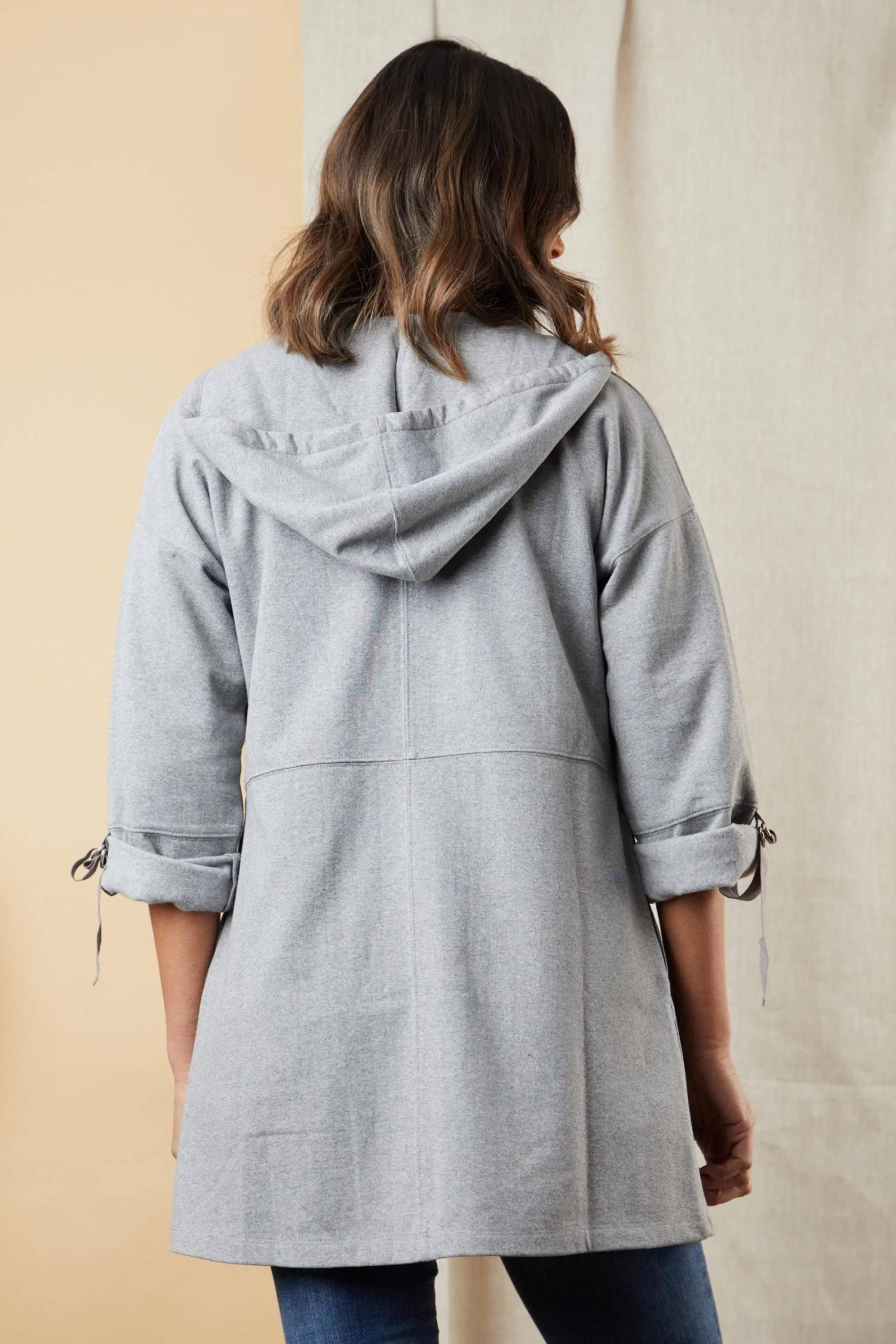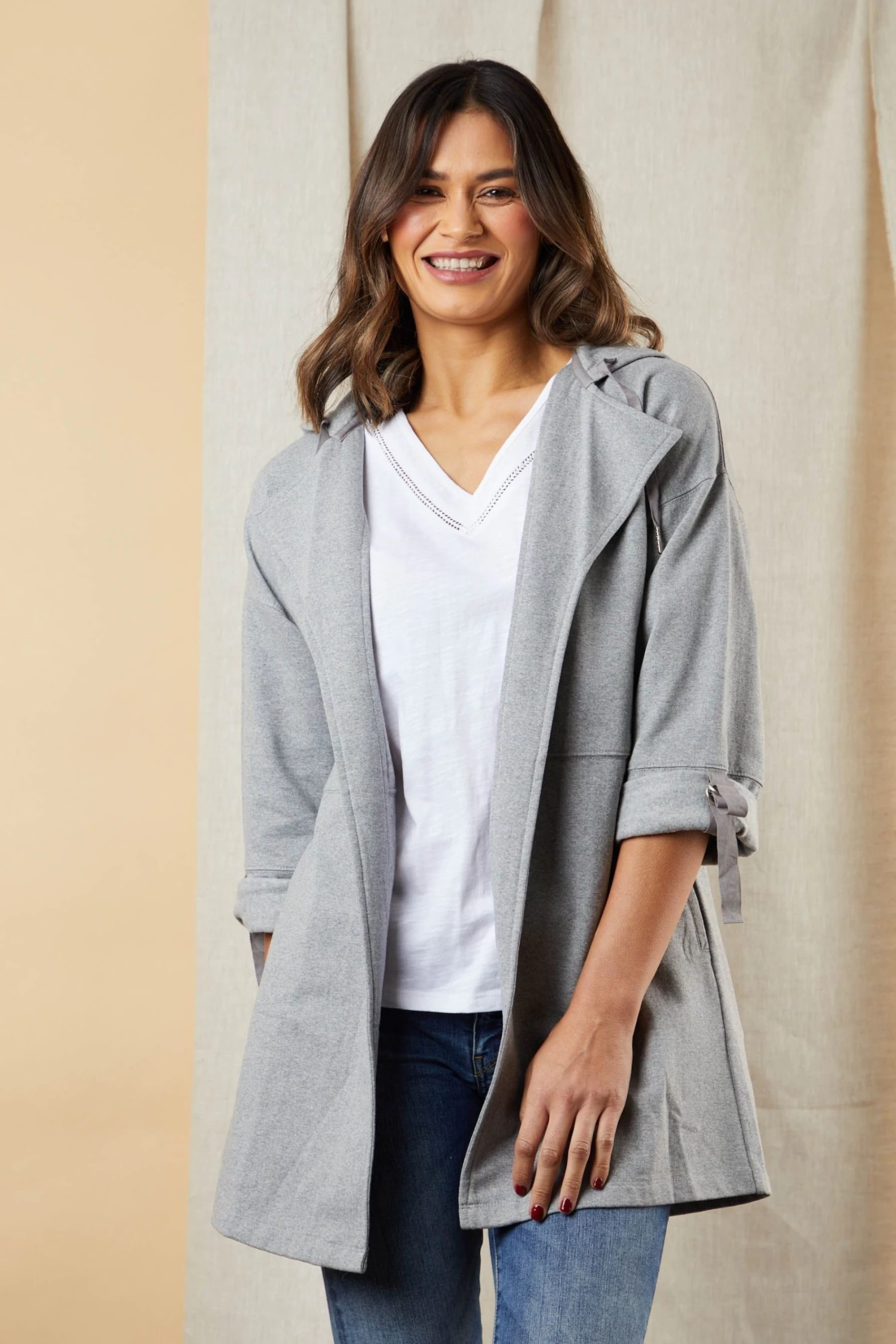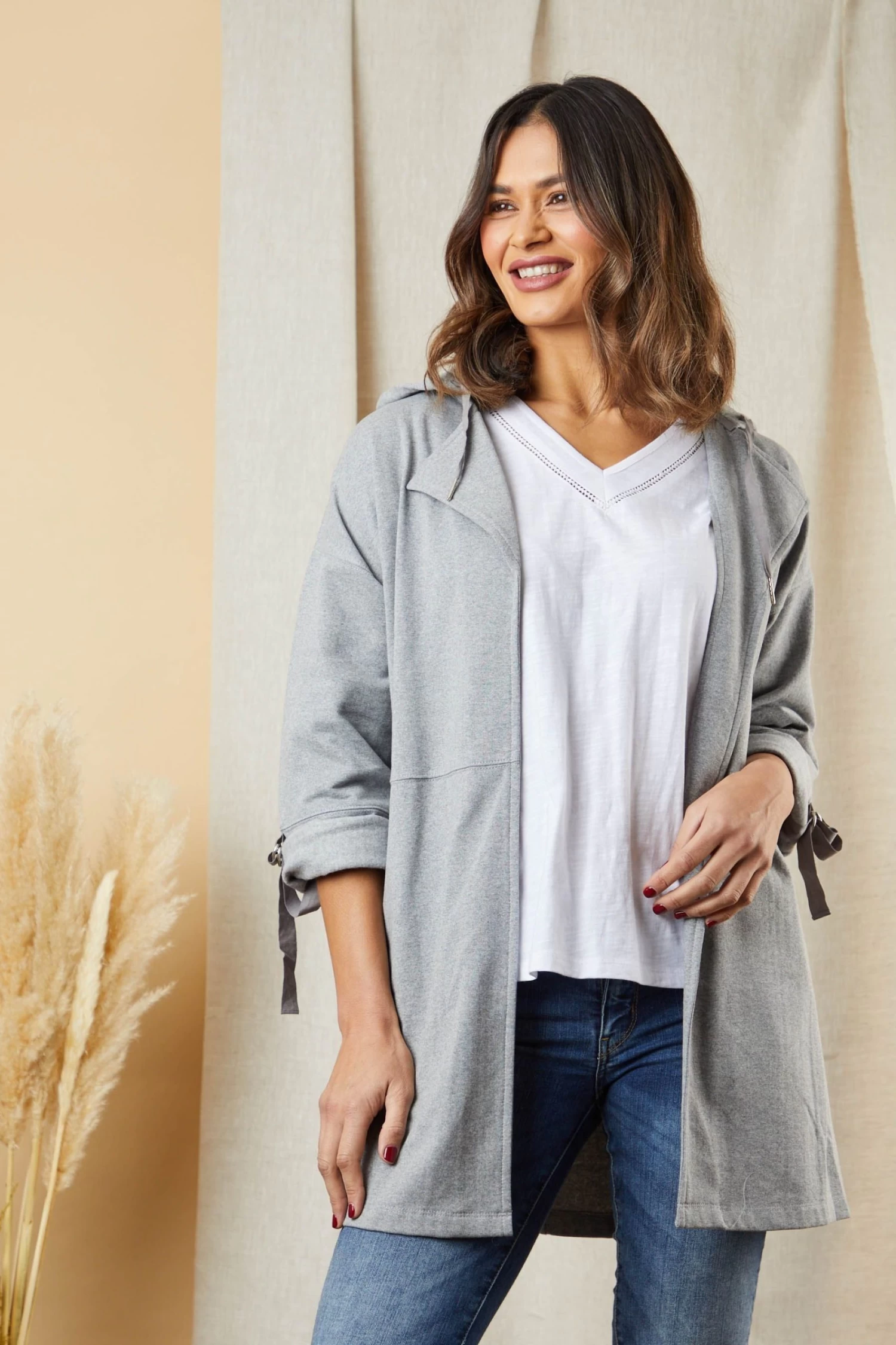 Refresh your casual collection with the Chloe jacket. Made from a soft cotton blend jersey fabric, this hooded jacket features a waterfall lapel front, drawstring hood and turned up sleeves with ribbon ties for a pretty finish. Style with leggings or jeans for a cool casual look.