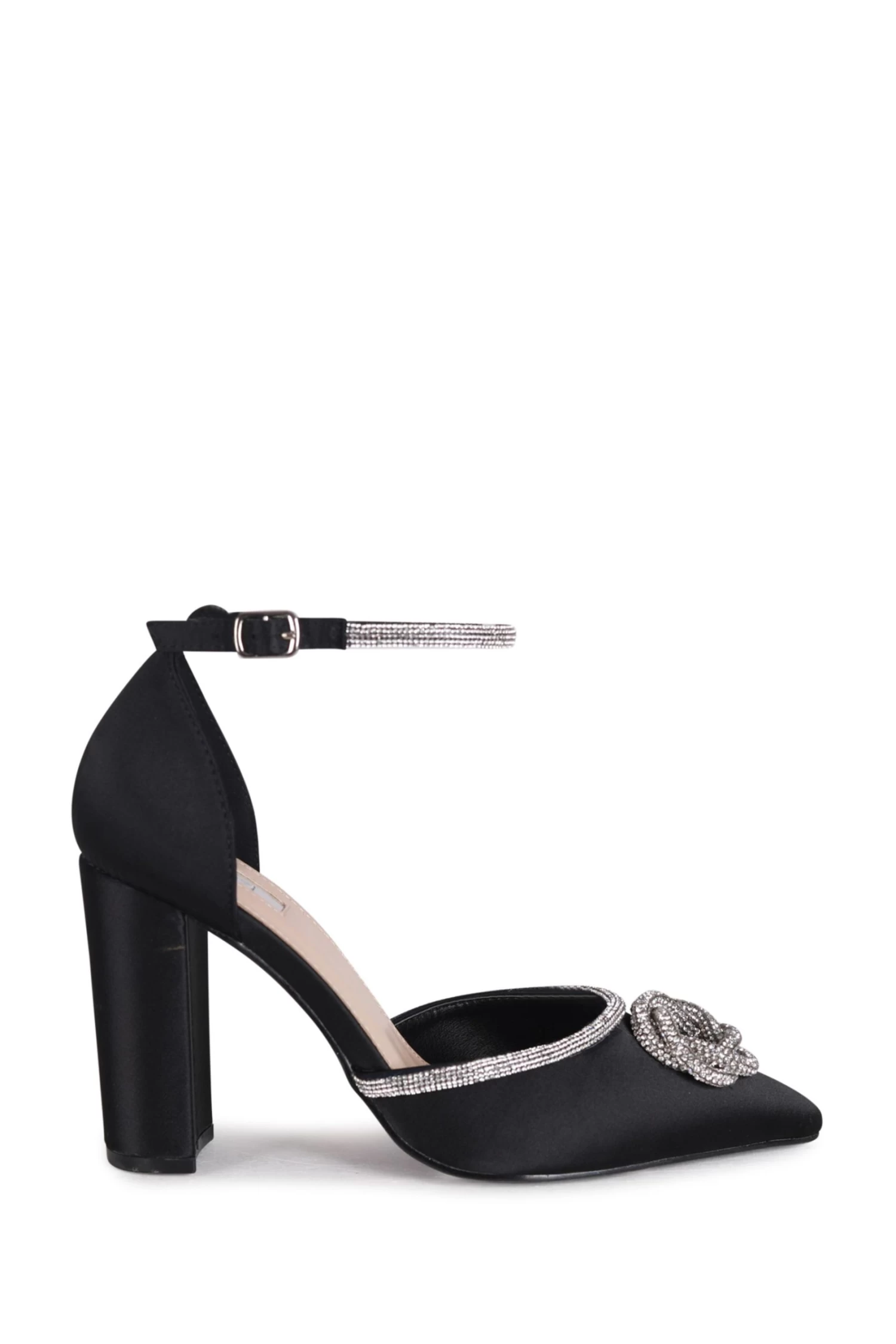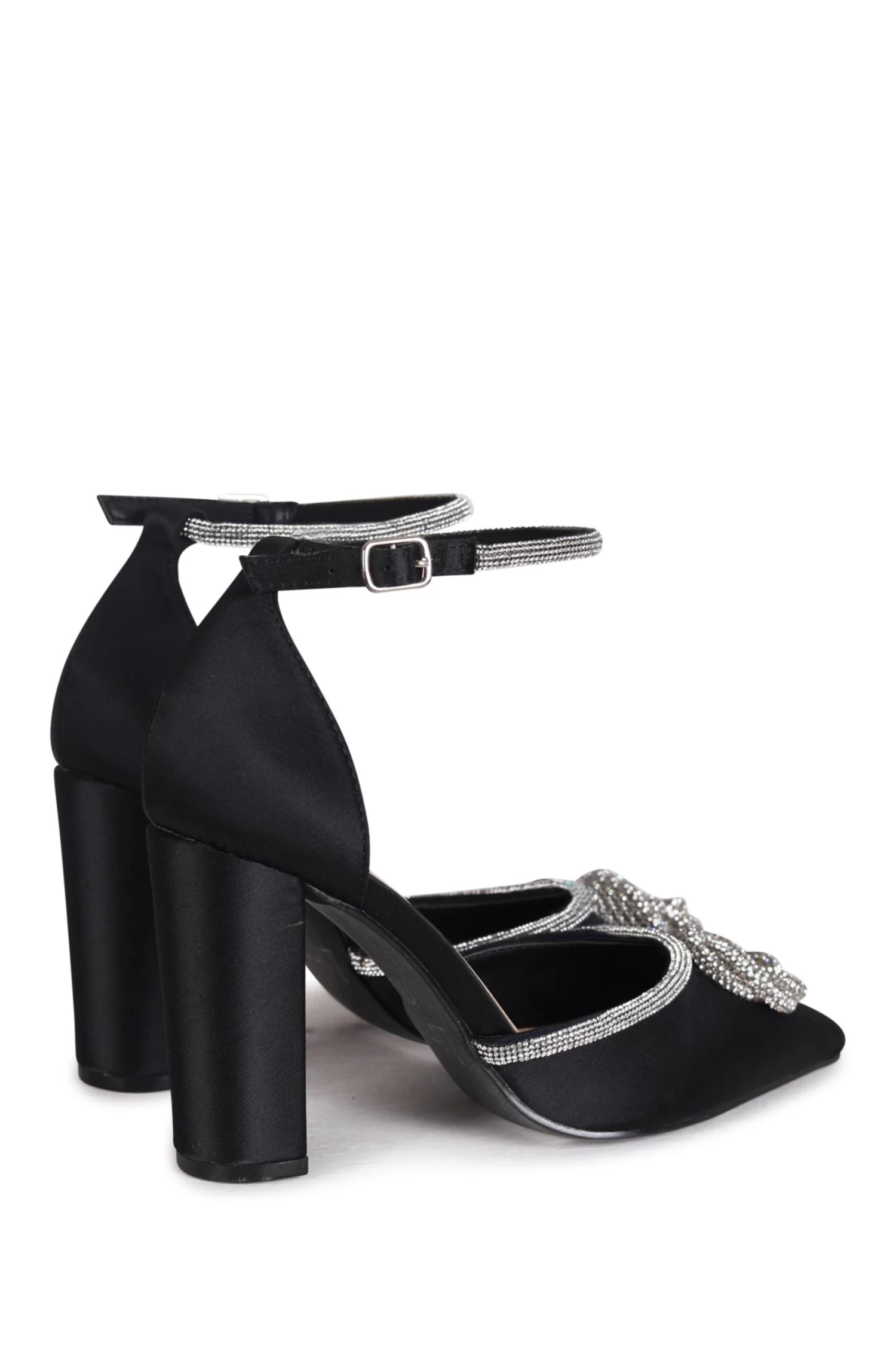 Court style block heel with diamante wrap ankle strap design and round diamante trim. Heel heigh 9.5cm.