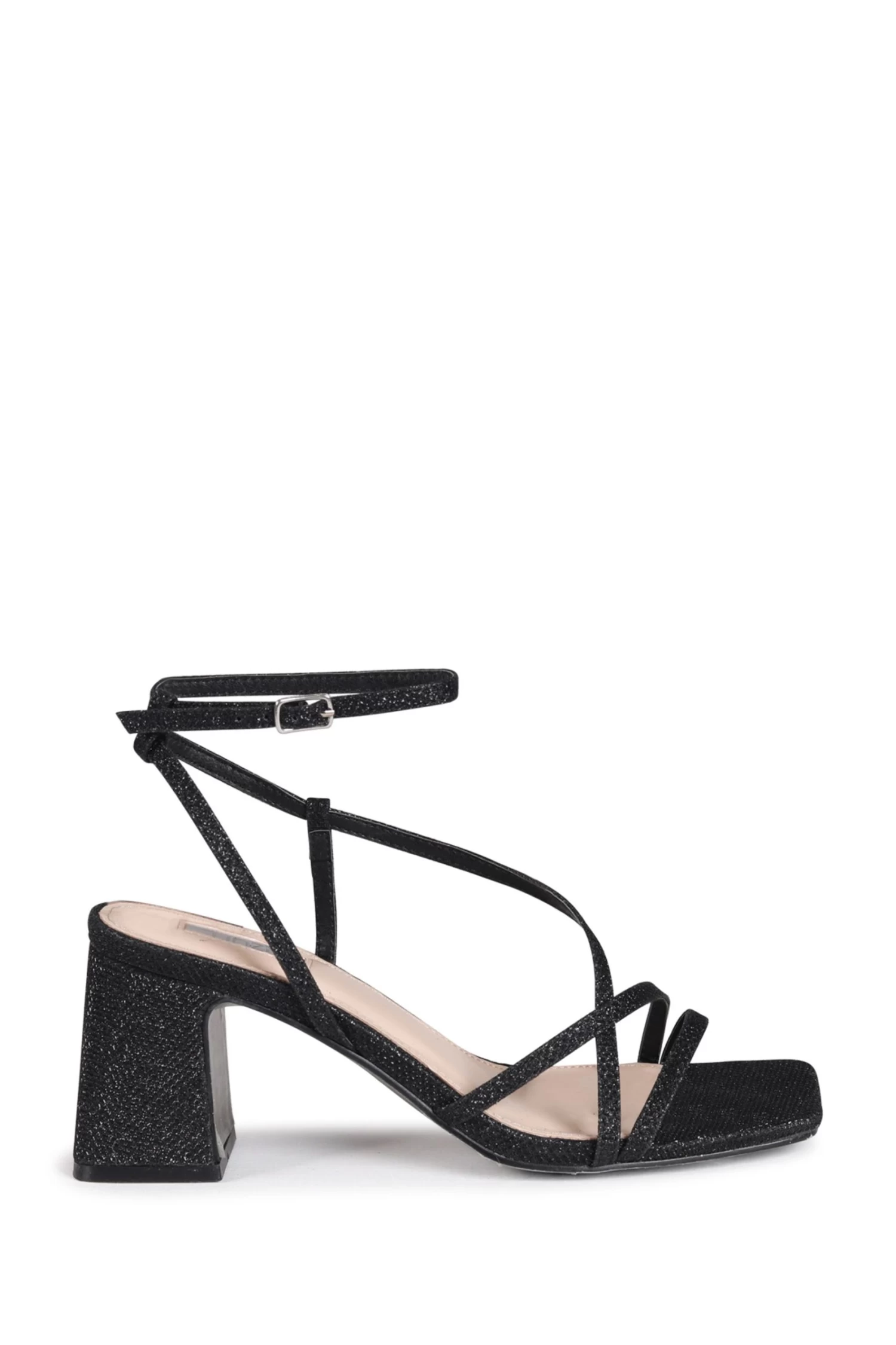 Open toe block heeled sandal with cross over front straps and sling back detail. Heel height 7cm.