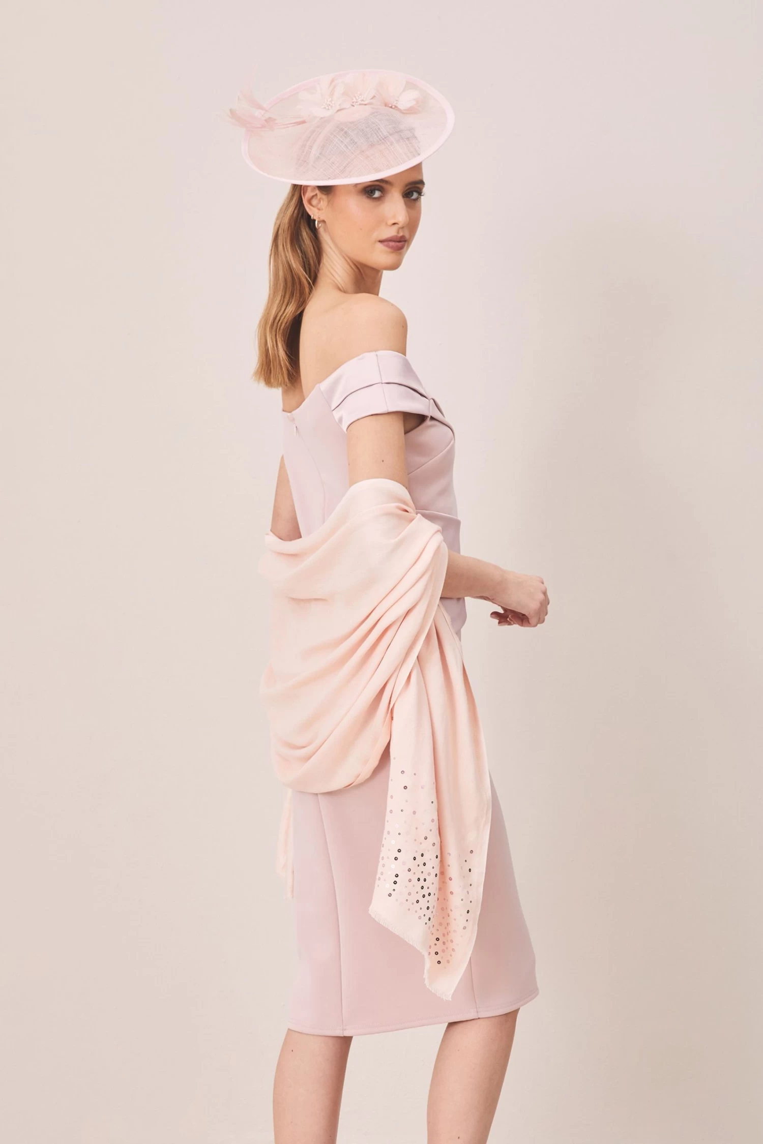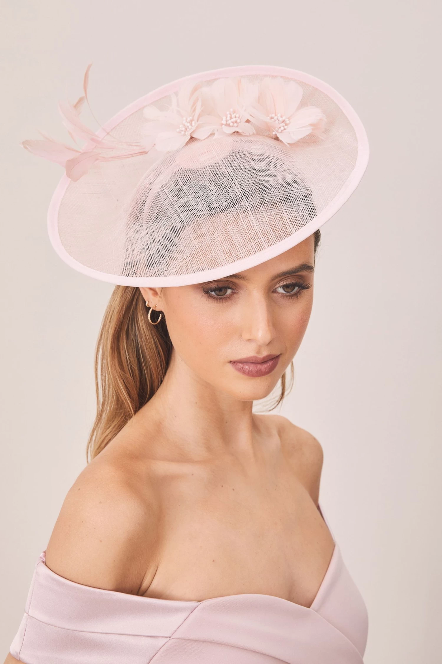 Round disc fascinator with flower detailing and headband for easy wearing. Perfect for weddings and occasions.