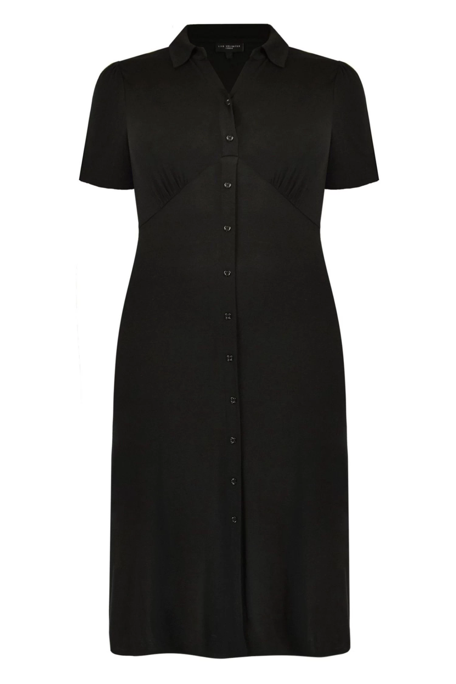 In classic black, this jersey shirt dress is the easiest piece to wear. Cut from a soft, stretchy jersey, it has short, gathered sleeves and a swingy, A-line shape that’s designed to flatter and moves beautifully. Its classic shirt-style detailing and non-functional button-through front create a lengthening effect, making this the easiest piece to dress up or down, depending on your plans.