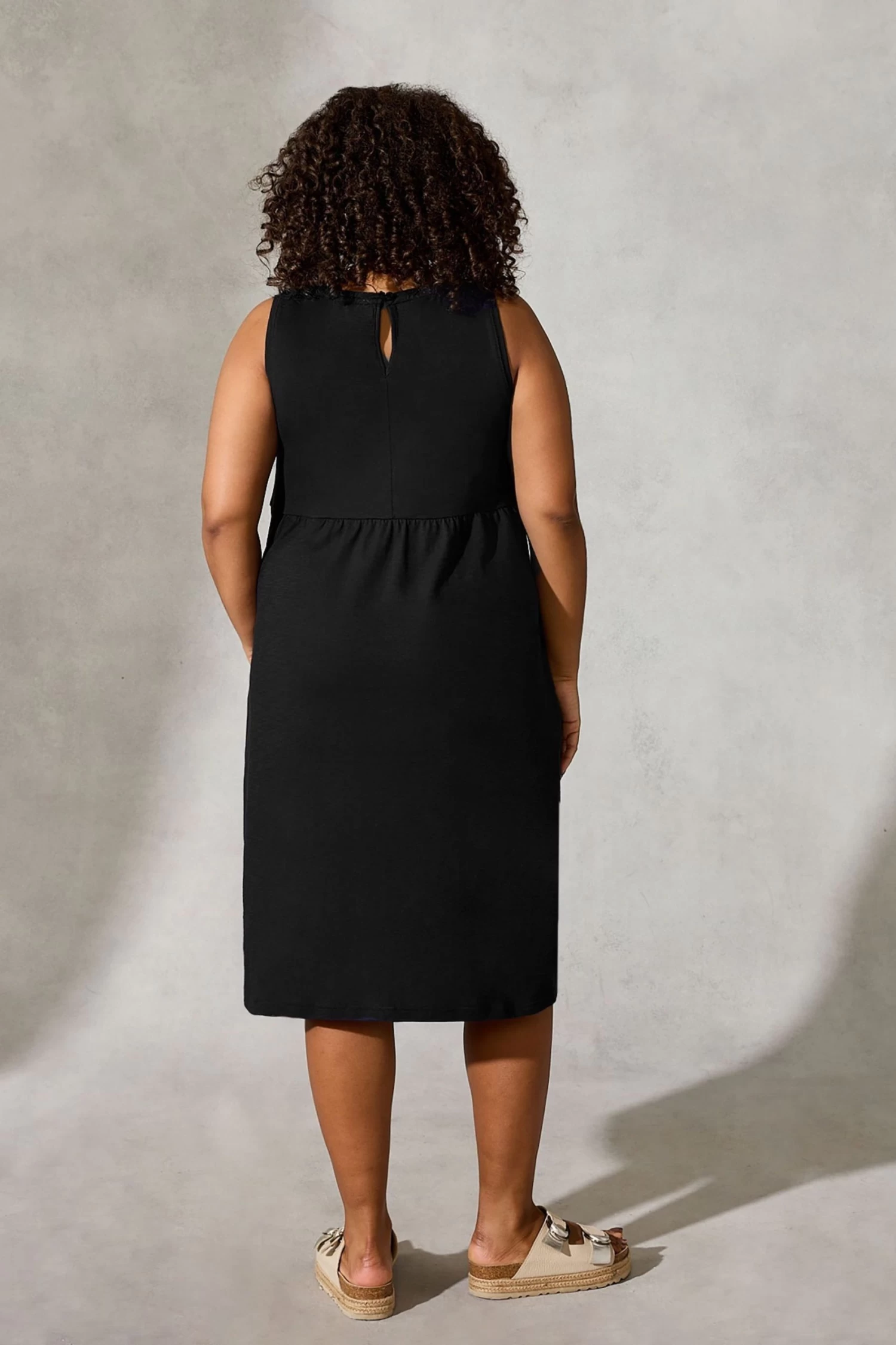 In classic black, this tiered midi dress is cut from textured cotton that s soft and cool to wear. With a sleeveless, tiered shape that s endlessly flattering, it has a scoop neckline, empire seam waist and keyhole button fastening at the back neck. Pair this with sandals or trainers for the most effortless warm-weather outfit.