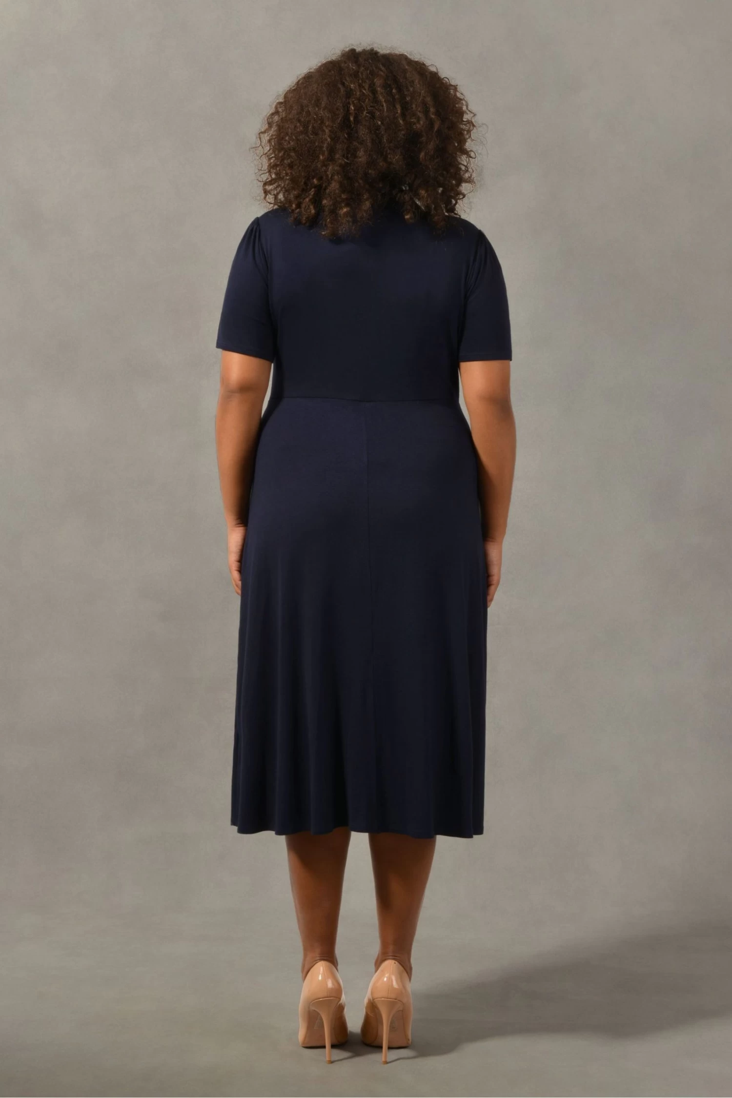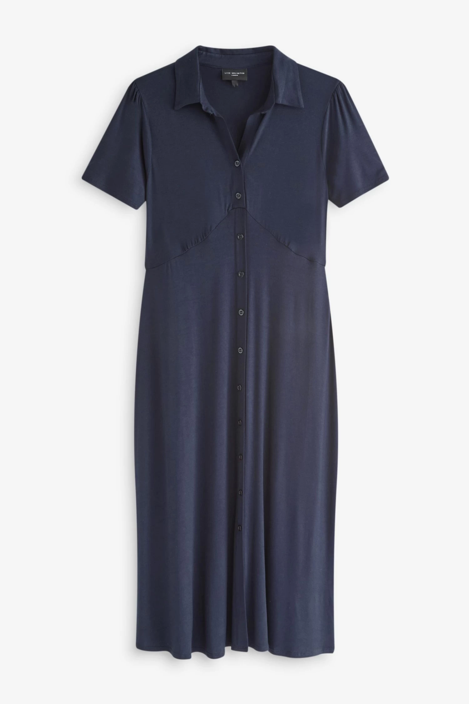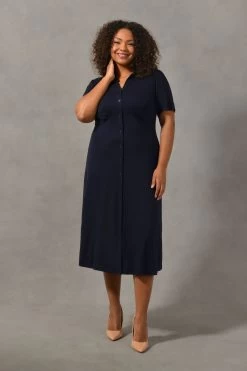 In stylish navy, this jersey shirt dress is the easiest piece to wear. Cut from soft, stretchy jersey, it has short, gathered sleeves and a swingy, A-line shape that’s designed to flatter and moves beautifully. Its classic shirt-style detailing and non-functional button-through front create a lengthening effect, making this the easiest piece to dress up or down, depending on your plans.