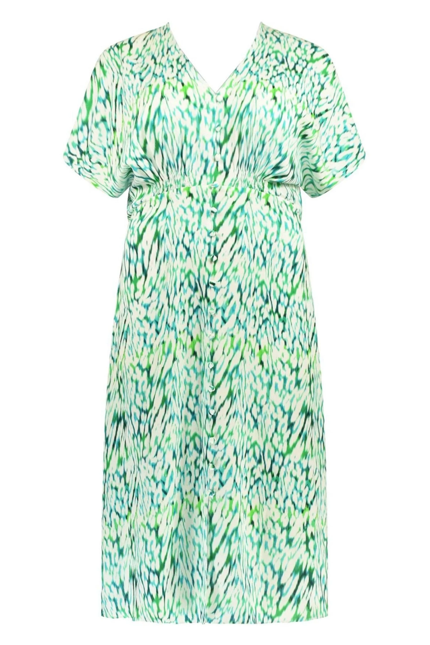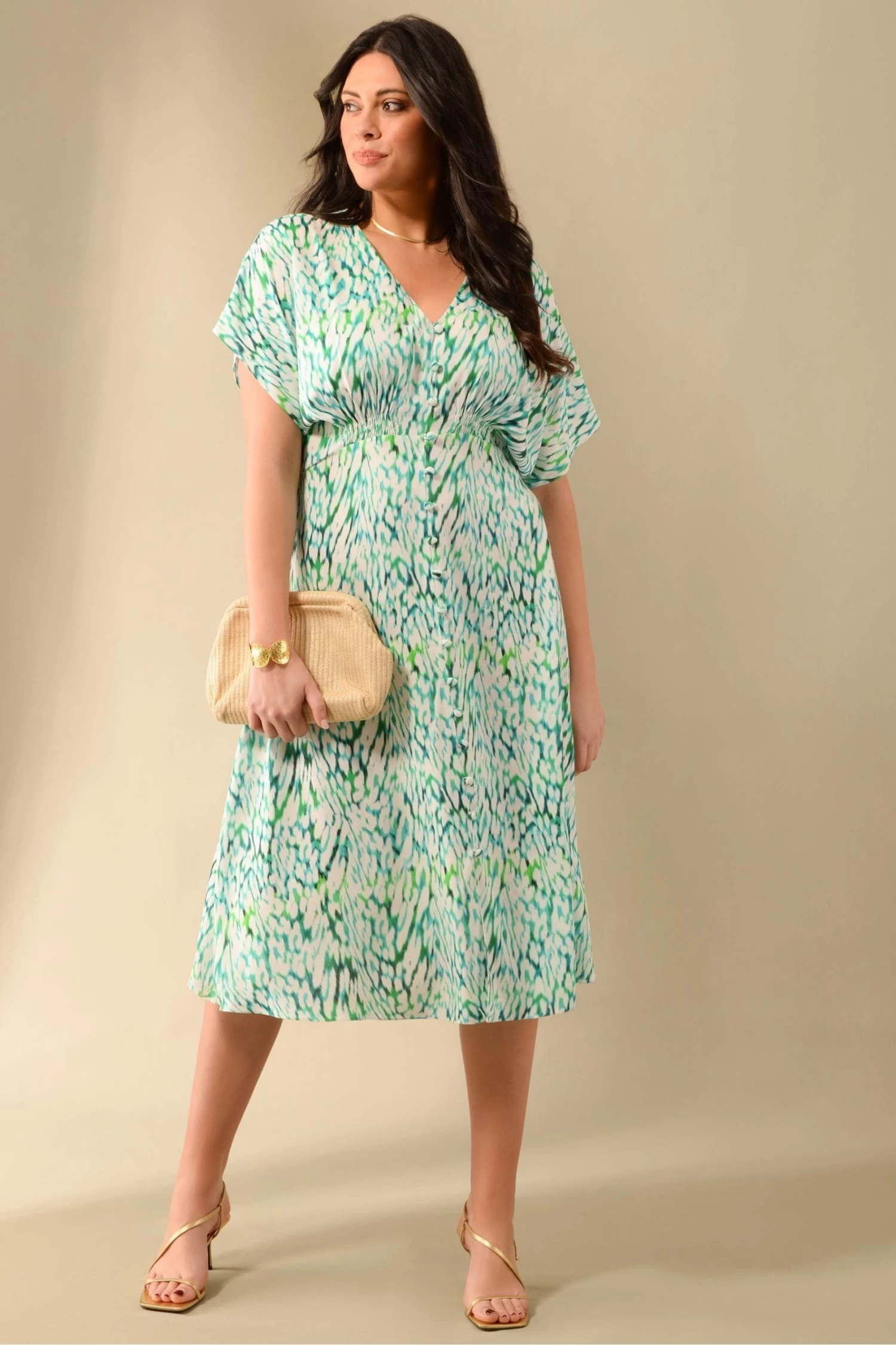 Printed all over with a stunning green and blue animal print, this dress is cut from a soft woven fabric that will keep you cool in warmer weather. With a lengthening V-neck enhanced by non-functional covered buttons down the centre front of the dress, it has elbow-length batwing sleeves, and a panel of shirring at the back which combine to create a flattering silhouette.