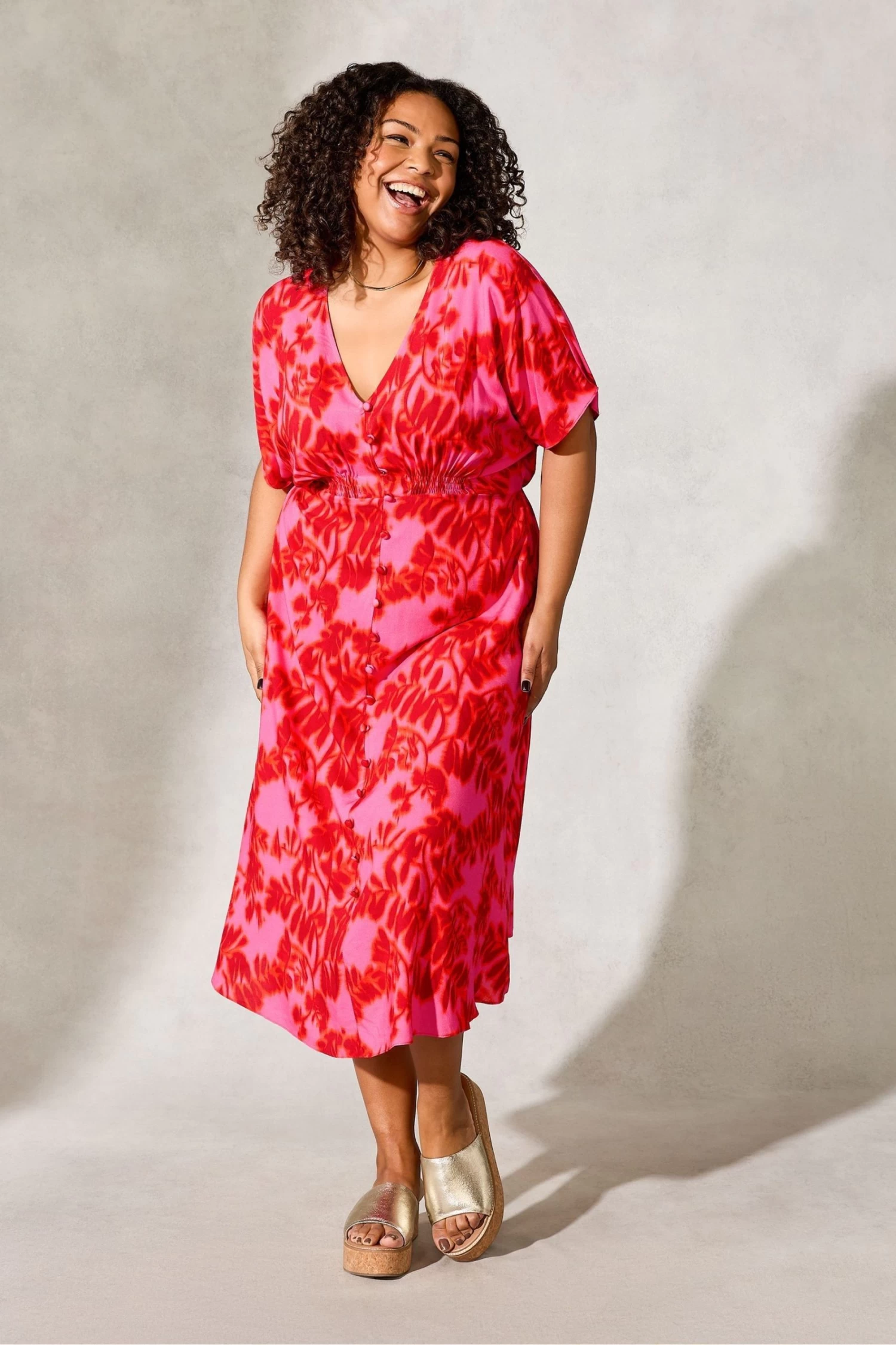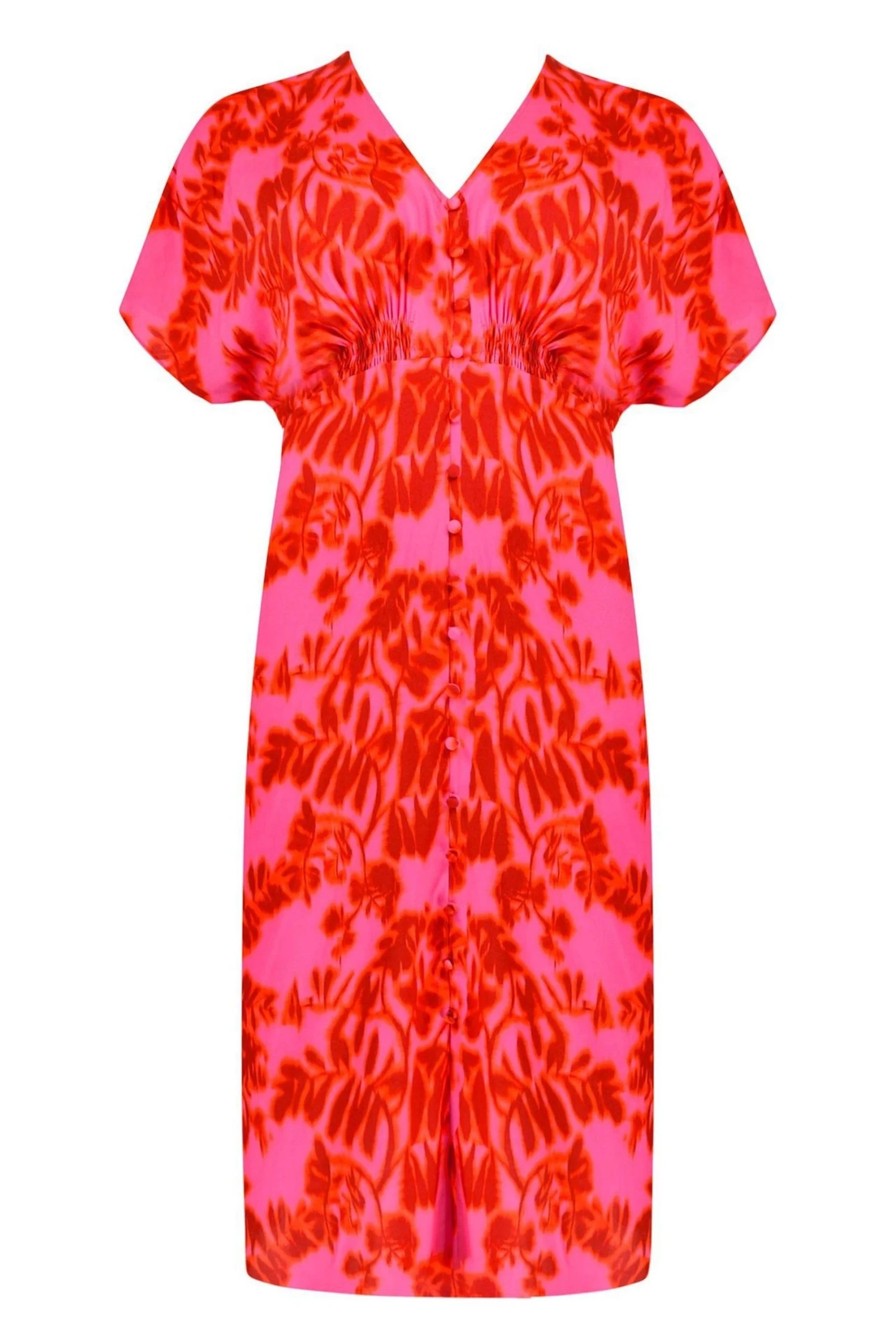Printed all over with an abstract red and pink floral print, this dress is cut from a soft woven fabric that will keep you cool in warmer weather. With a lengthening V-neck enhanced by non-functional covered buttons down the centre front of the dress, it has elbow-length batwing sleeves, and a panel of shirring at the back which combine to create a flattering silhouette.