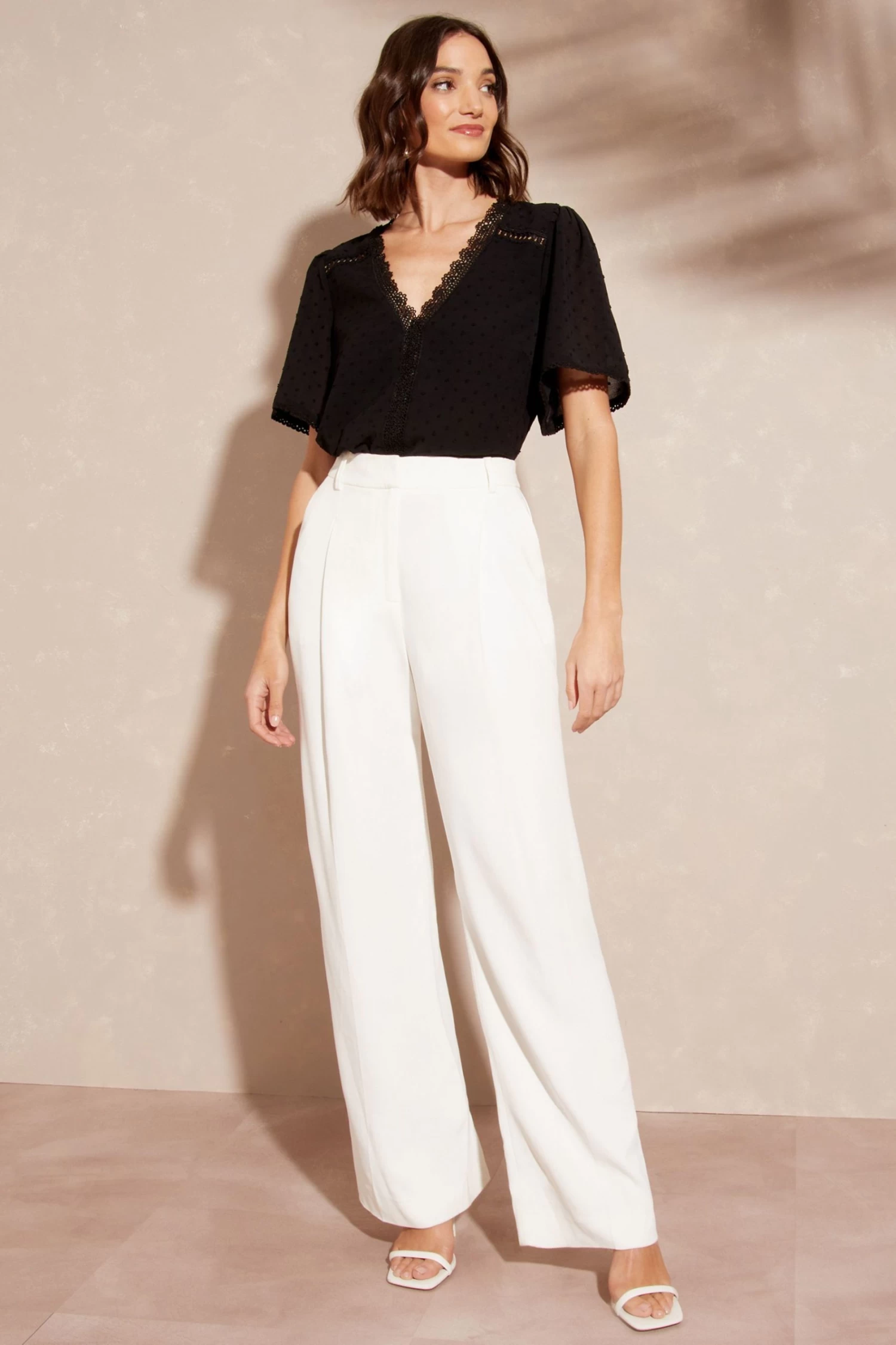 V neck blouse with angel sleeves and lace trim details in our gorgeous dobby fabrication.