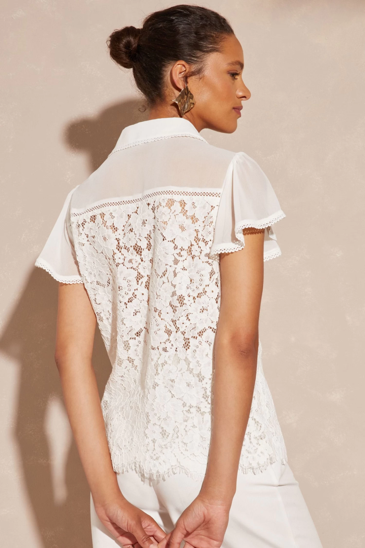 Flutter sleeve shirt with chiffon sleeves and lace bodie and lace trim details.