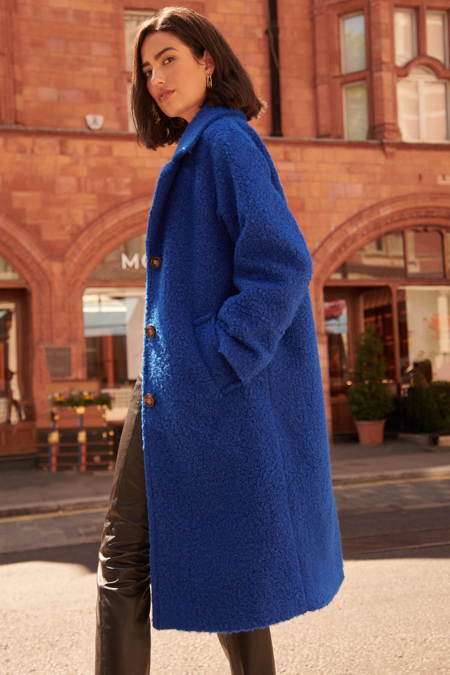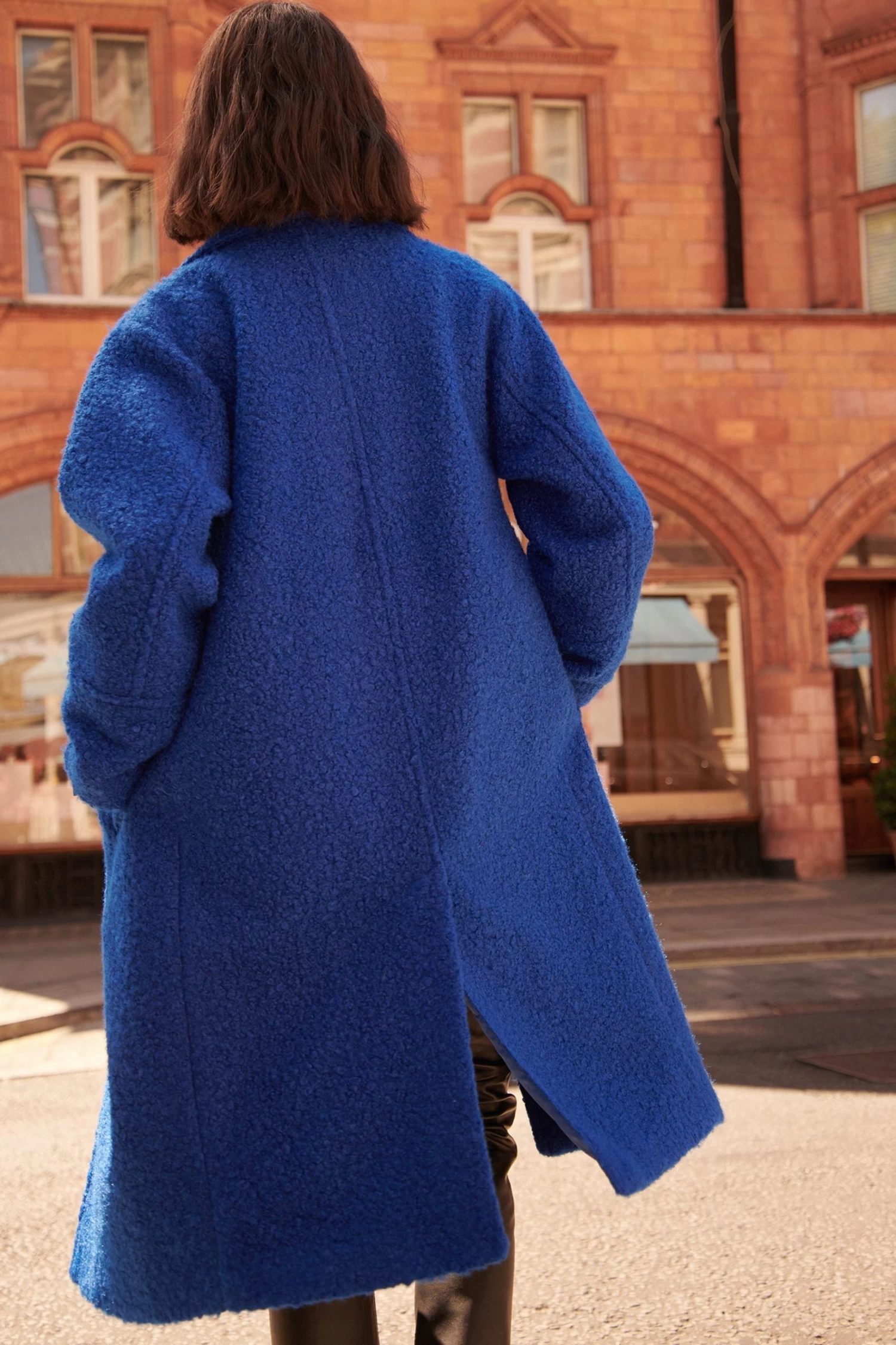 Bright boucle longline coat with horn buttons and oversized lapel.
