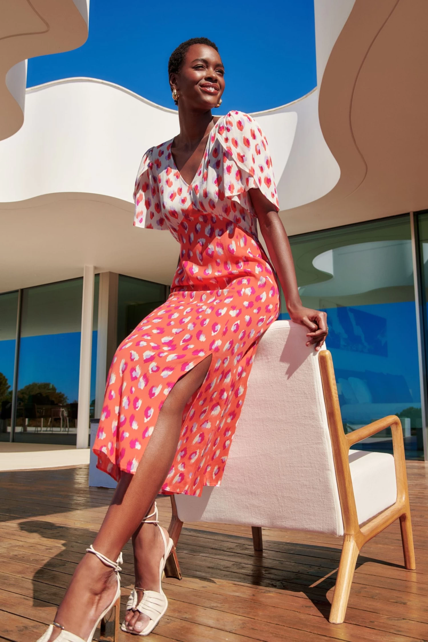 Printed empire midi dress with a skirt slit and petal sleeve detail.