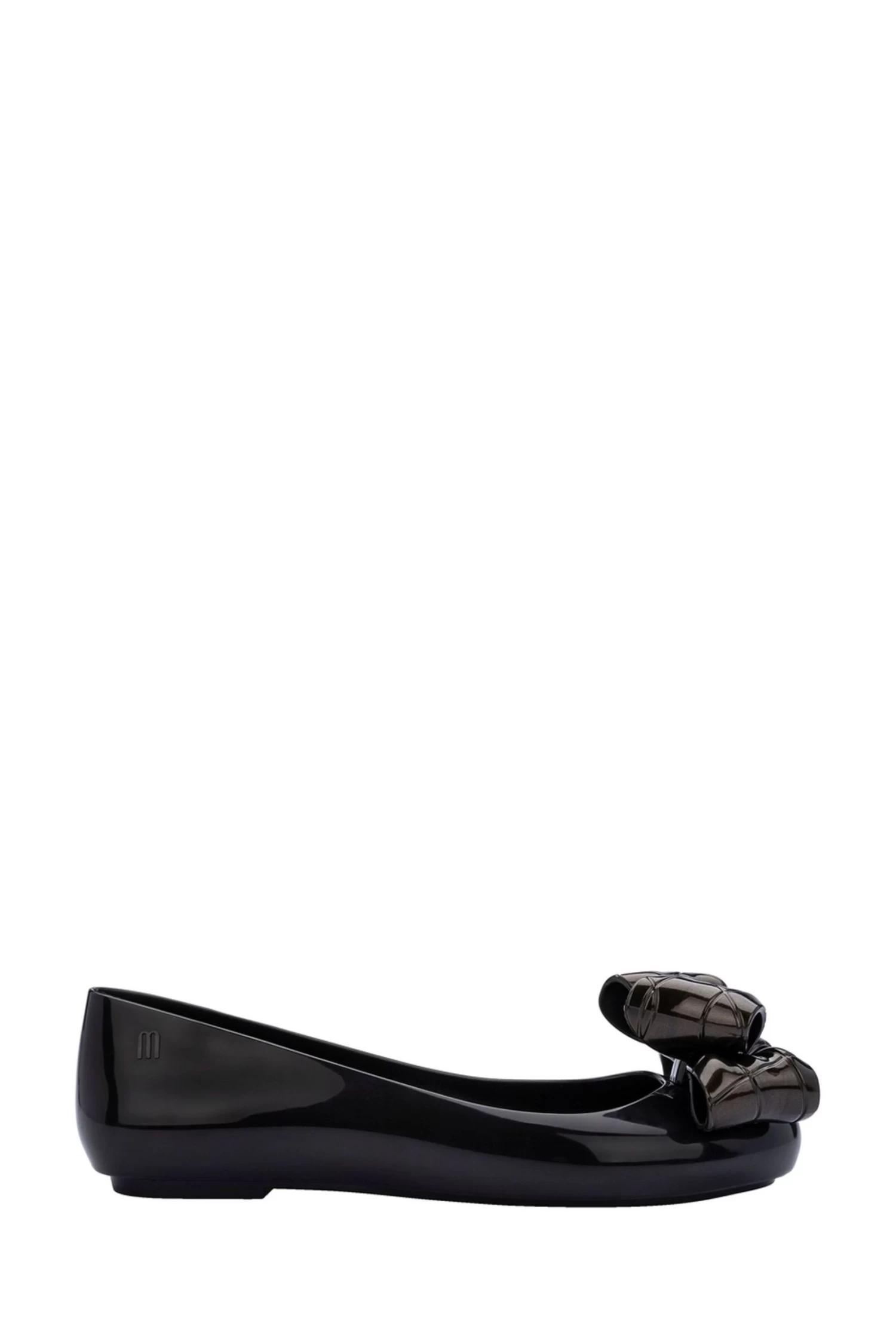 Melissa’s Sweet Love has become a front-runner in terms of a classy, reliable flat, with high potential for upgrades – and this certainly is an upgrade! A luxuriously quilted, supersoft footbed, and quilting effect in the fabric-look bow adornment give this version high desirability! This is the classic Black.