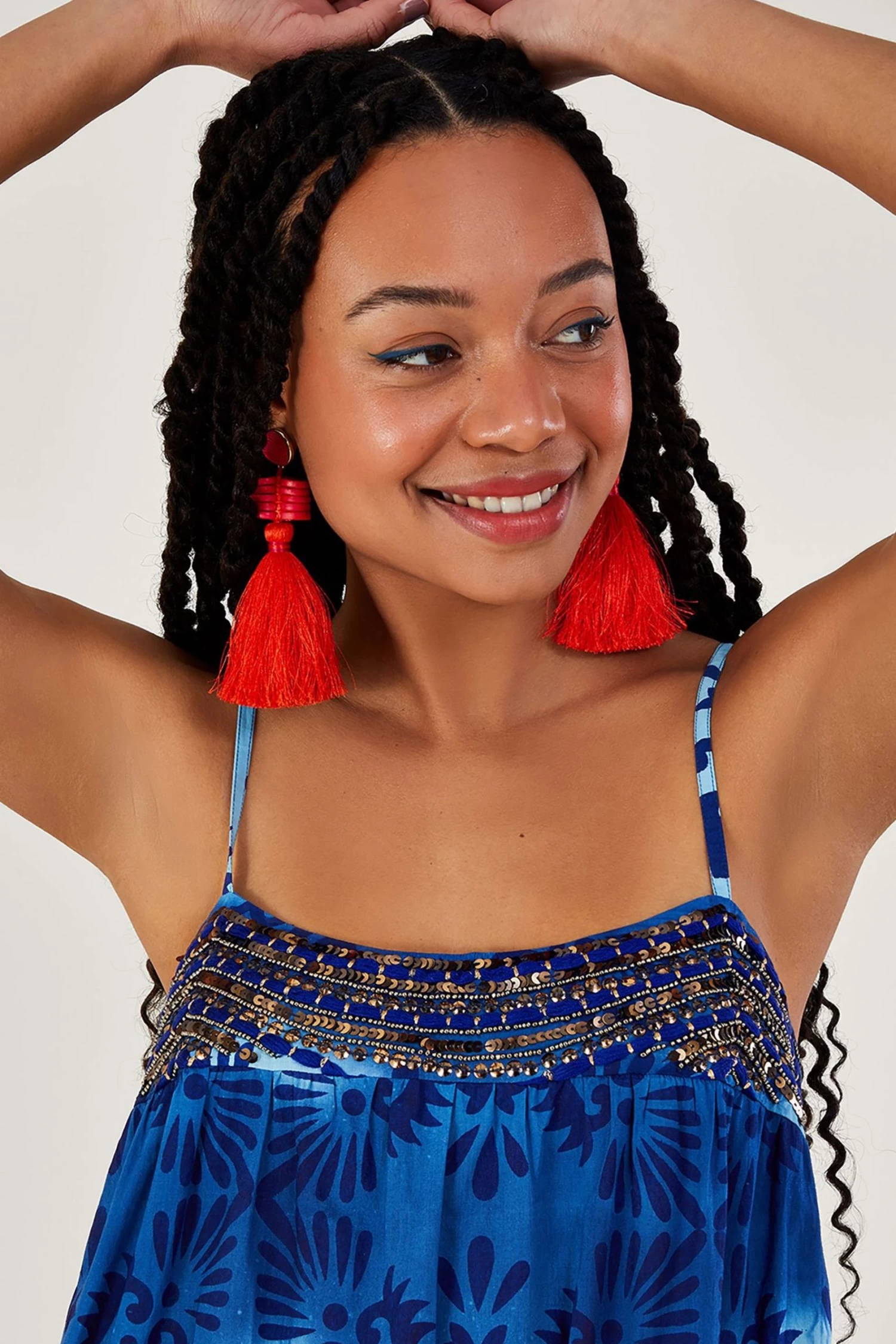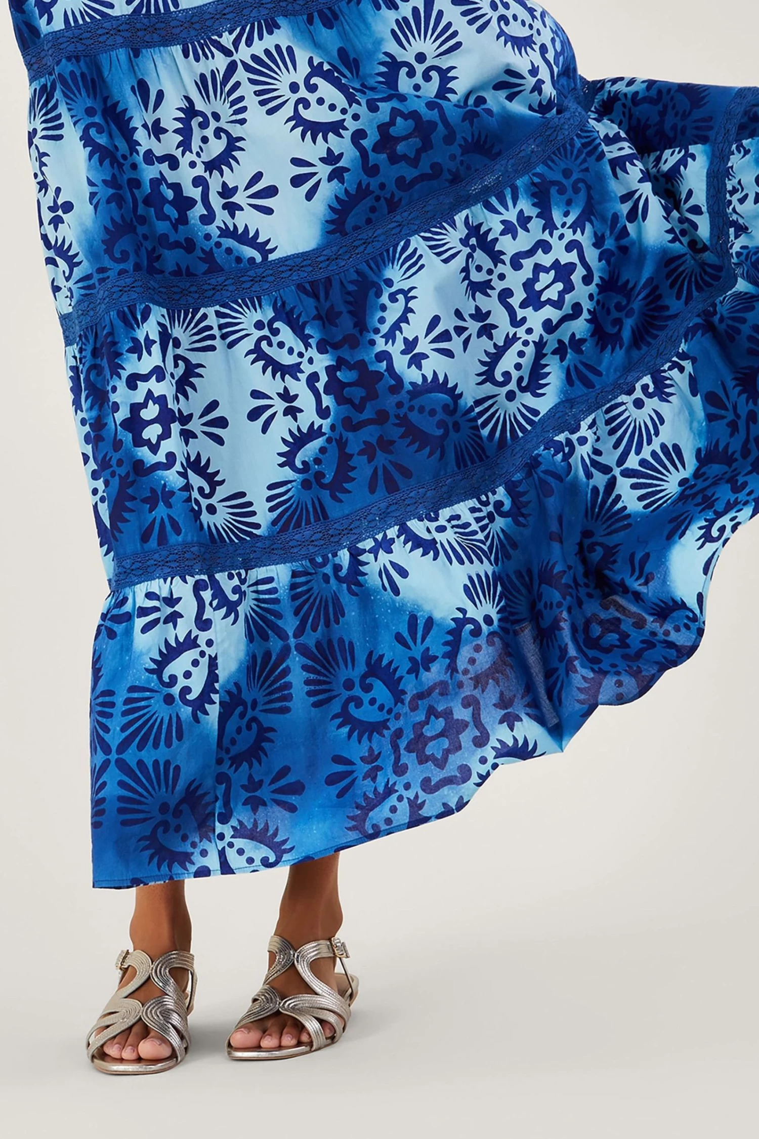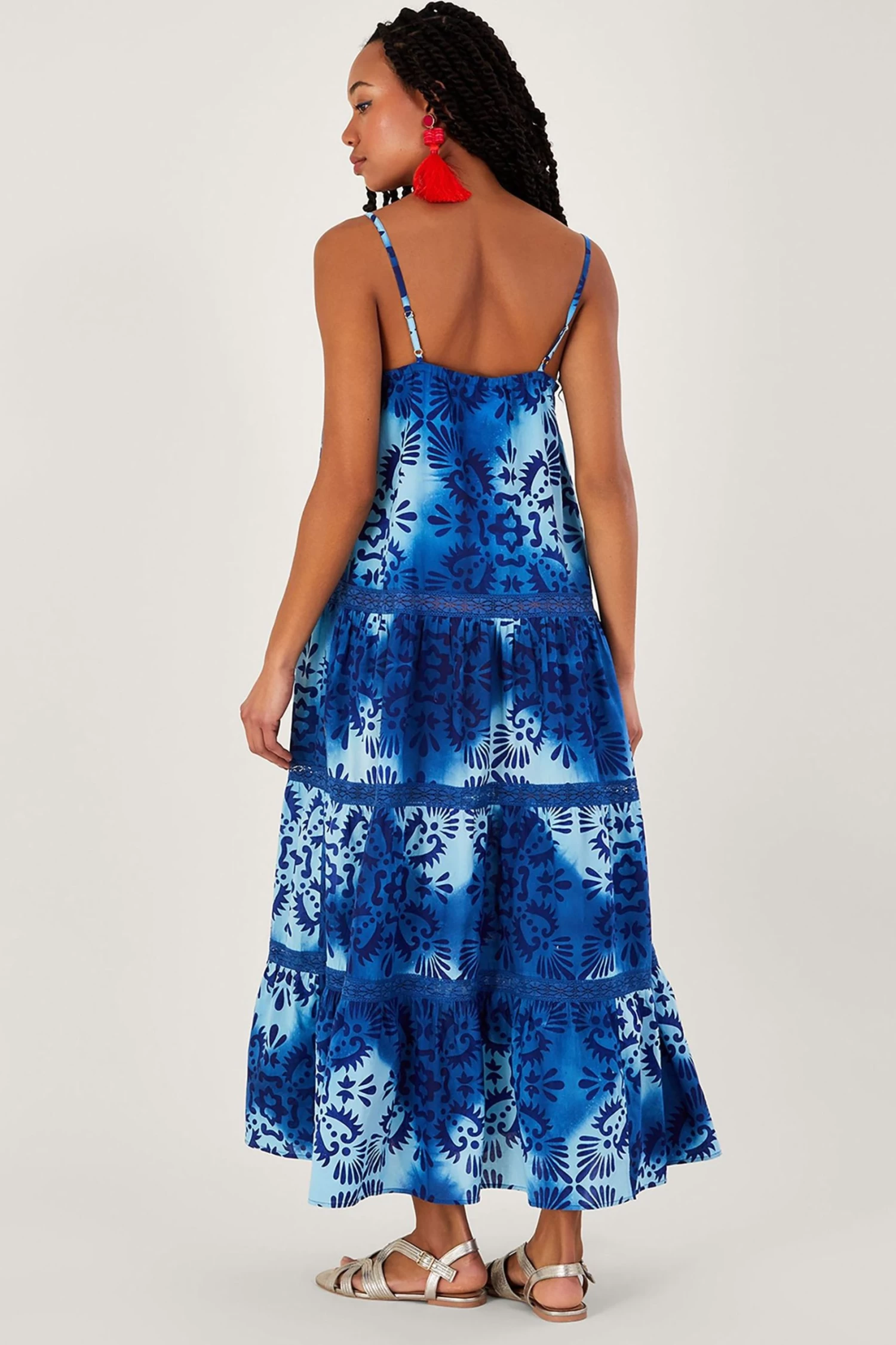 Suitably flowy for breezy summer days, this dress is decorated with a tile batik print and embroidered tiering that runs through the midi skirt. The neckline is embellished with gold-tone beading and sequins for a bit of sparkle under the summer sun, with fine shoulder straps that create a cami-style bodice. Due to the artisanal nature of Batik tie dye, variation in print may occur. As part of the journey to make our clothes kinder to the world around us, this item was made using more sustainable raw materials, such as organic cotton, recycled polyester and viscose from responsibly grown forests.