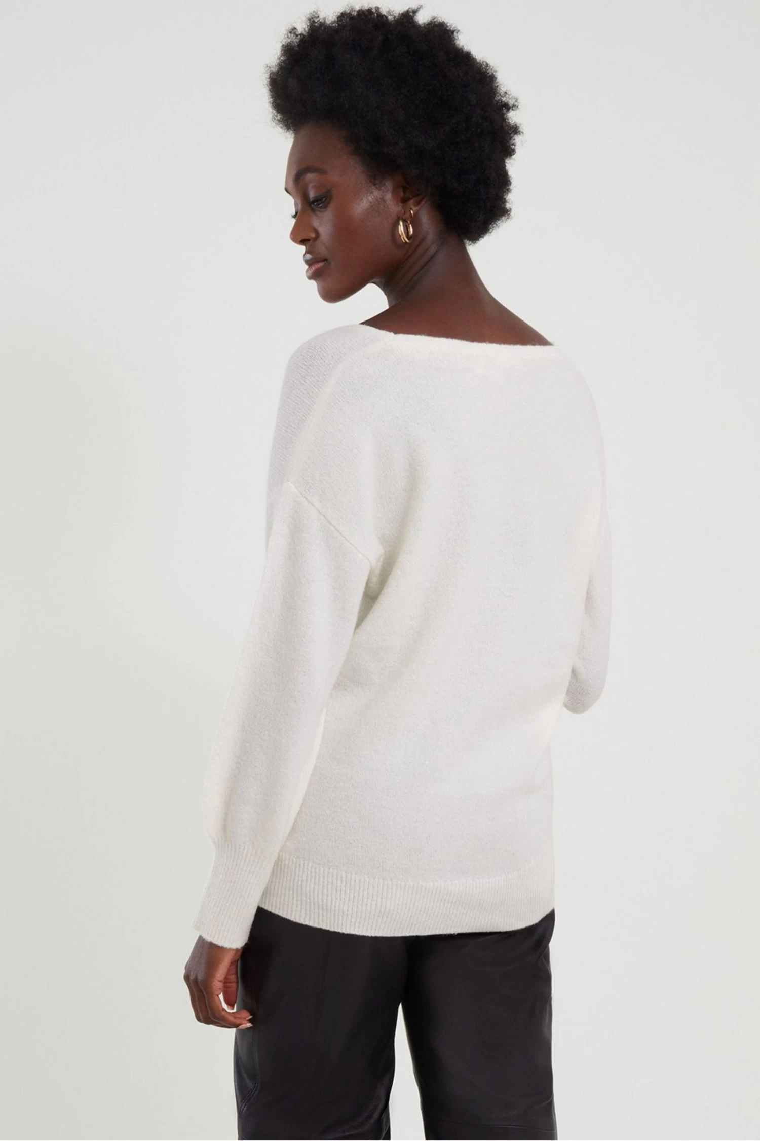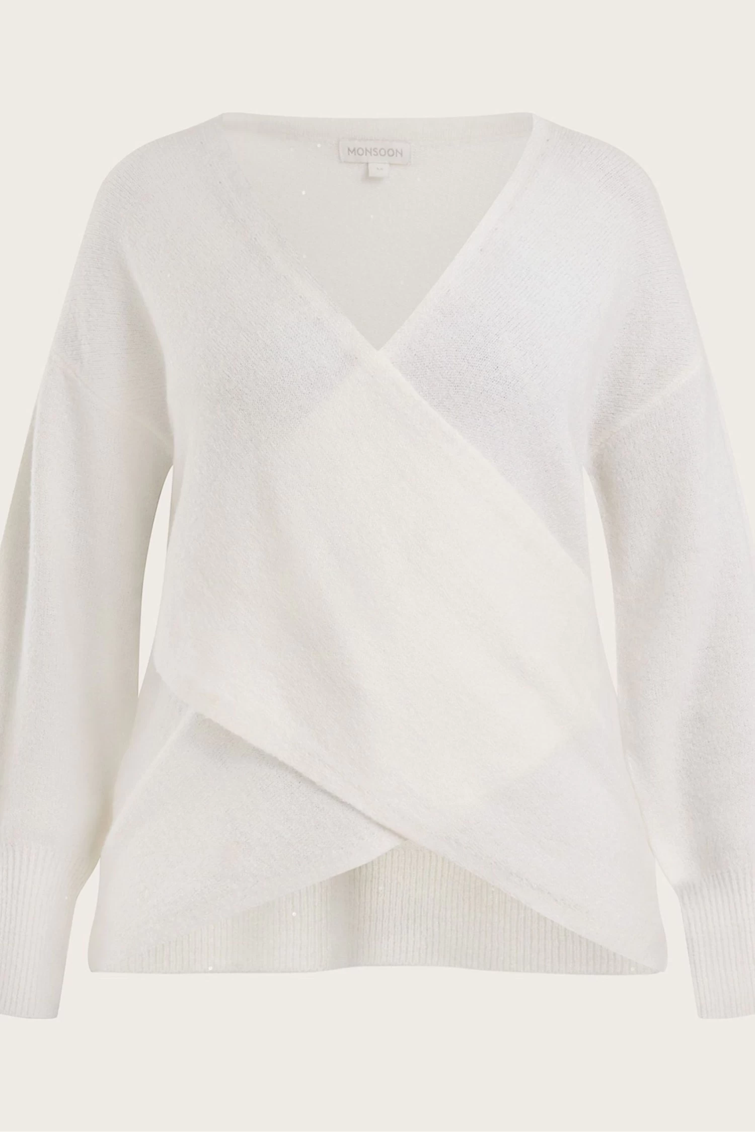 Suitably sequinned for the everyday, this jumper features wrap detailing to the front, with ribbed cuffs that create a flattering bishop sleeve finish. It’s crafted in soft ivory that’ll see you through all seasons. Simply style it with your favourite jeans and white trainers for a gentle and casual look.