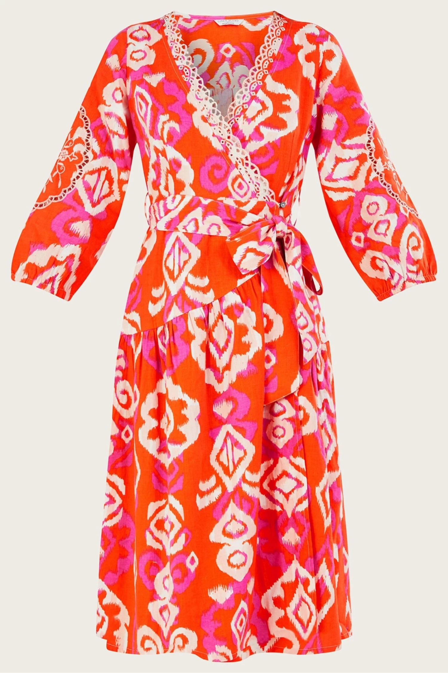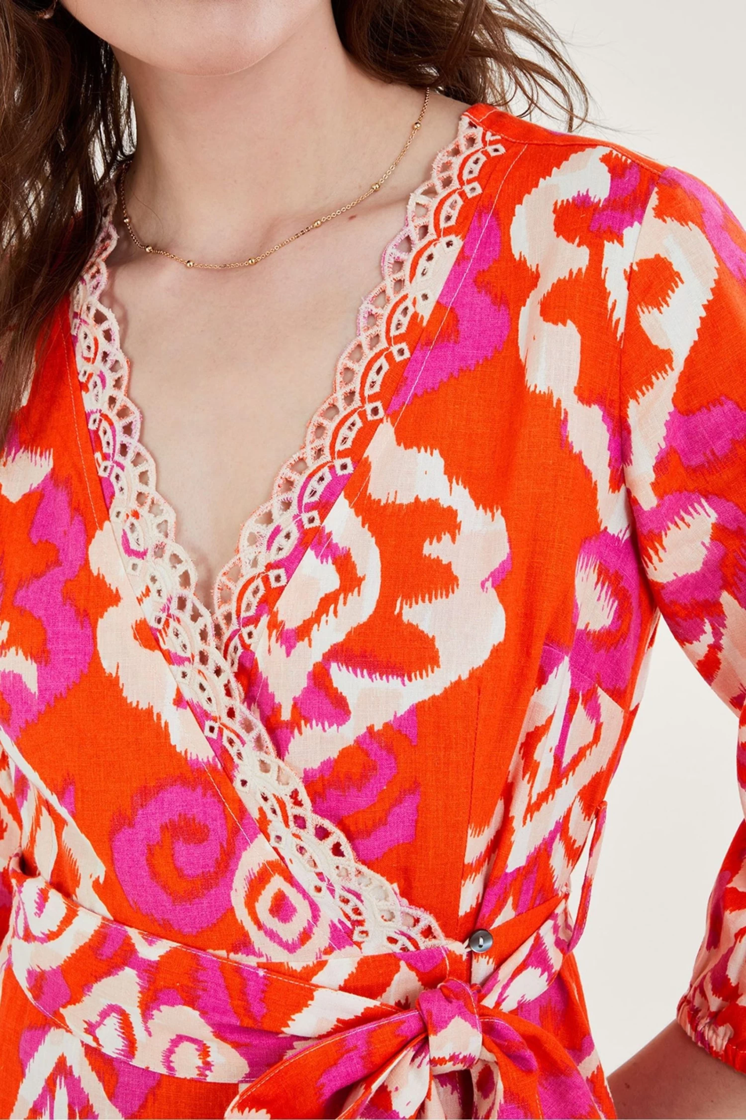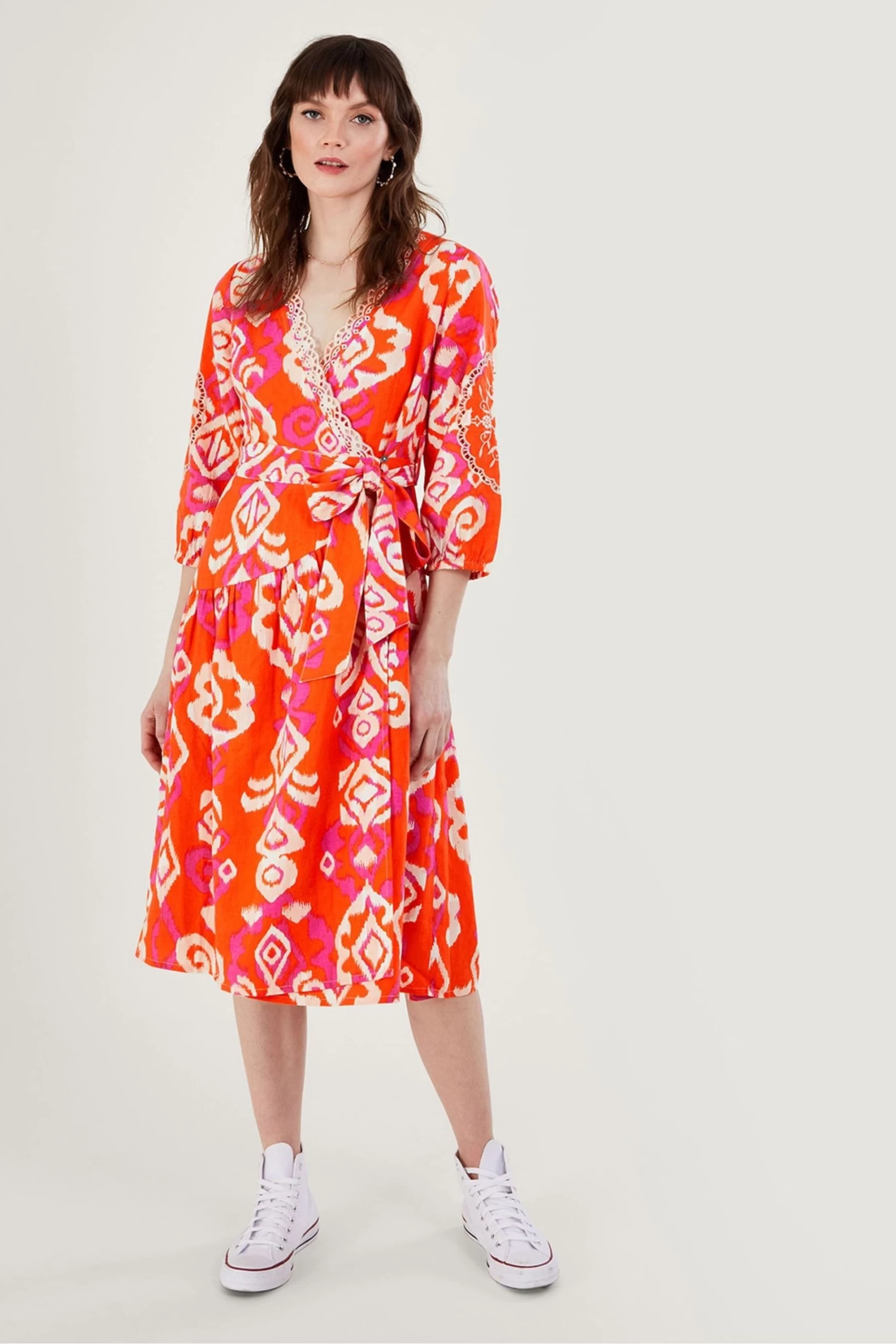 A summer wardrobe favourite: this dress is designed in a simple and flattering wrap silhouette, splashed in a vibrant orange and pink print. The v-neckline is embroidered with intricate lace, transitioning to the tie-waist belt before falling to a midi-length skirt. As part of the journey to make our clothes kinder to the world around us, this item was made using more sustainable raw materials, such as organic cotton, recycled polyester and viscose from responsibly grown forests.