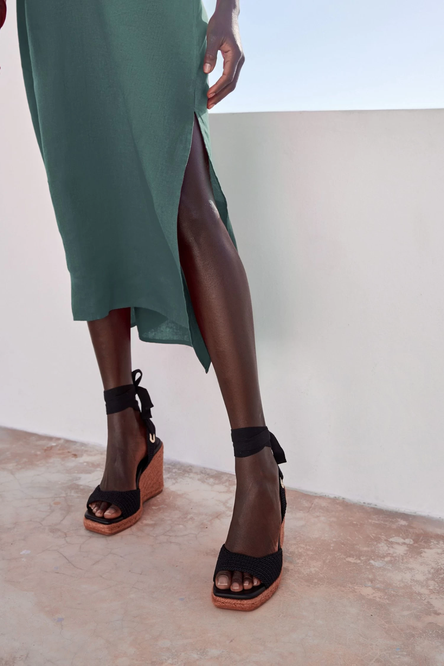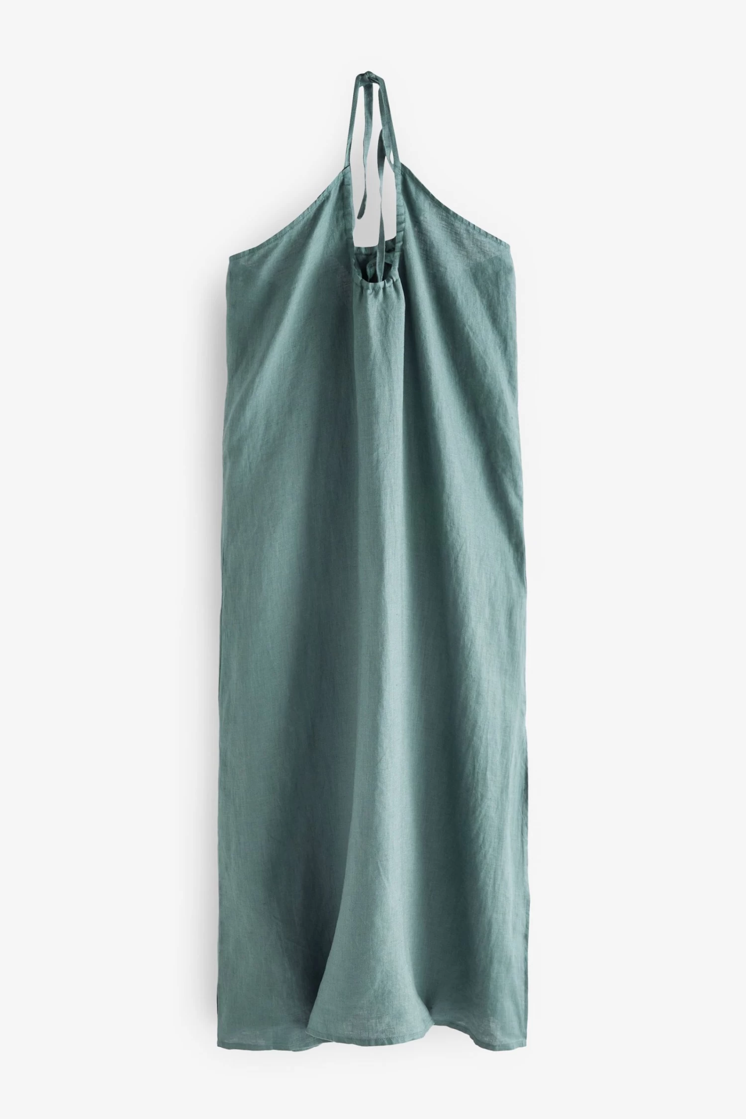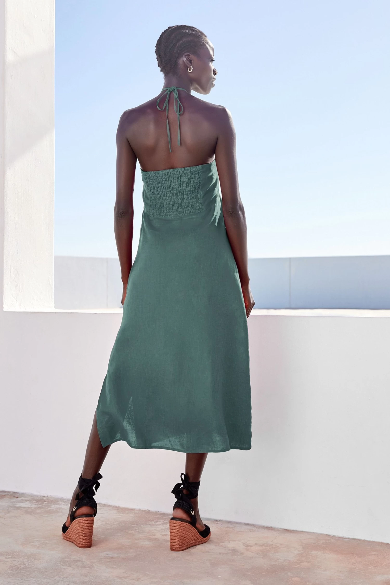 100% Linen. Midi length. Halter neck. Side slit. Ruched detail.