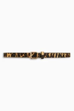 Our skinny belt is designed with faux pony hair and features a gold square buckle.
